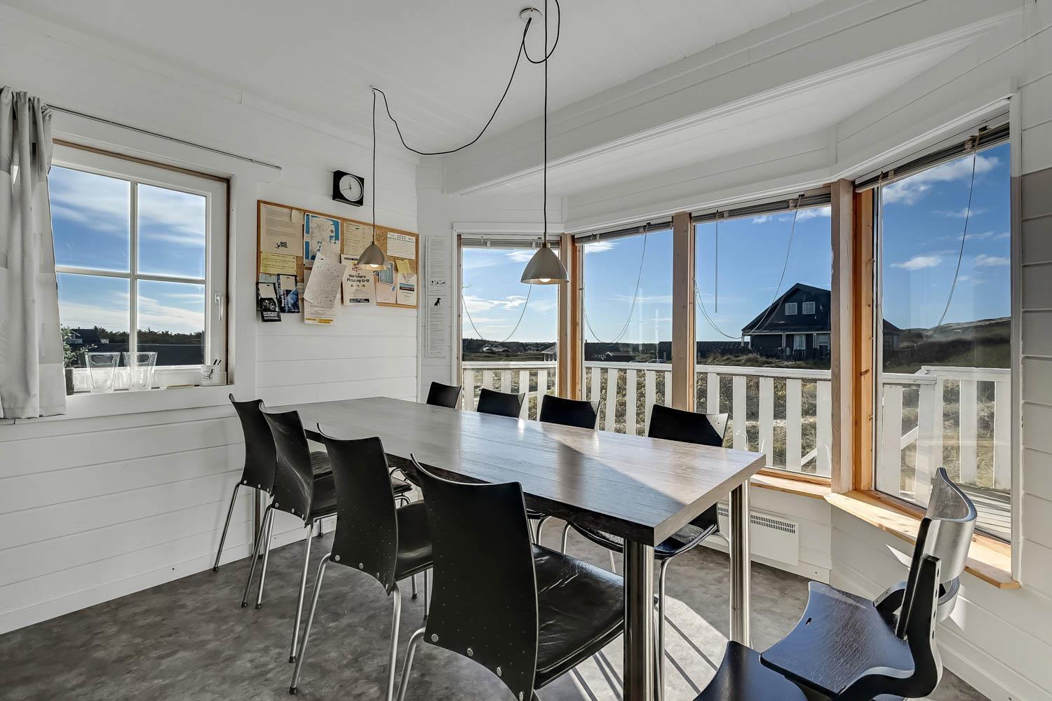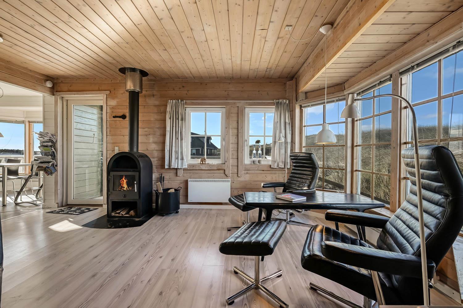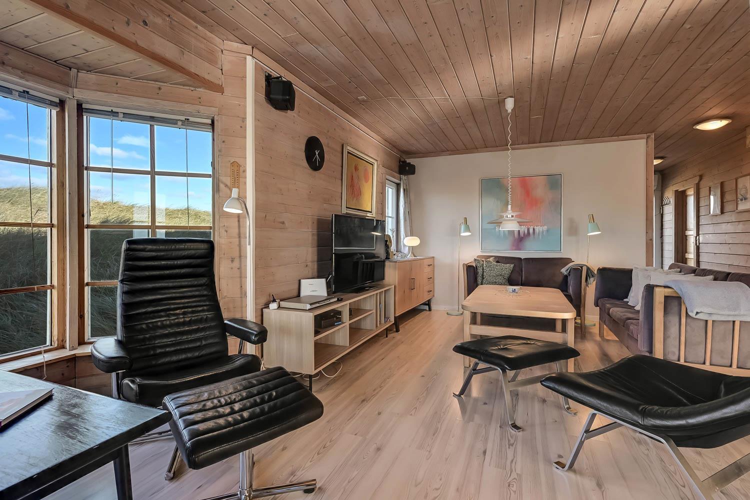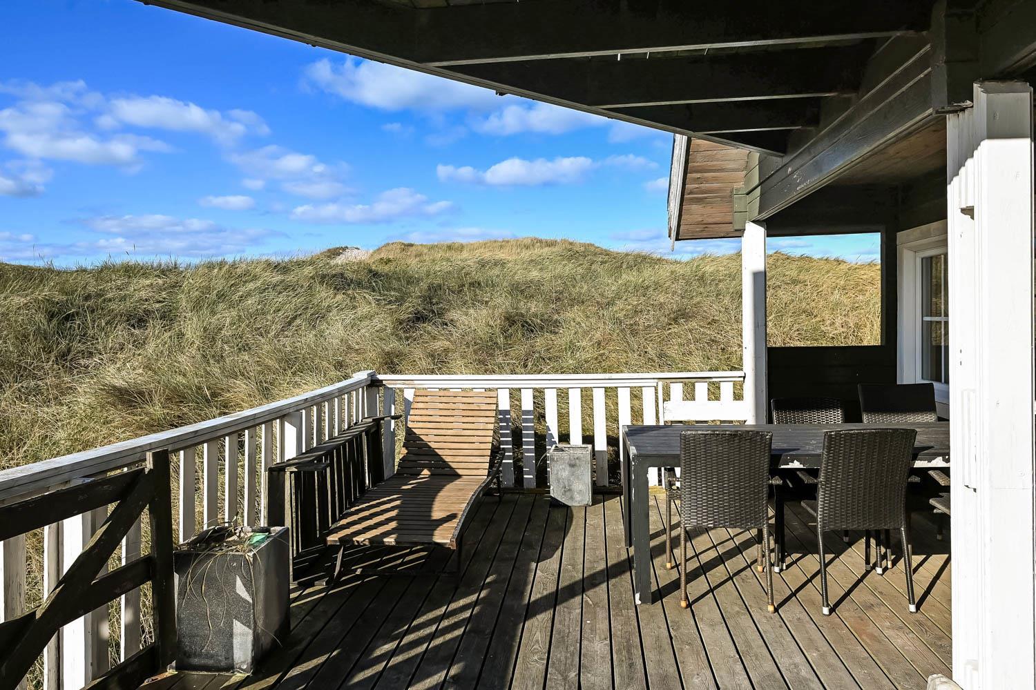 Huset er indrettet med charme og varme, og på første sal åbner udsigten sig over klitterne og det åbne landskab. Fra den sydvendte terrasse kan I nyde både havglimtet og de magiske solnedgange, som gør området så eftertragtet. Her er det oplagt at starte dagen med en kop kaffe i morgensolen eller afslutte aftenen med et glas vin, mens himlen farves gylden.