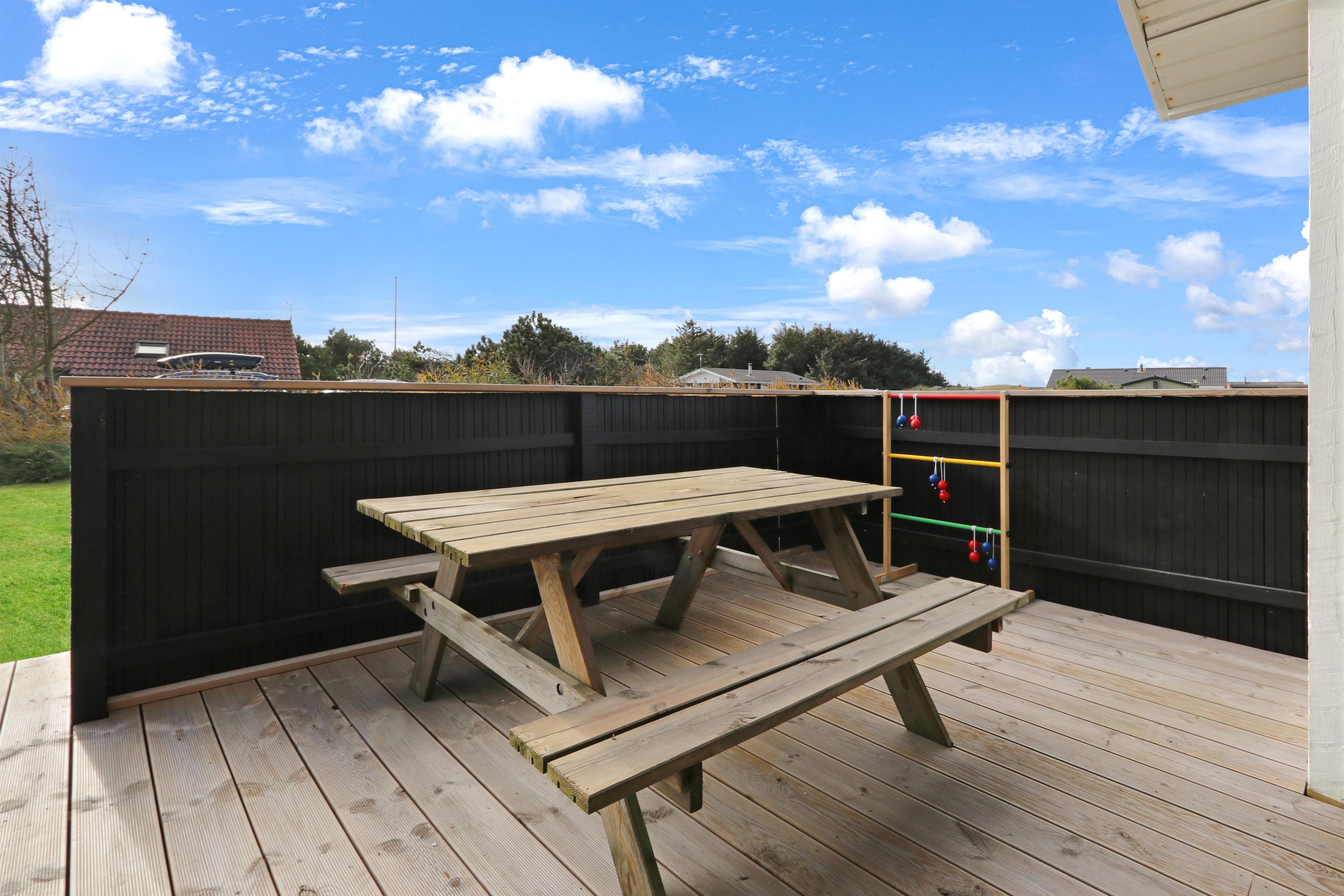 Delvis overdækket terrasse med diverse havemøbler, hvor man kan nyde solen og naturen. På grunden er der sandkasse med låg og gynger til de små.