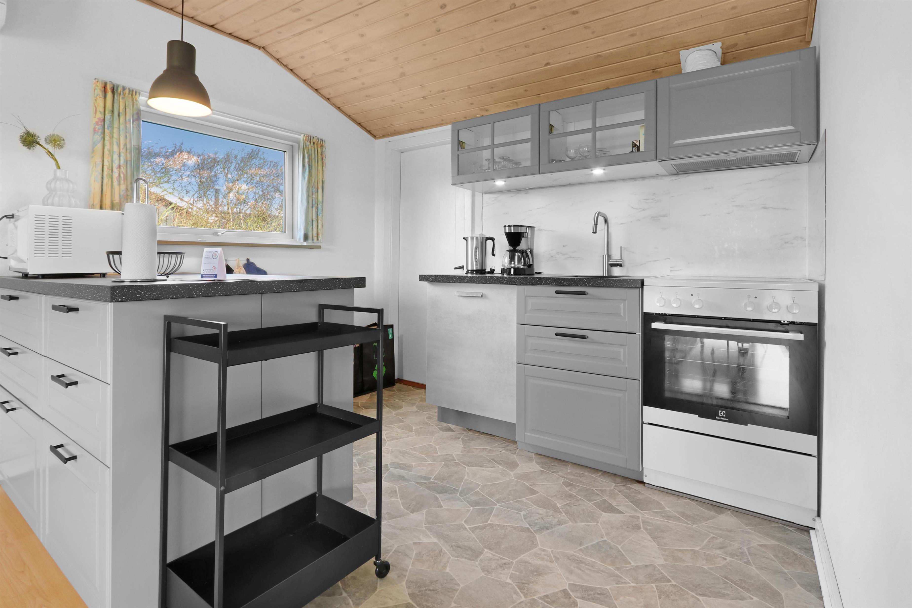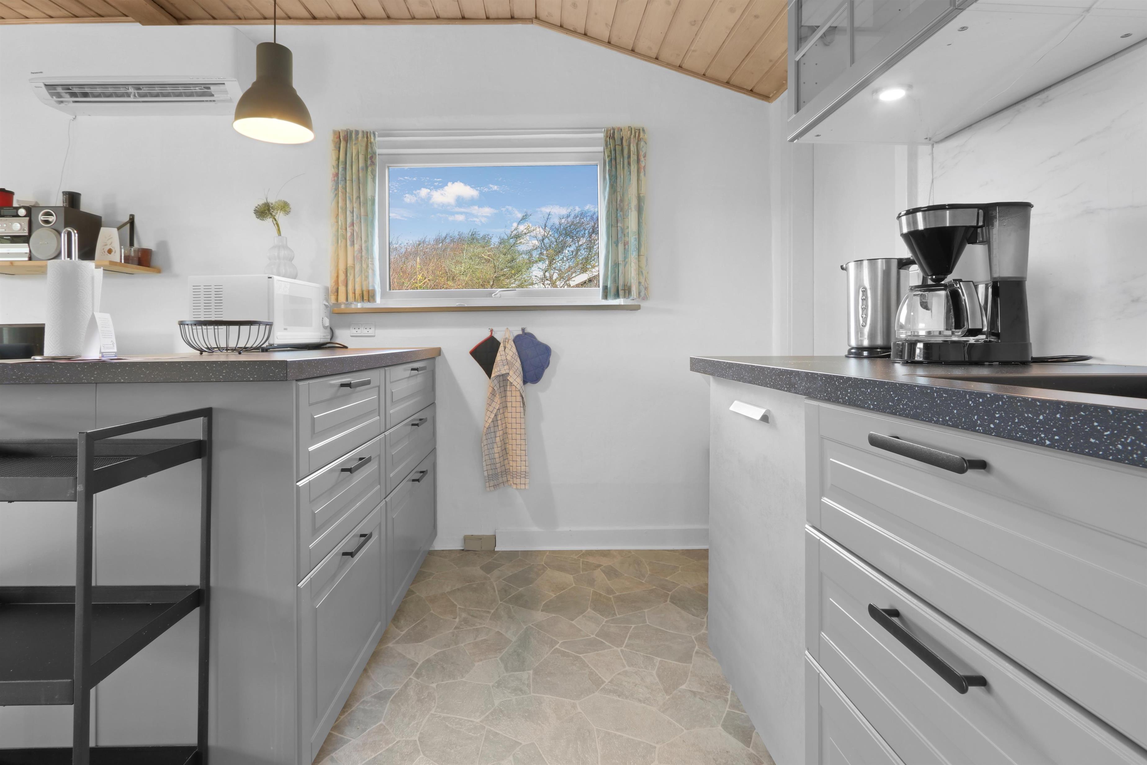 Der er to badeværelser: et med toilet, brusebad og direkte adgang til sauna, samt et med spabad – begge med opvarmede flisegulve. Køkkenet er veludstyret med elkedel, kaffemaskine, mikroovn, opvaskemaskine, køleskab med fryser og komfur. Køkkenet ligger i åben forbindelse med opholdsstuen, hvor der findes 2- og 3-personers sofaer, to lænestole, sofabord samt spiseafdeling med 8 stole og glasvitrine.