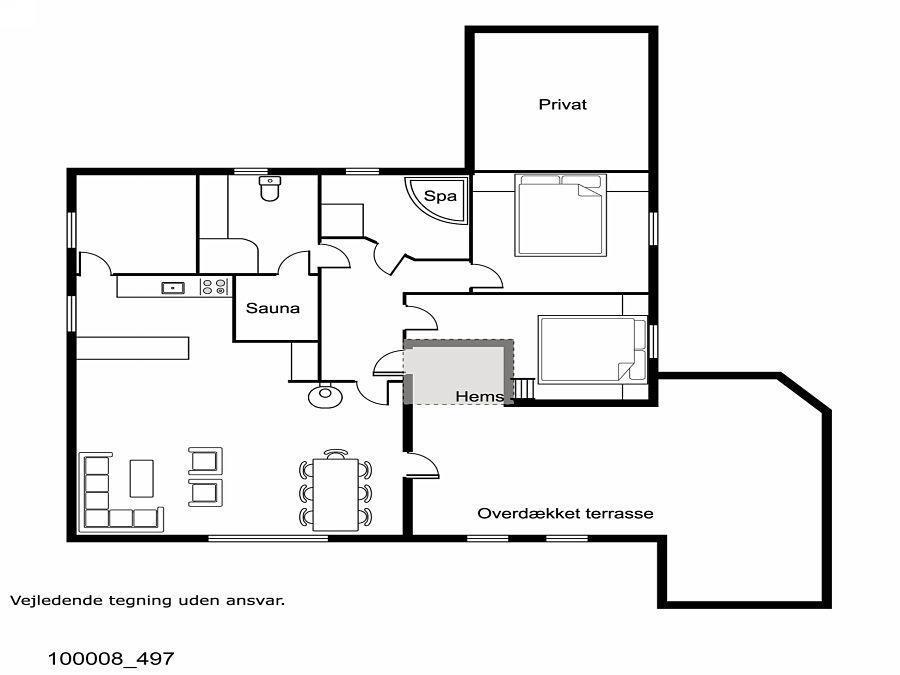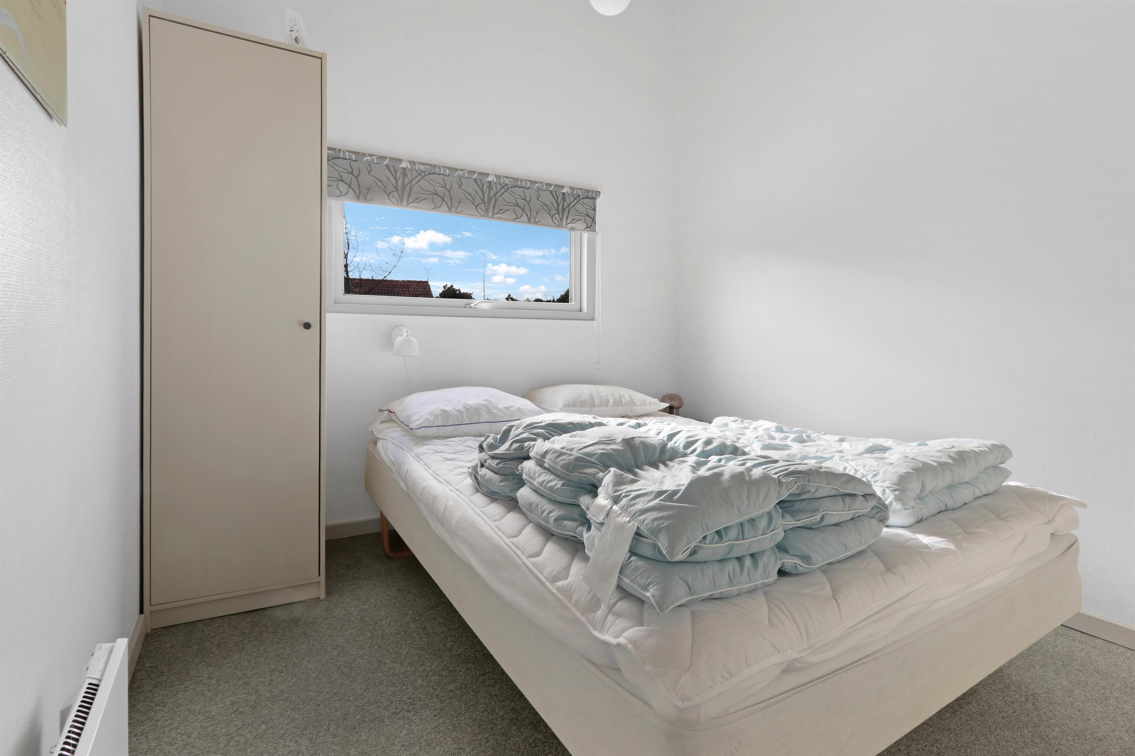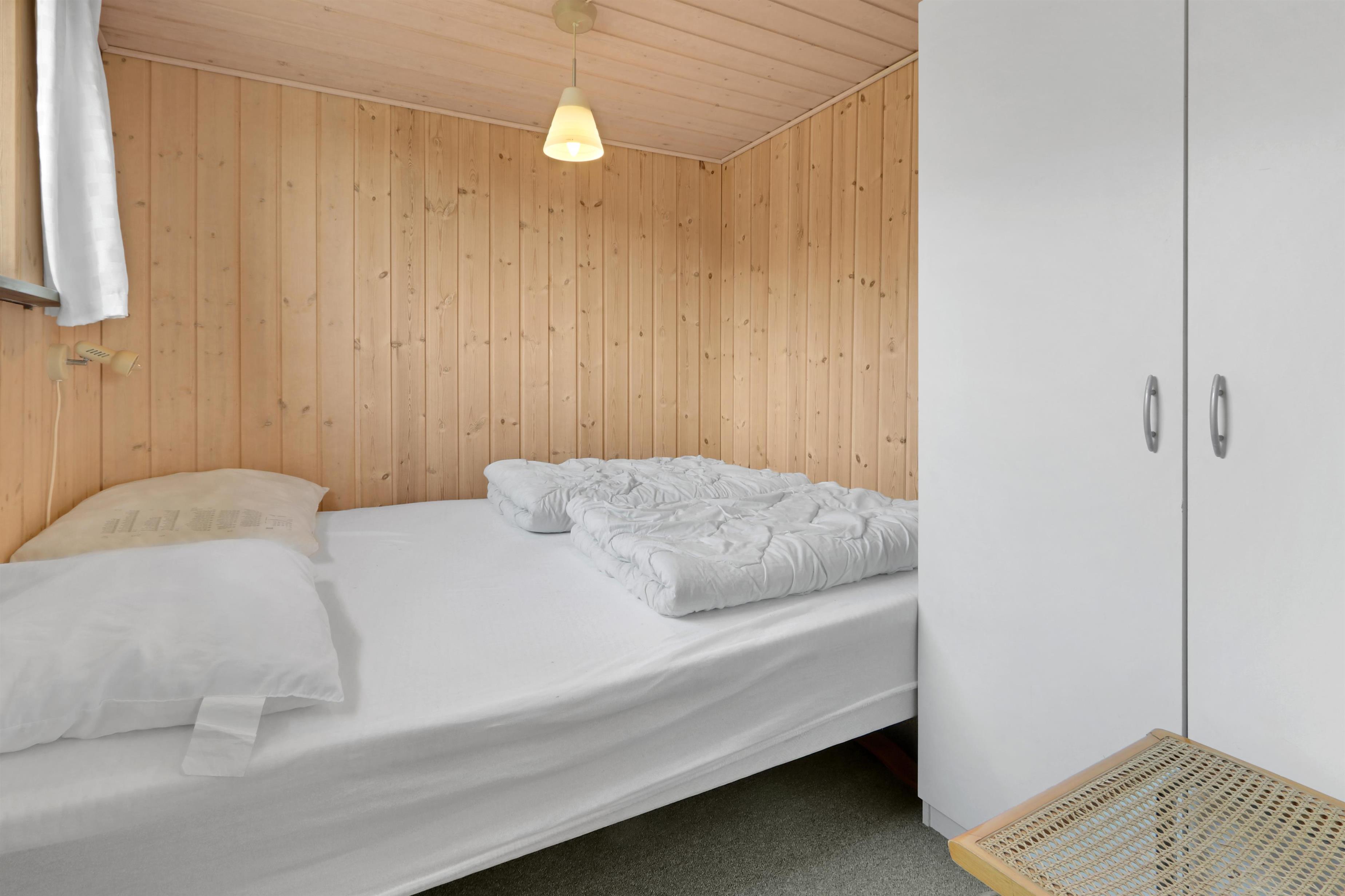 Fra stuen er der adgang til en delvis overdækket terrasse med diverse havemøbler, hvor man kan nyde solen og naturen. Huset har tre soveværelser med dobbeltsenge, og i ét af værelserne findes en hems med to ekstra senge, hvilket gør huset velegnet til både familier og grupper.