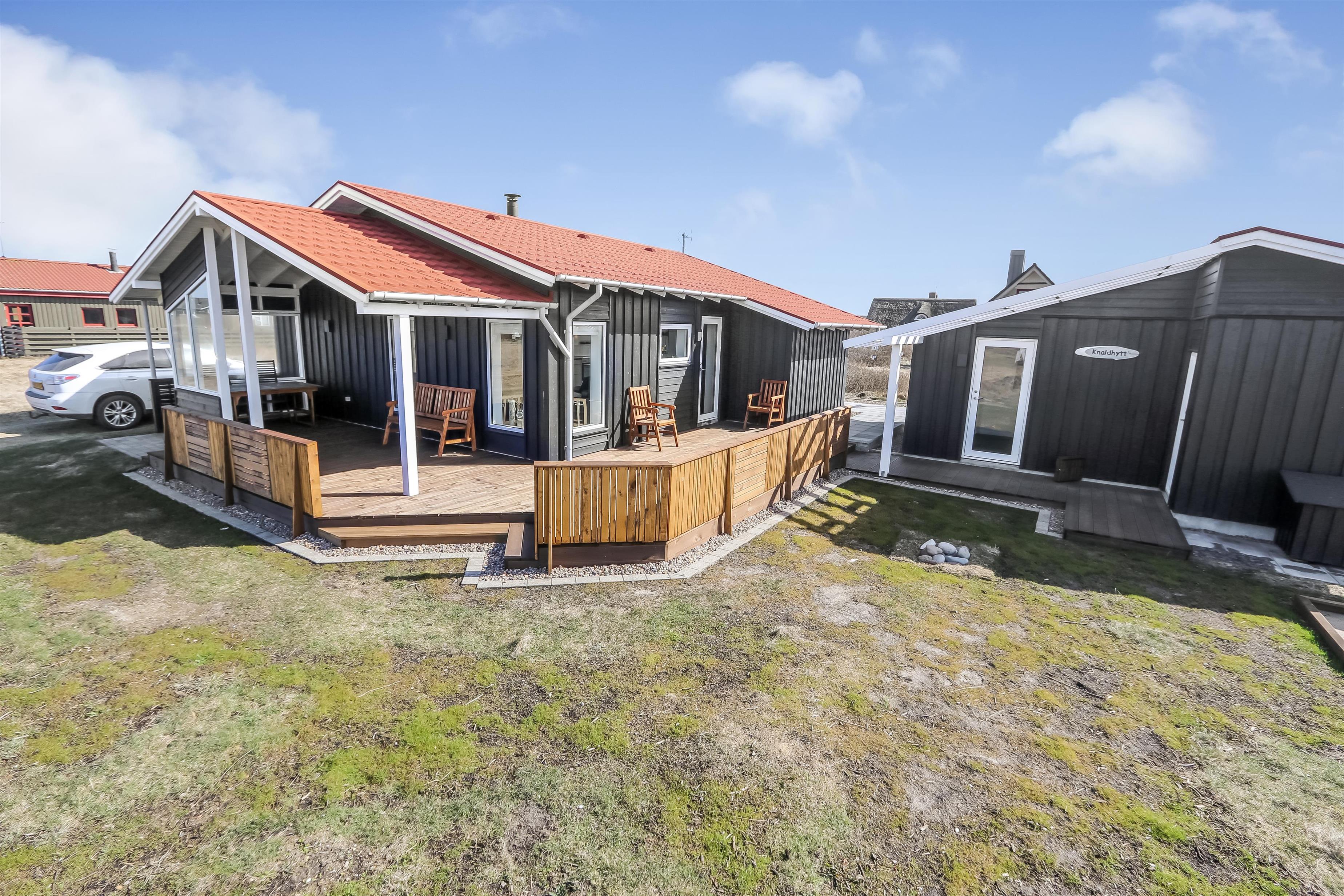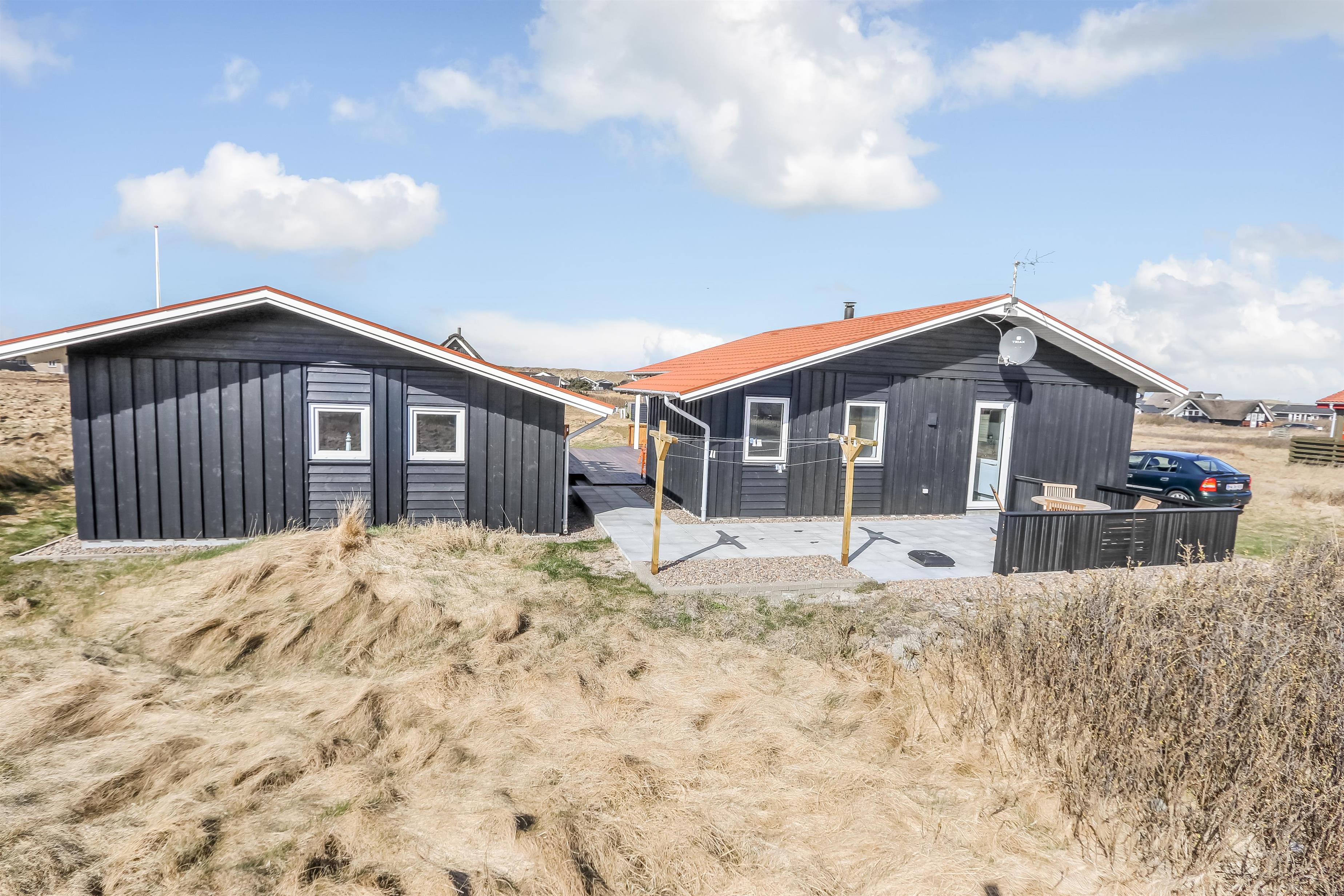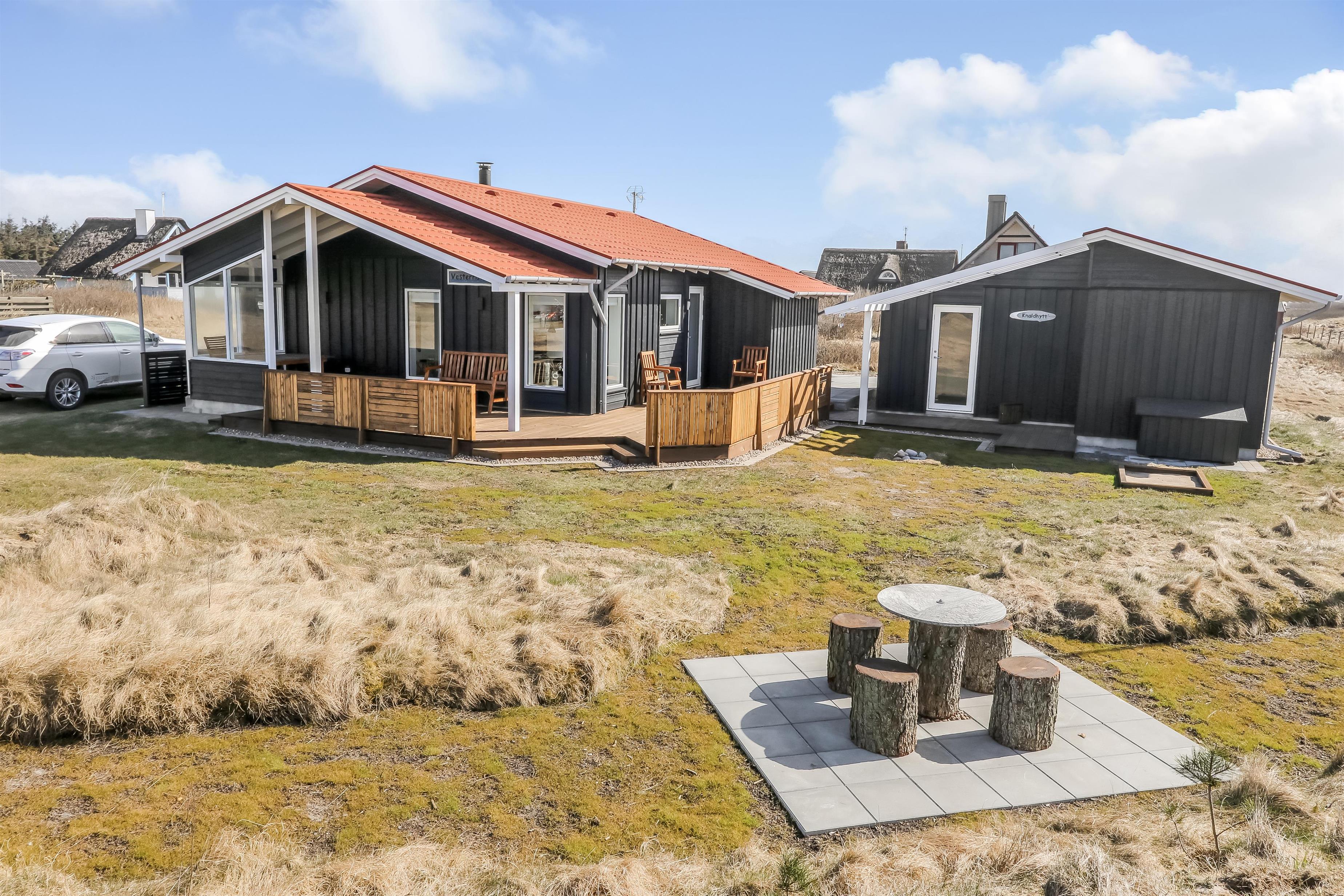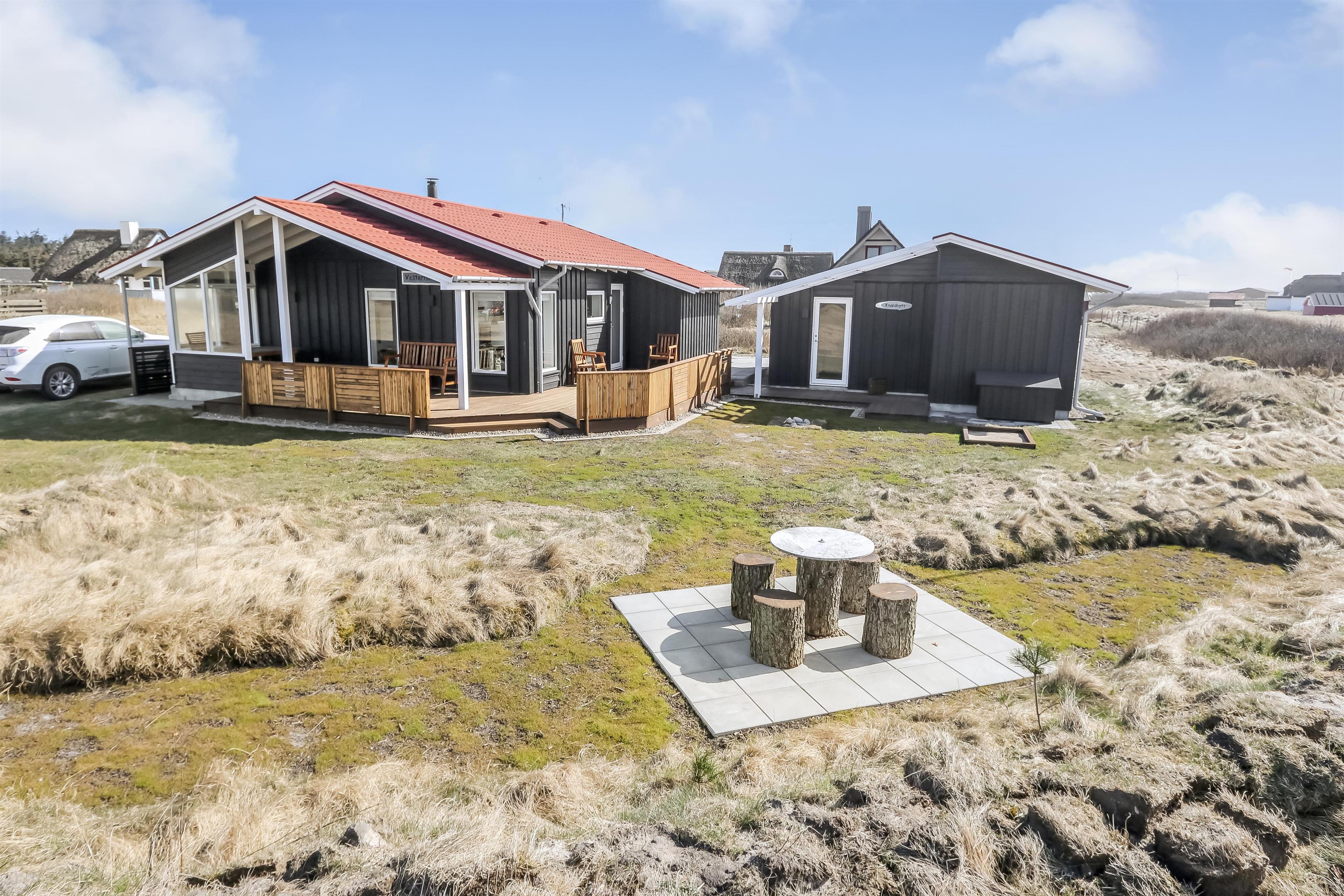 Fra stuen er er udgang til et dejligt terrasseanlæg giver unikke muligheder for en plads i solen hele dagen og der er masser af havemøbler. Der er ligeledes liggestole og grill, som kan flyttes efter behov samt et hyggeligt fast bord med 4 stubbe som siddeplads. Der er opdat kraftstik ved huset - som er pefket til opladning af hybrid- eller el-bil. Sandkasse til de mindste. Terrasseanlægget byder både åbne terrasser samt delvis overdækket terrasse med læ. Et helt fantastisk gennemført hus, som giver rammerne for en fantastisk ferie ved Vesterhavet der hver dag byder på nye maleriske oplevelse, der invitere til en frisk gå- eller løbetur. Eller hvad med en lille gåtur på ca. 15 – 20 min op til områdets lille købmand, som i sæsonen har åbent og byder på frisk morgenbrød, og hvor de daglige indkøb også kan klares. Så hvad enten du er til aktiv ferie eller total afslapning, danner dette flotte feriehus den perfekte ramme både hvad angår hus, beliggenhed og omgivelser.