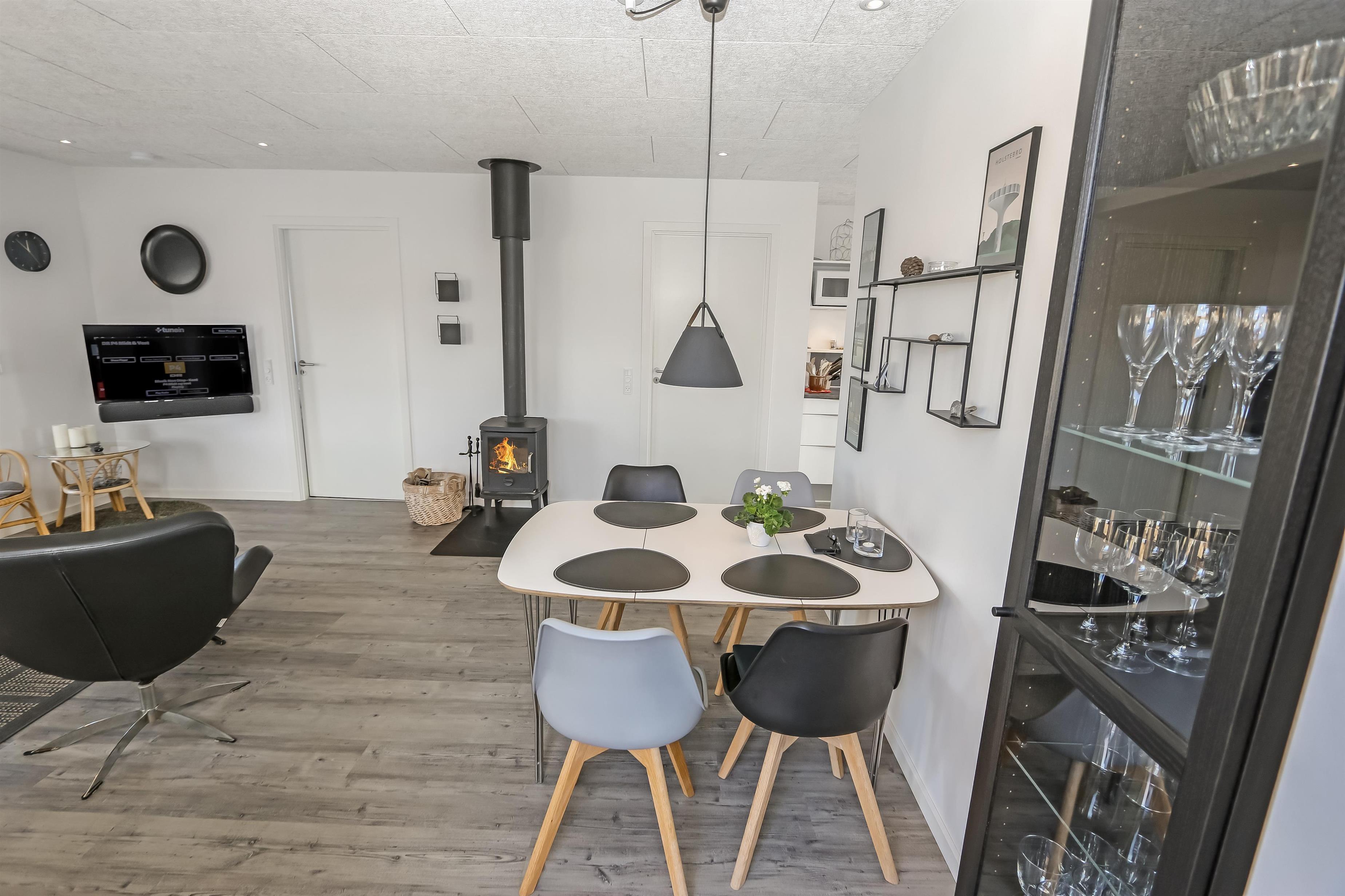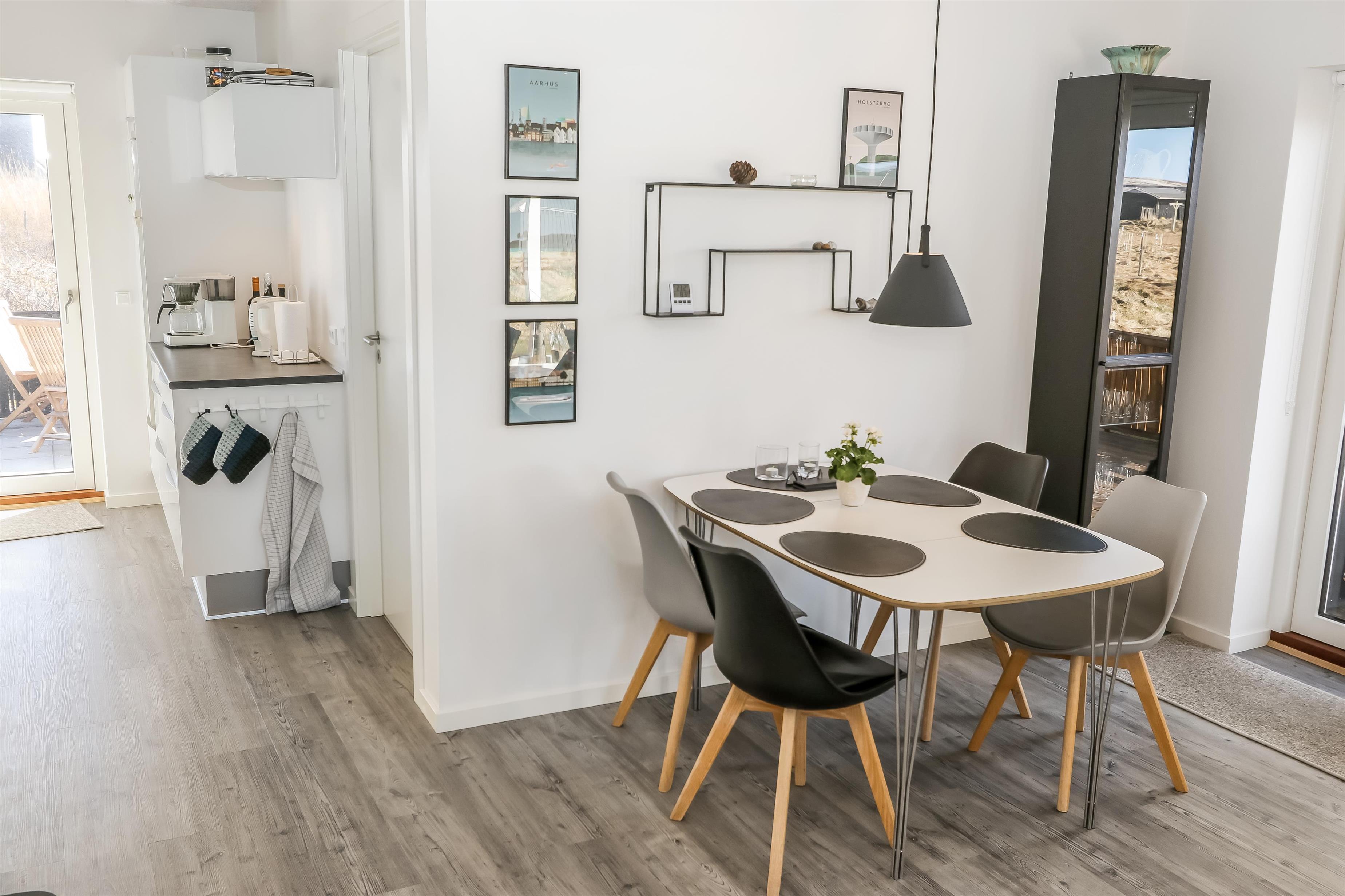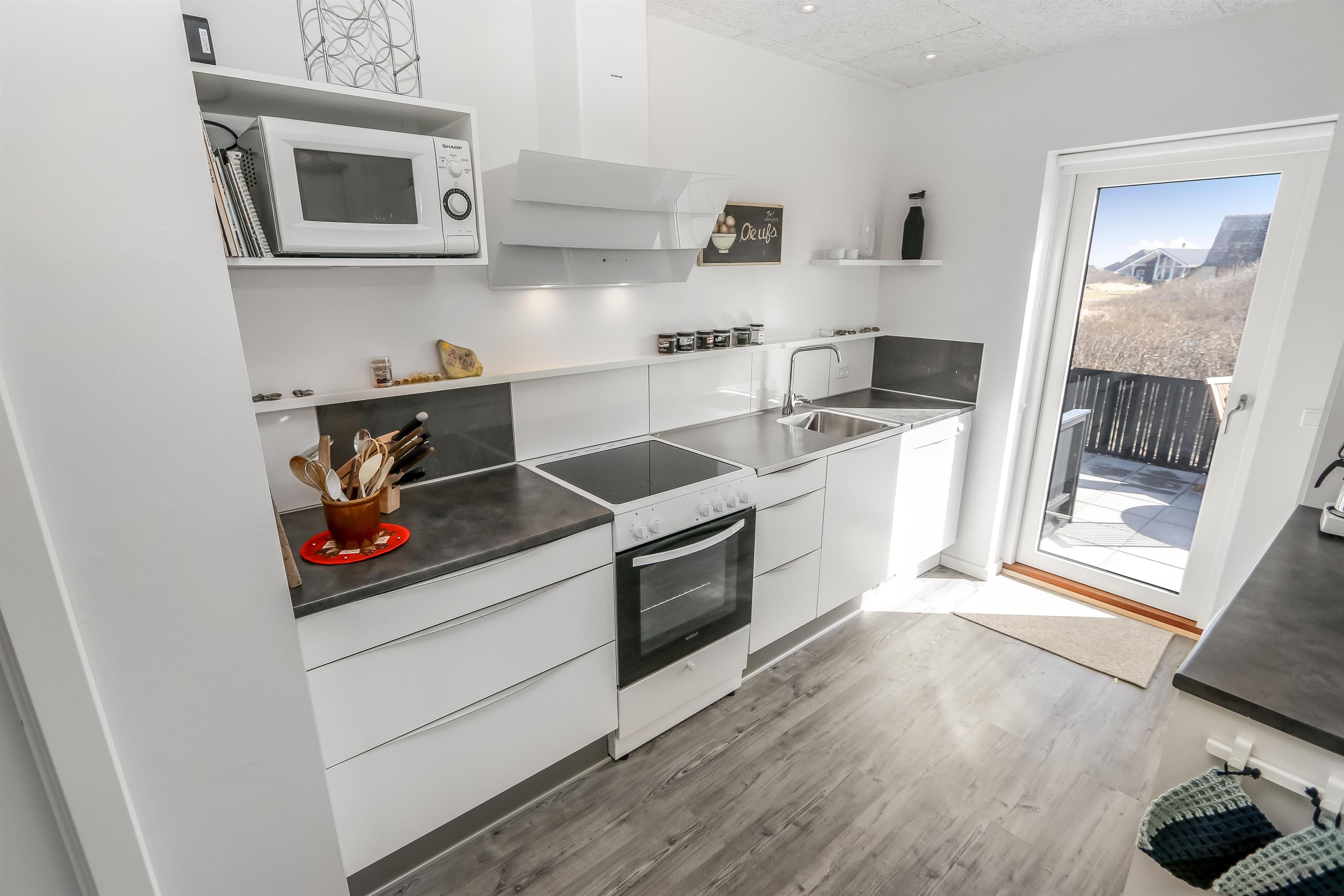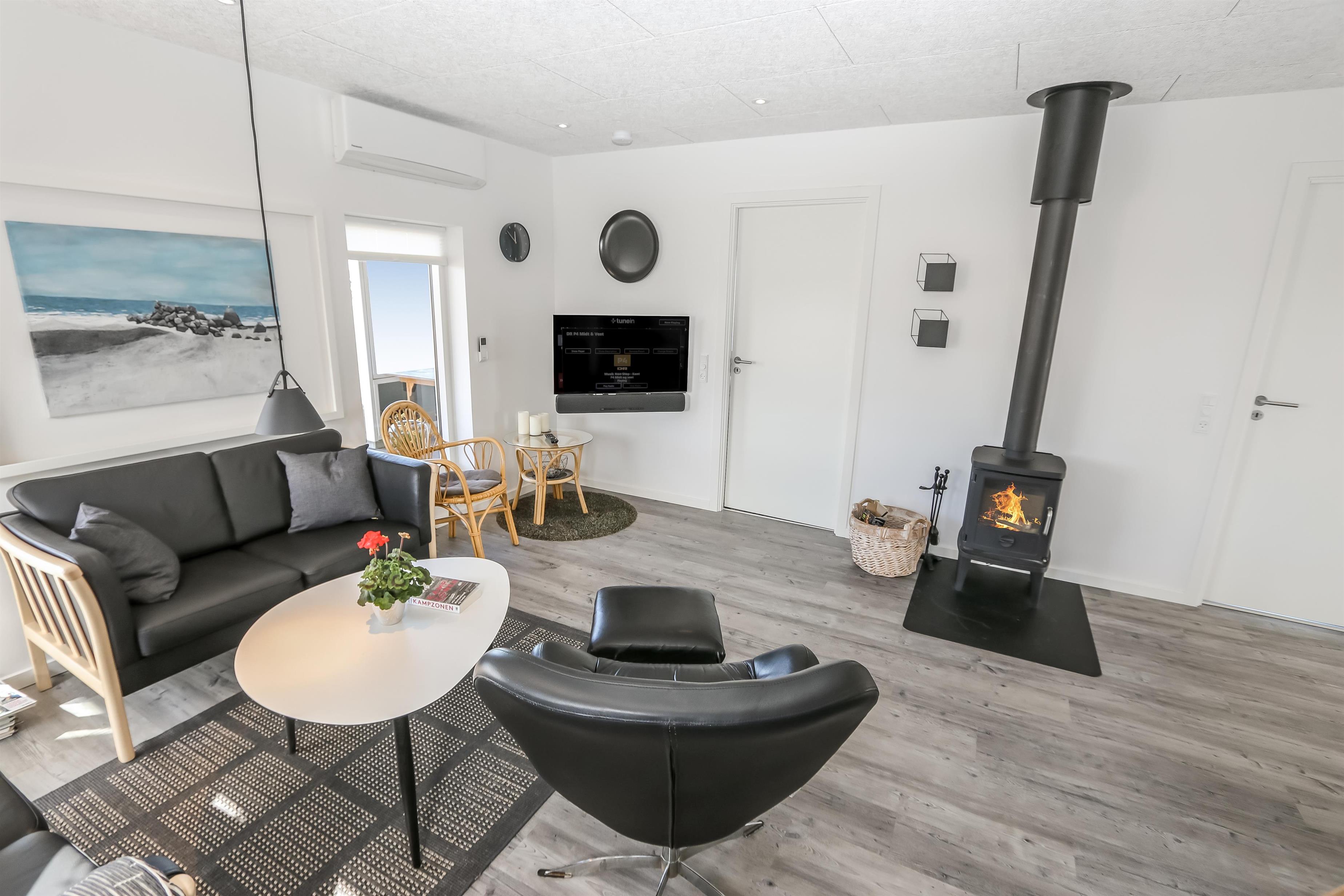 Fra stuen er er udgang til et dejligt terrasseanlæg giver unikke muligheder for en plads i solen hele dagen og der er masser af havemøbler. Der er ligeledes liggestole og grill, som kan flyttes efter behov samt et hyggeligt fast bord med 4 stubbe som siddeplads. Der er opdat kraftstik ved huset - som er pefket til opladning af hybrid- eller el-bil. Sandkasse til de mindste. Terrasseanlægget byder både åbne terrasser samt delvis overdækket terrasse med læ. Et helt fantastisk gennemført hus, som giver rammerne for en fantastisk ferie ved Vesterhavet der hver dag byder på nye maleriske oplevelse, der invitere til en frisk gå- eller løbetur. Eller hvad med en lille gåtur på ca. 15 – 20 min op til områdets lille købmand, som i sæsonen har åbent og byder på frisk morgenbrød, og hvor de daglige indkøb også kan klares. Så hvad enten du er til aktiv ferie eller total afslapning, danner dette flotte feriehus den perfekte ramme både hvad angår hus, beliggenhed og omgivelser.