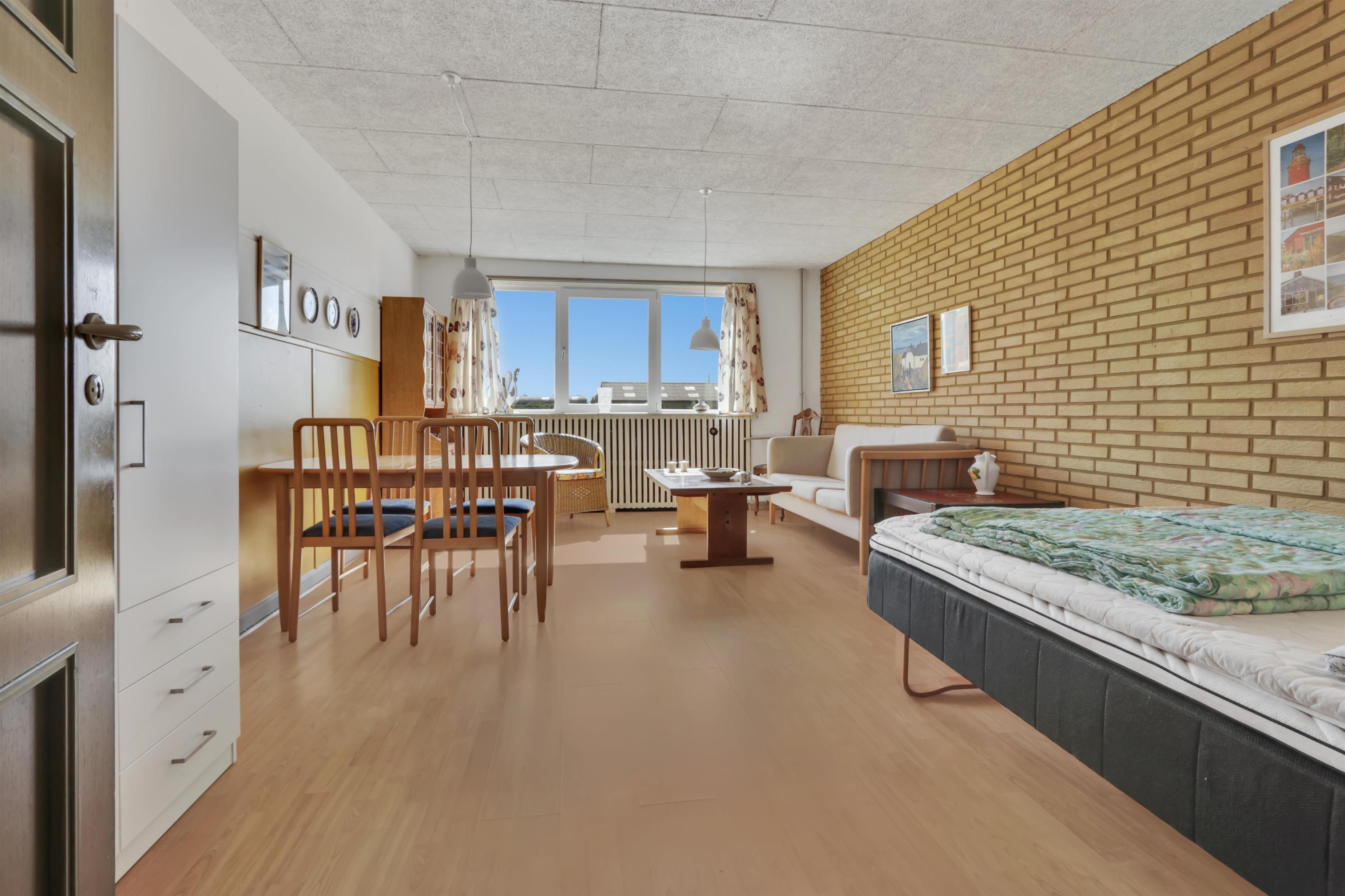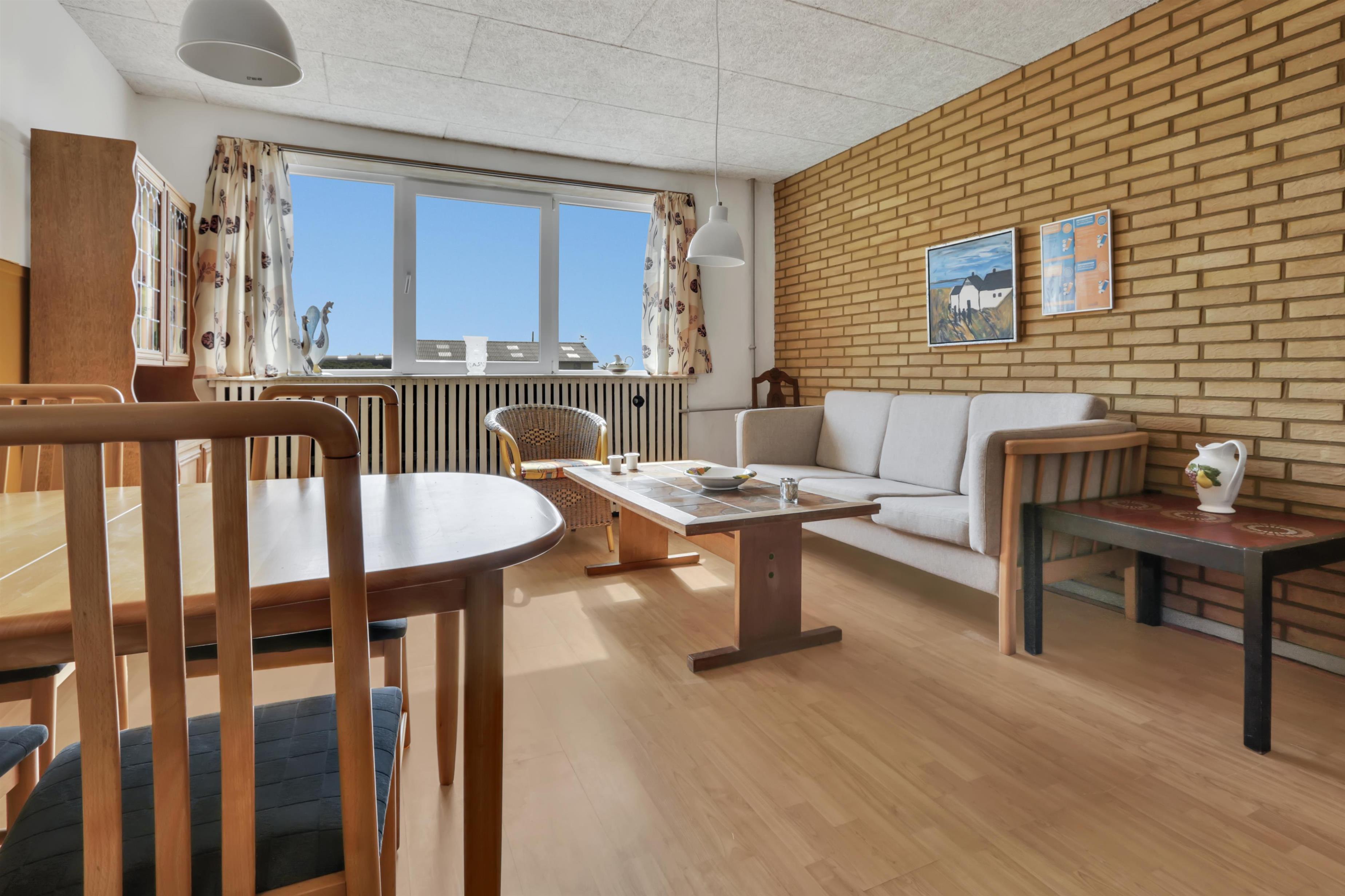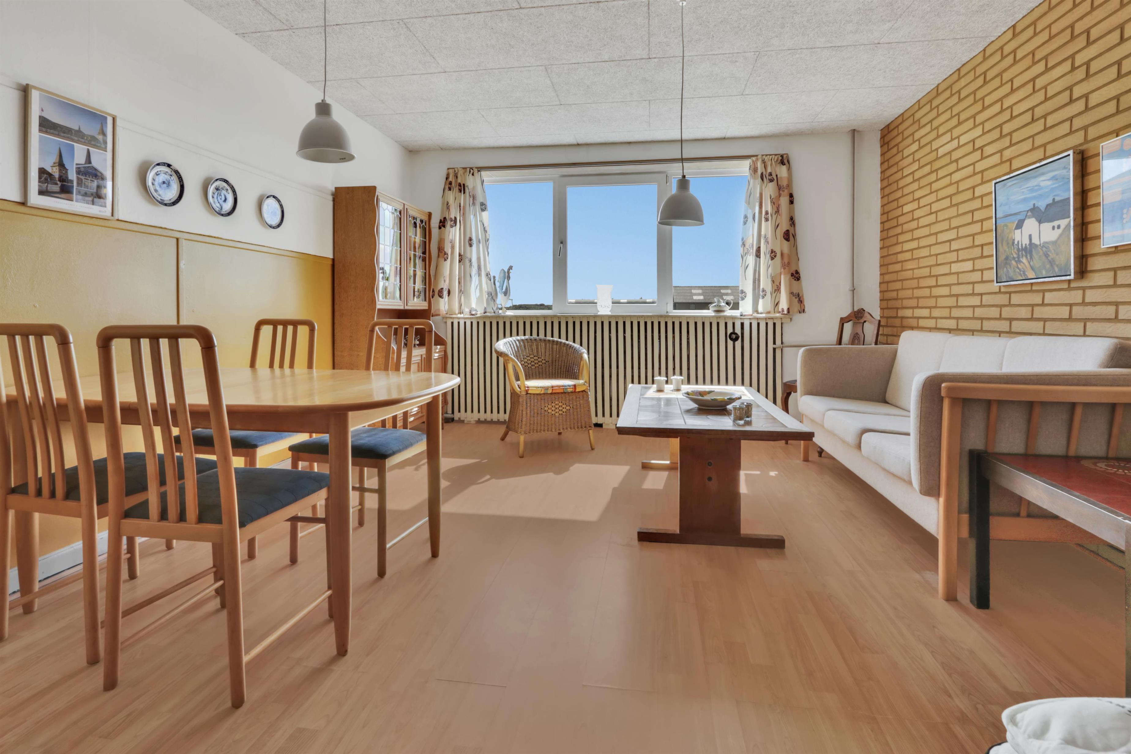 Praktisk og enkelt indrettet lejlighed på 43m2 til max. 4 personer med ældre møblering. Lejligheden har fælles forgang med nr. 217 men ellers er de fuldstændig adskilte. Beliggende i et kompleks med flere lejligheder på en 13000 m2 naturgrund kun ca. 300 m fra vesterhavet. Der er p-plads ved lejligheden.