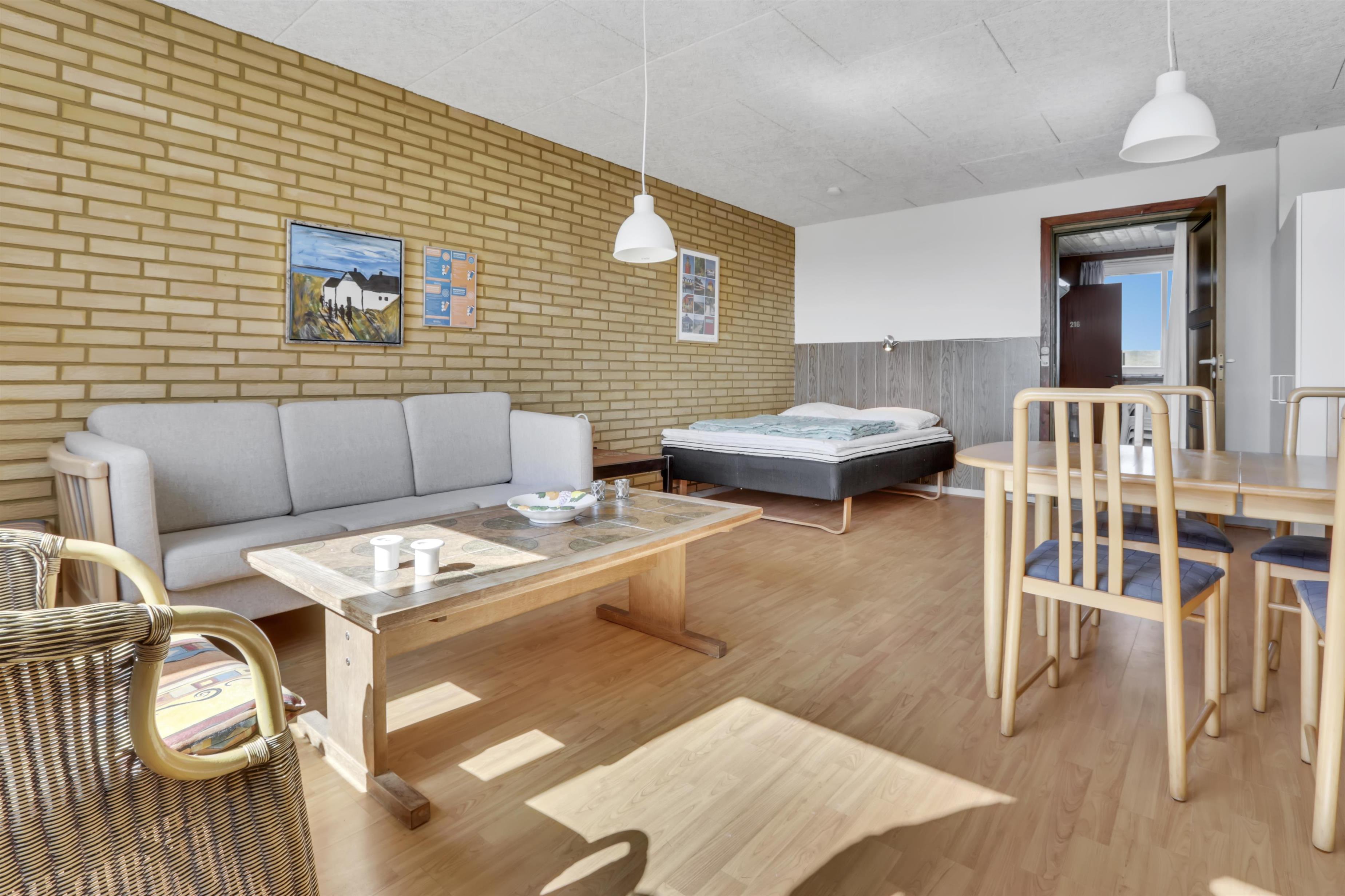 Praktisk og enkelt indrettet lejlighed på 43m2 til max. 4 personer med ældre møblering. Lejligheden har fælles forgang med nr. 217 men ellers er de fuldstændig adskilte. Beliggende i et kompleks med flere lejligheder på en 13000 m2 naturgrund kun ca. 300 m fra vesterhavet. Der er p-plads ved lejligheden.Lejligheden er enkelt og praktisk indrettet og et godt tilbud til de der vil bo primitivt og samtidig tæt ved havet Kombineret opholds-, spise - og soverum med 2 senge. 1 rum med køkkenafdeling med 2 el-kogeplader, el-kedel og brødrister og 2 køjer. Soveafdelingen kan deles fra køkkenafdelingen med et forhæng. Nyt badeværelse. Delvis overdækket terrasse med havemøbler og liggestole. El, varme og vand koster 90,- kr. pr. person pr. uge 1 husdyr er tilladt.