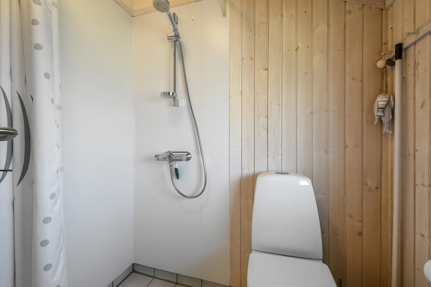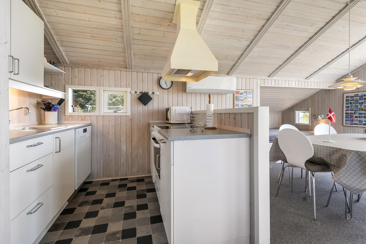 Træhuset er godt indrettet på 60 m2, med 2 soverum, køkken, badeværelse samt stue med alkove. Der er højt til loftet, hvilket får huset til at virke "luftig". Fint indrettet i lyse farver med polstret møbler. Smart-TV med danske og tyske programmer samt mulighed for streaming af TV / radio / Apps. Der er installeret varmepumpe som også har indbygget aircondition og som minimere strømforbruget. Den hyggelige spisekrog indeholder pænt spisebord og lyse stole. Funktionelt køkken med opvaskemaskine, keramisk komfur, emhætte, køleskab med fryseboks, og mikrobølgeovn. Pænt badeværelse med toilet, håndvask, bruseniche, vaskemaskine og klinkegulv med gulvvarme.