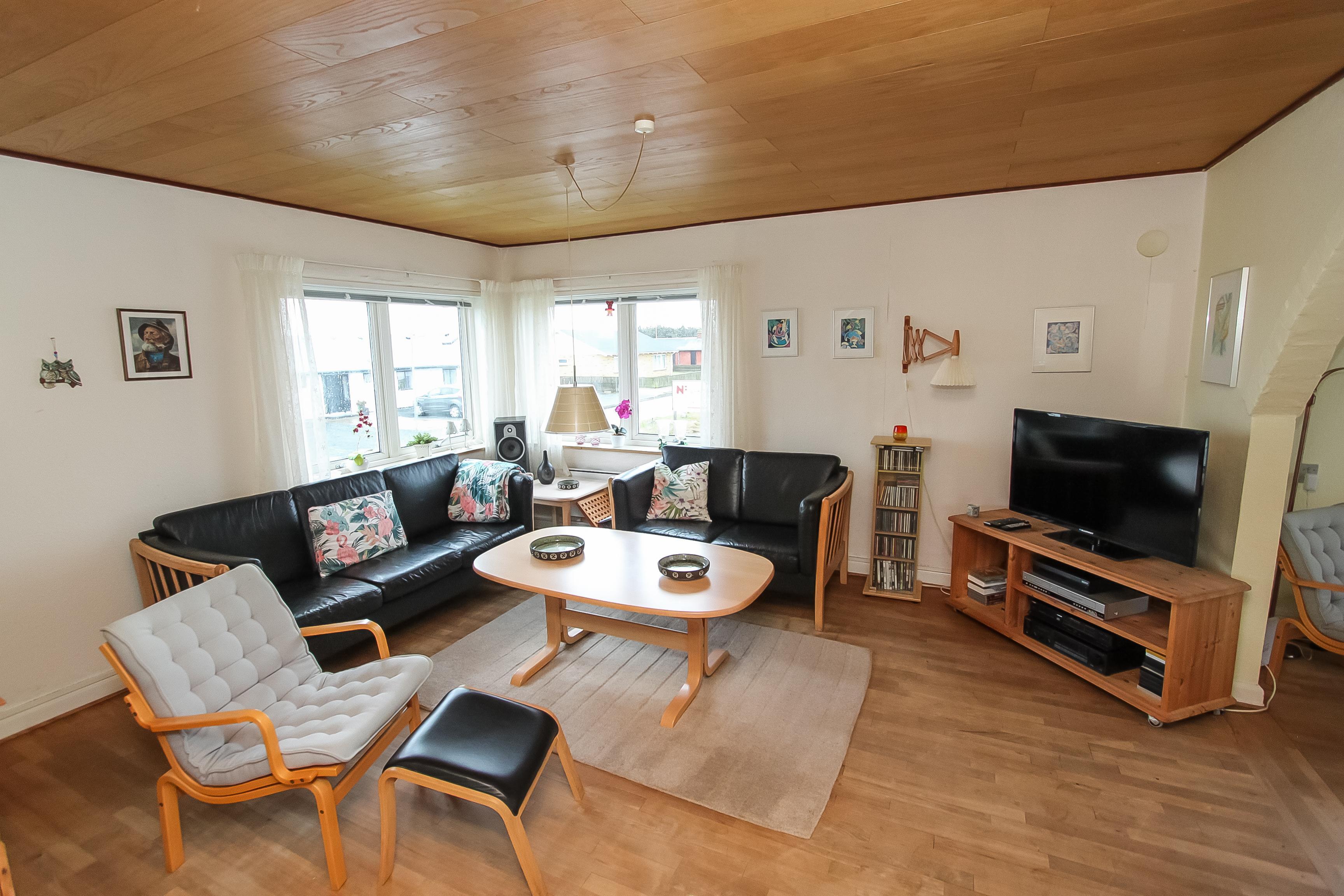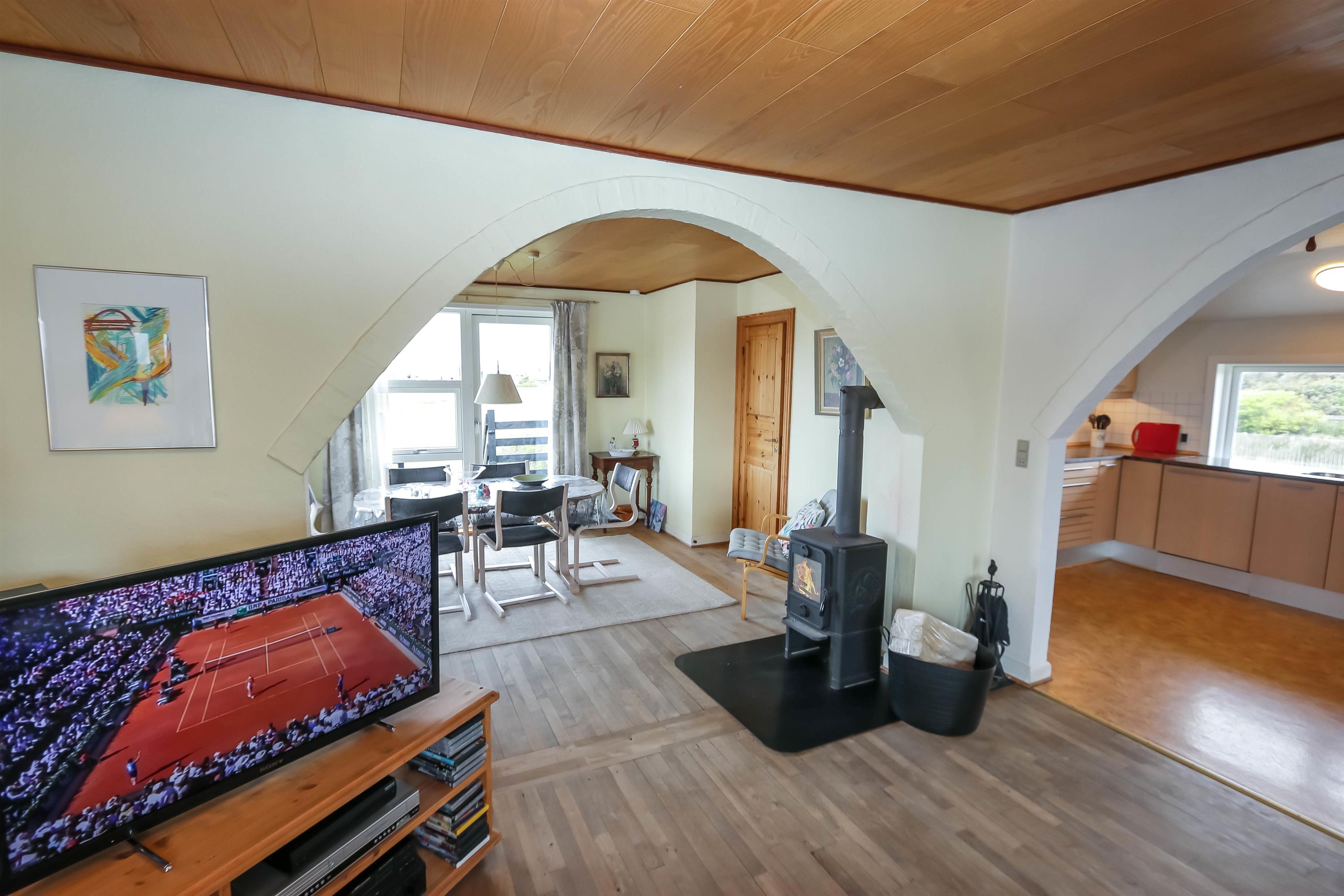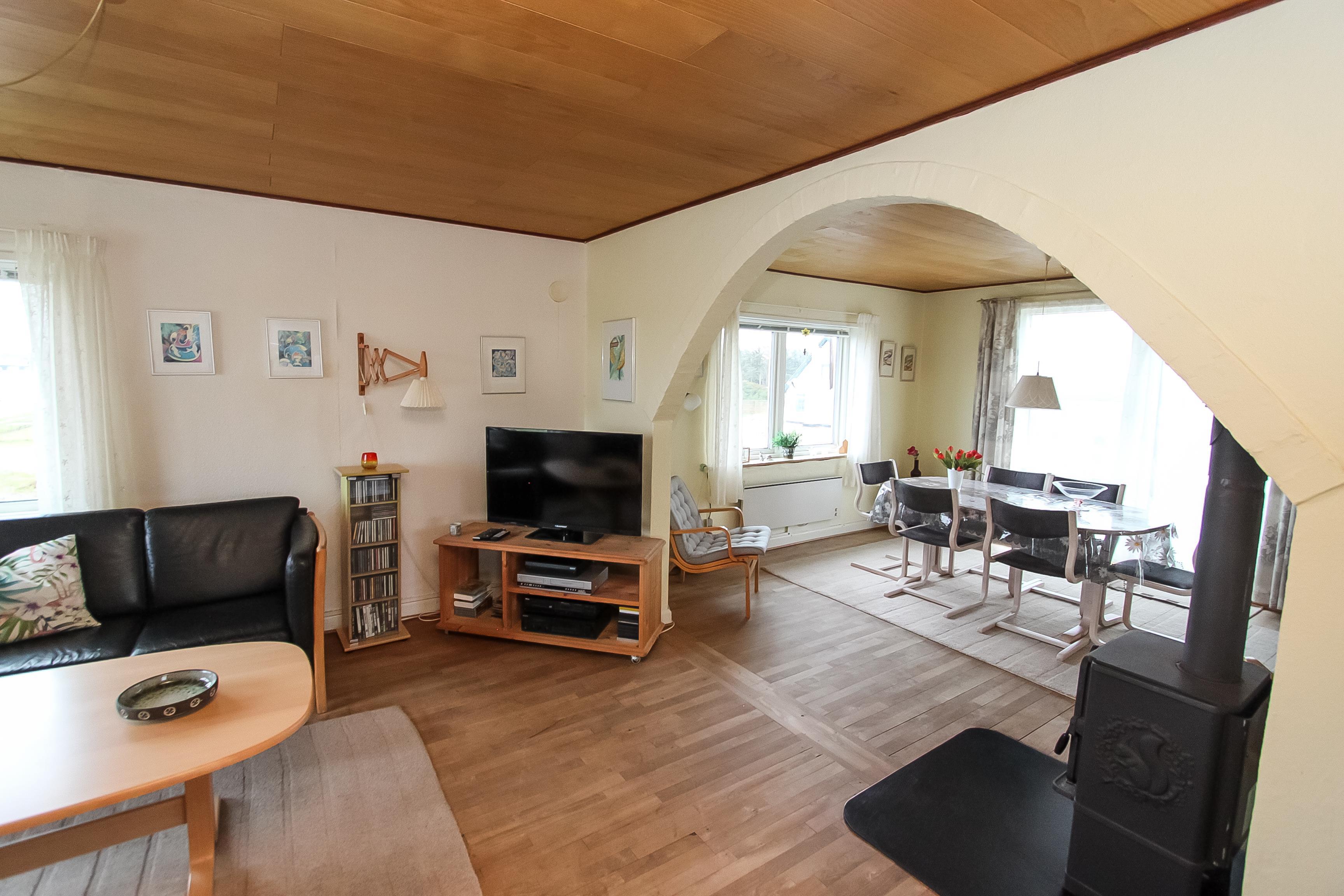 Stue, køkken og spisestue er charmerende forbundet via nogle store bueåbninger i væggen. Køkkenet har glaskeramisk komfur, køleskab, separat fryser på 50 liter, mikrobølgeovn og opvaskemaskine. Selve stuen byder på sofabord, sofagruppe, brændeovn, stereoanlæg med CD og fladskærms-tv med DR, TV2 og tyske TV-kanaler. Herudover er der også et spisebord med stole i spisestuen, som har vinduespartier mod syd og vest. Der er 3 soveværelser i huset hvoraf der er et soveværelse ovenpå med dobbeltseng og i kælderetagen er der et soveværelse med dobbeltseng og et værelse med 2 enkeltsenge. Der hører også en barneseng og en barnestol med til huset. Der er to badeværelser i huset hvoraf det store er i kælderetagen, som har både gulvvarme, bruser, håndvask og toilet. Det andet badeværelse er har blot toilet og håndvask. Der er desuden også en vaskemaskine i huset.