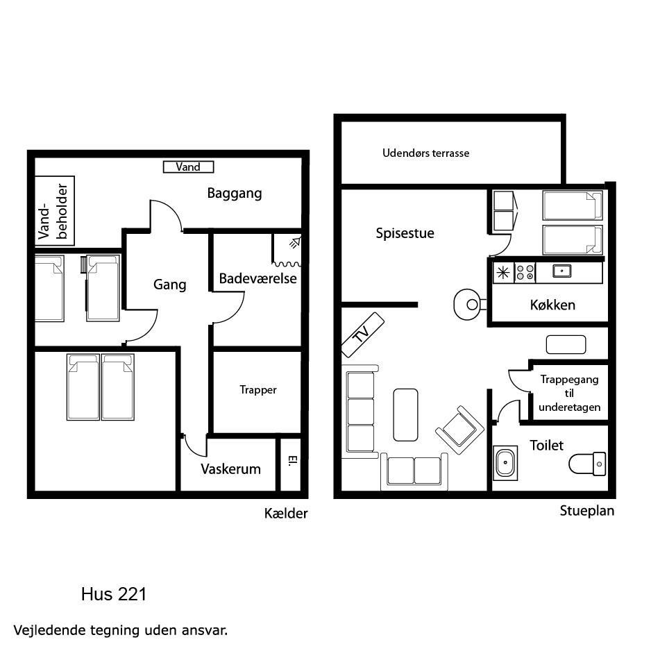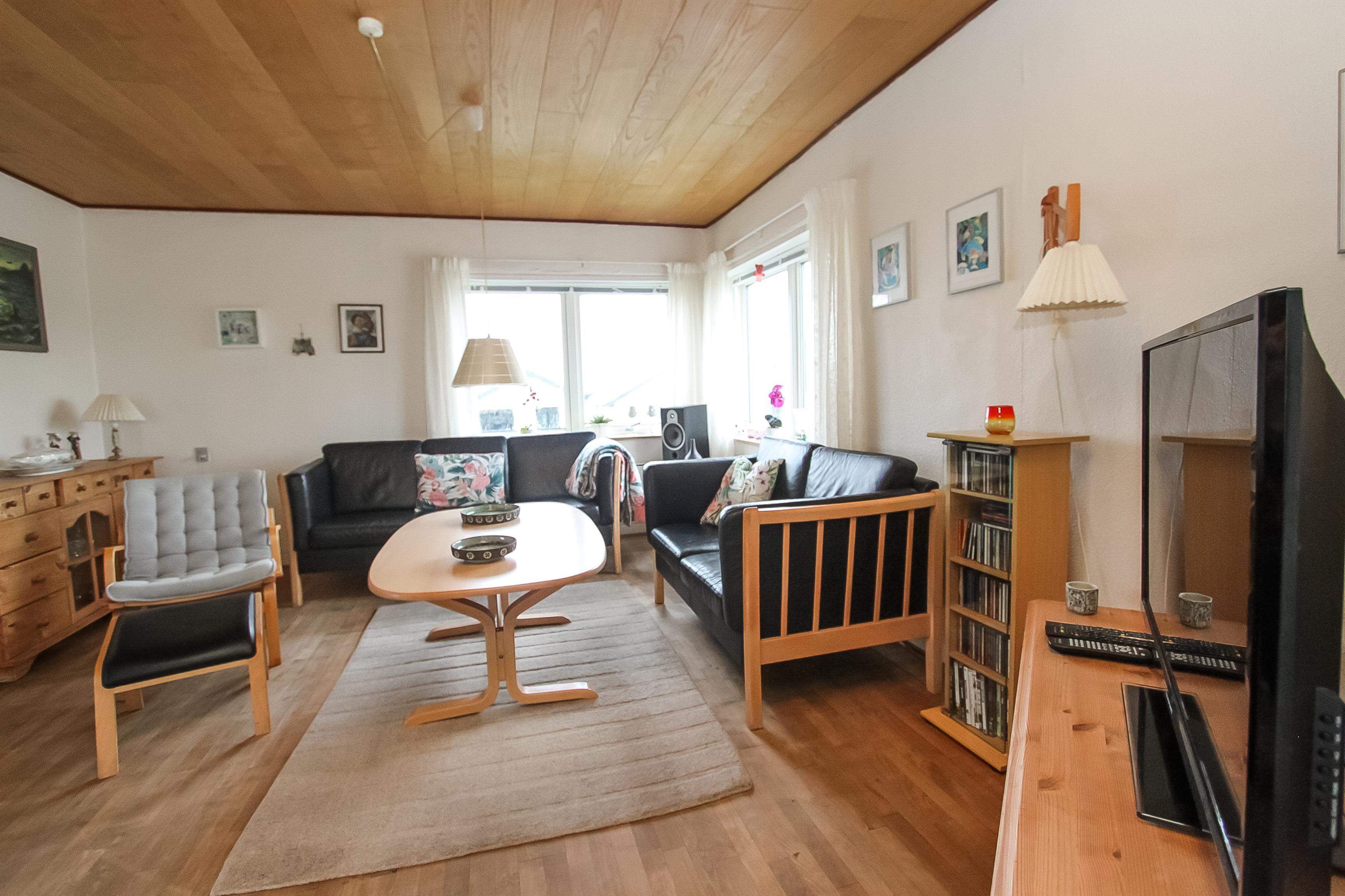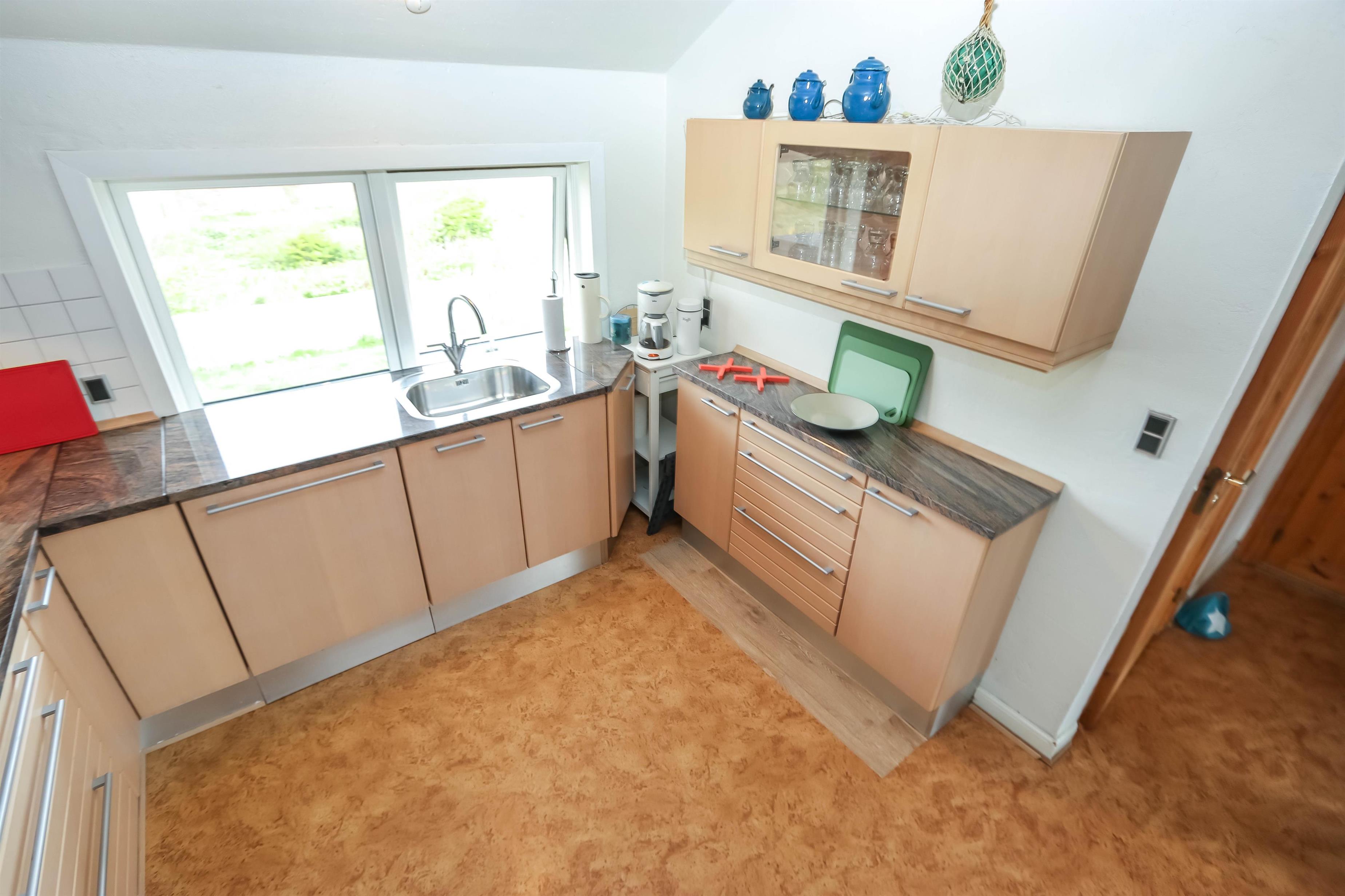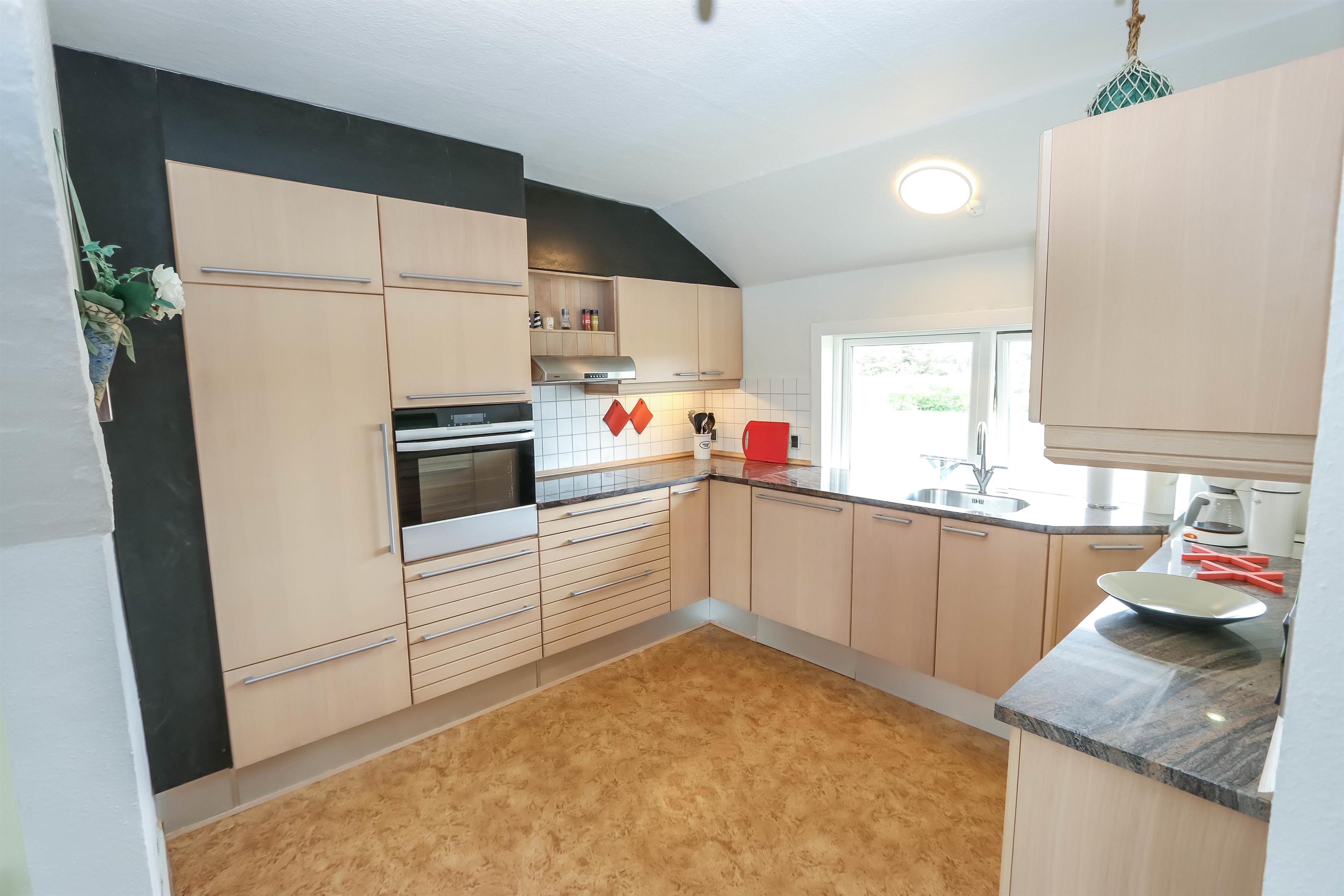 Stue, køkken og spisestue er charmerende forbundet via nogle store bueåbninger i væggen. Køkkenet har glaskeramisk komfur, køleskab, separat fryser på 50 liter, mikrobølgeovn og opvaskemaskine. Selve stuen byder på sofabord, sofagruppe, brændeovn, stereoanlæg med CD og fladskærms-tv med DR, TV2 og tyske TV-kanaler. Herudover er der også et spisebord med stole i spisestuen, som har vinduespartier mod syd og vest. Der er 3 soveværelser i huset hvoraf der er et soveværelse ovenpå med dobbeltseng og i kælderetagen er der et soveværelse med dobbeltseng og et værelse med 2 enkeltsenge. Der hører også en barneseng og en barnestol med til huset. Der er to badeværelser i huset hvoraf det store er i kælderetagen, som har både gulvvarme, bruser, håndvask og toilet. Det andet badeværelse er har blot toilet og håndvask. Der er desuden også en vaskemaskine i huset.