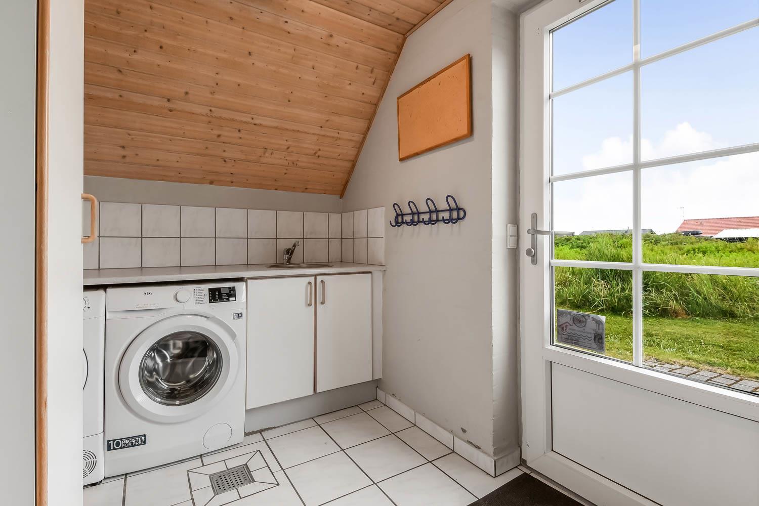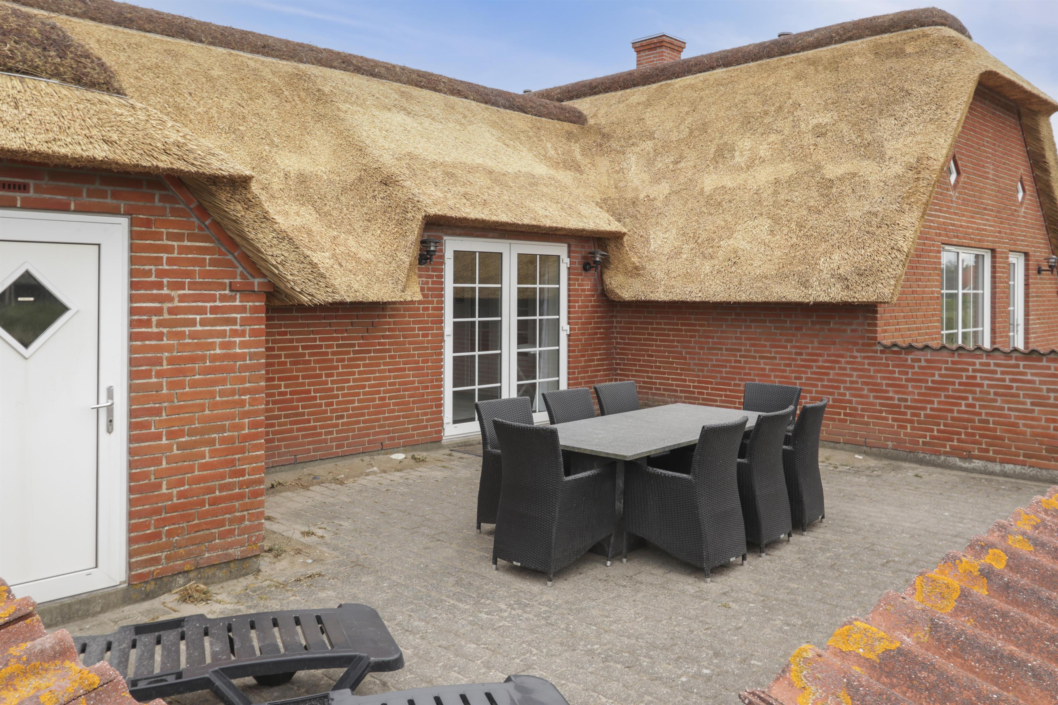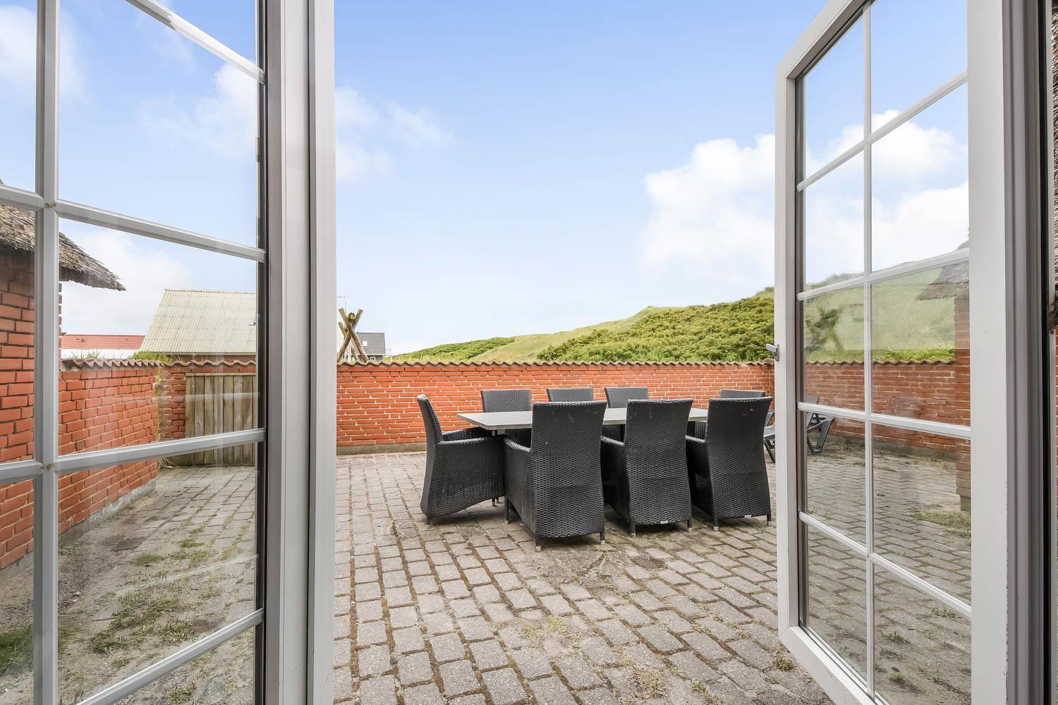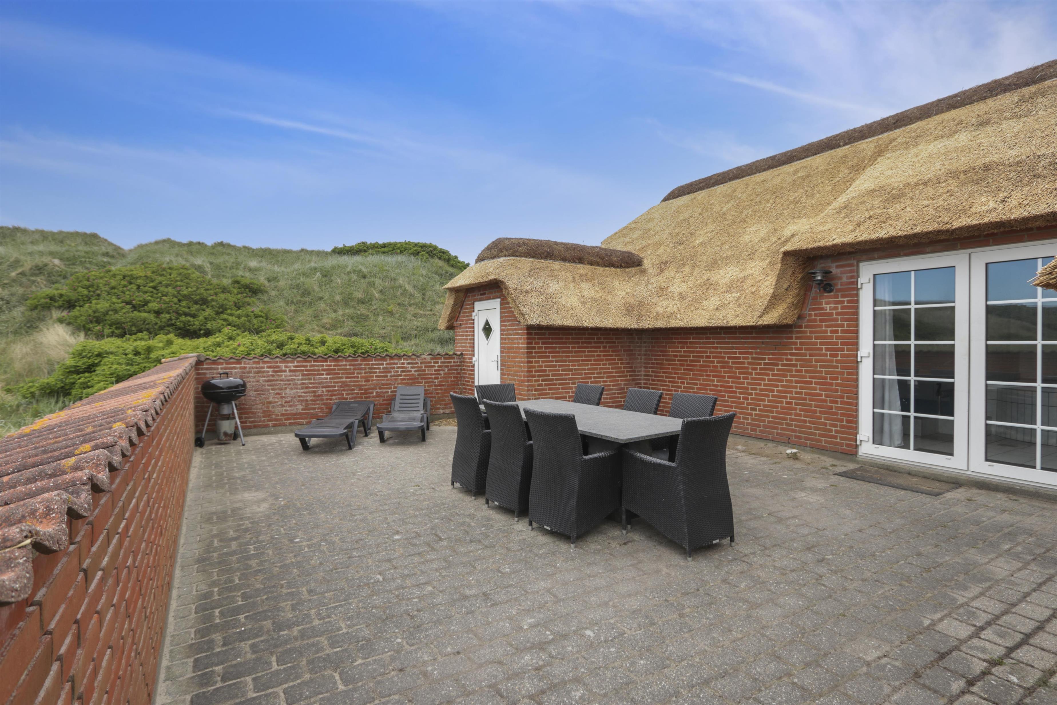 Udgang til dejlig, indhegnet terrasse med havemøbler, liggestole og grill. Herfra er der naturligvis udsigt til klitterne, og går man over dem, er man direkte på stranden. Til børnene er der gynger. Et perfekt hus til de gæster som ønsker at bo direkte ved Vesterhavet i lækre naturomgivelser.
