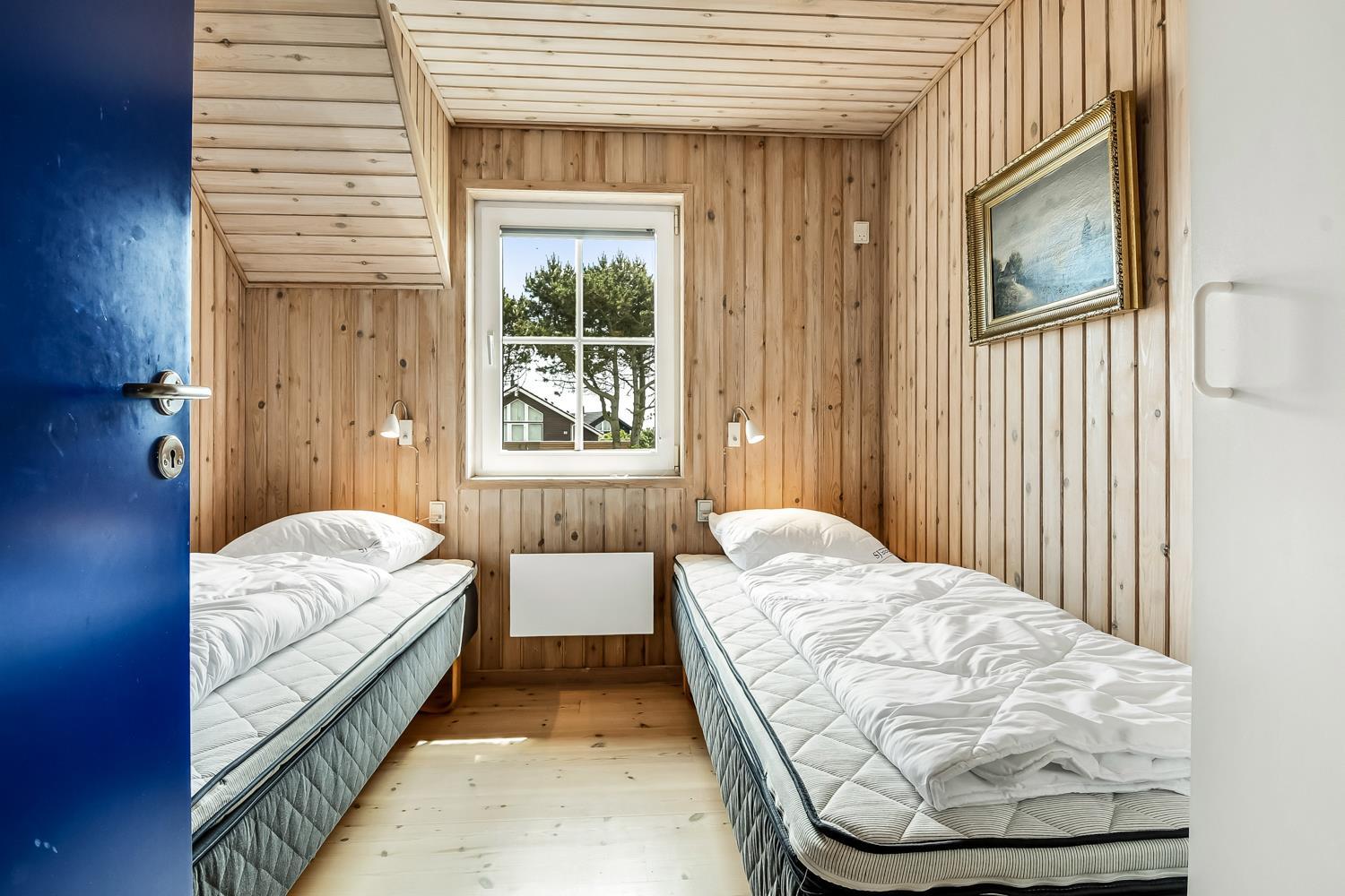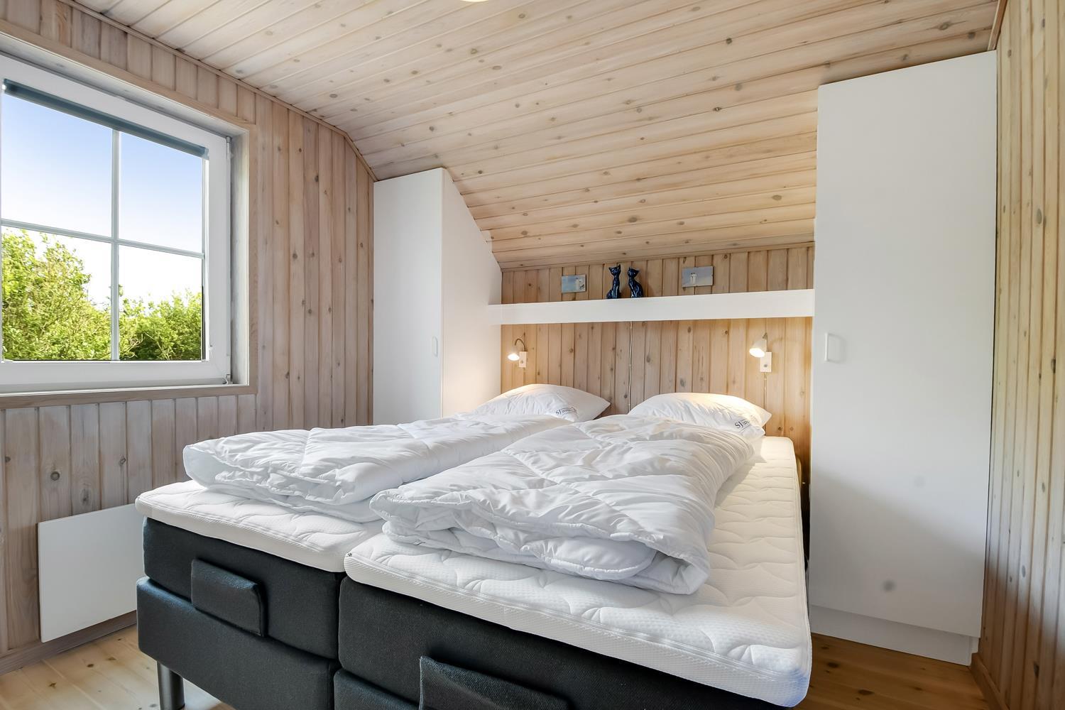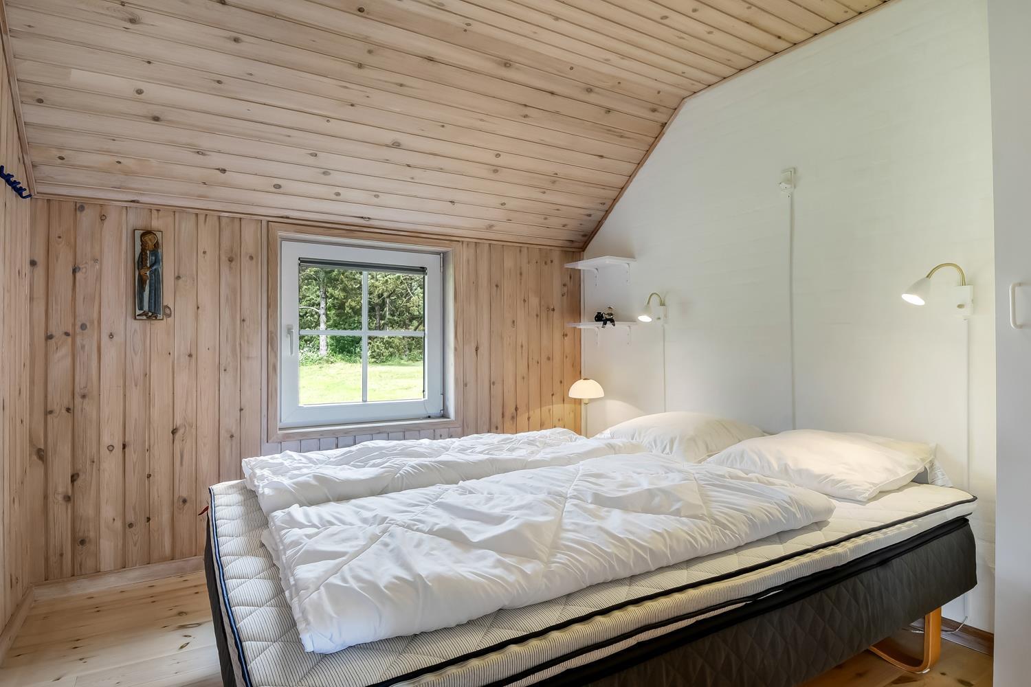 Rigtig flot og rummeligt feriehus i sten med stråtag, her er der plads til 6 personer. Huset ligger ugenert på en klit/naturgrund direkte ved en lille plantage og tæt på den nyrenoverede legeplads på Ibsensvej. Efter I har parkeret bilen og låser døren op til dette dejlige feriehus kommer I ind i en fordeler gang, som også har god plads til at hænge jakker og stille støvlerne. Herfra er der adgang til husets 3 soveværelser som er indrettet med 1DS + 1DS + 2S. Desuden er der også adgang til husets badeværelse som er opdelt i et separat rum som har toilet og håndvask og det andet badeværelse er med bruser, spabad og adgang til sauna, begge badeværelser er med gulvvarme. Køkkenet som er kombineret med stuen er meget veludstyret med alt hvad man behøver i ferien såsom glaskeramisk komfur, emhætte, køle-/fryseskab, mikroovn og opvaskemaskine. På den anden side af halvmuren fra køkkenet står spisebordet, så det er nemt at servere den tilbragte mad. Stuen er desuden med brændeovn som sørger for en behagelig varme også i den kolde tid. Derudover er der behagelige møbler, F-TV med parabol til tyske kanaler, og danske kanaler, DVD og CD afspiller og dab radio. Der er trægulve i alle rum på nær badeværelserne som er med klinker. Vaskemaskine. Ikke rygerhus. Husdyr ikke tilladt.