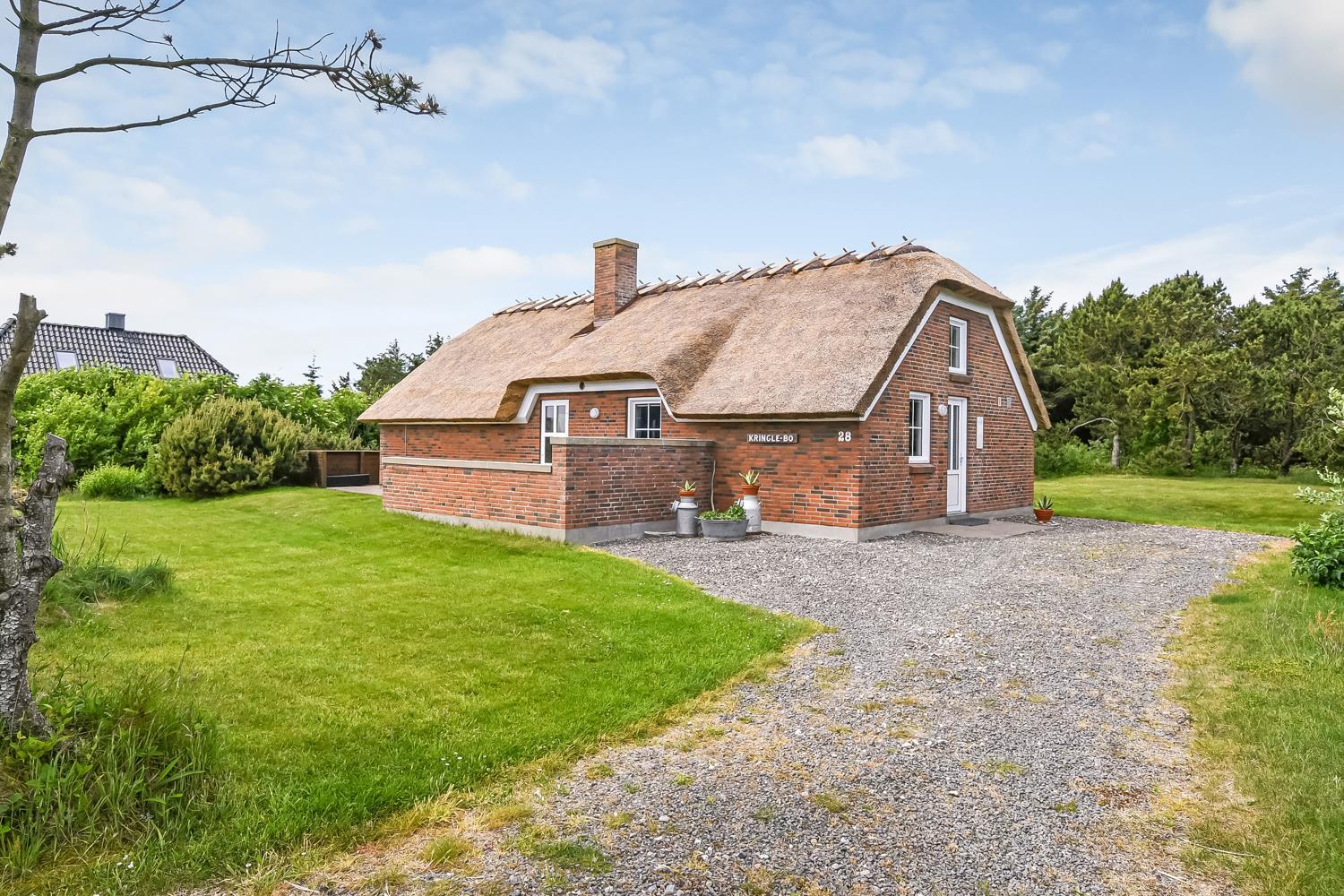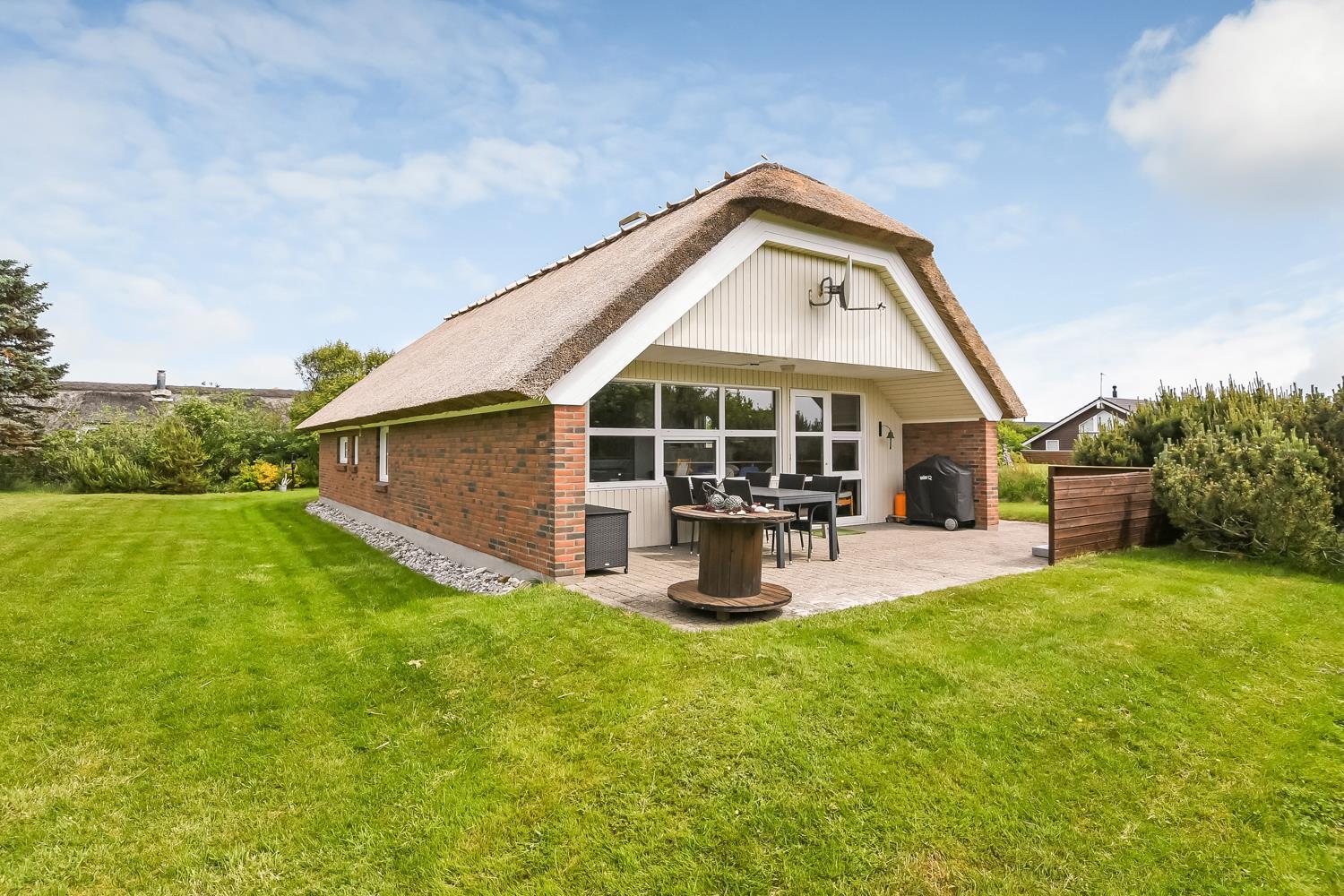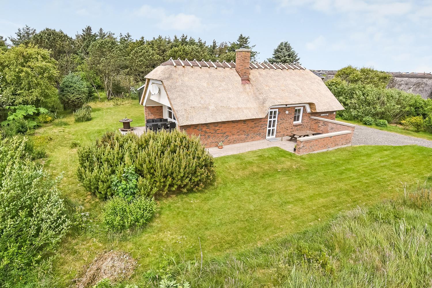 Særdeles veludstyret, stråtækt feriehus beliggende på en naturgrund med større træer og buske, og afstanden til den dejlige strand ved Vesterhavet er kun 250 m. Der er selvfølgelig gratis internet i huset.