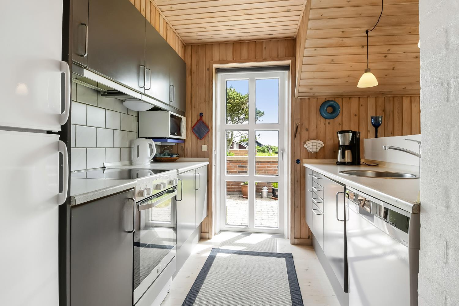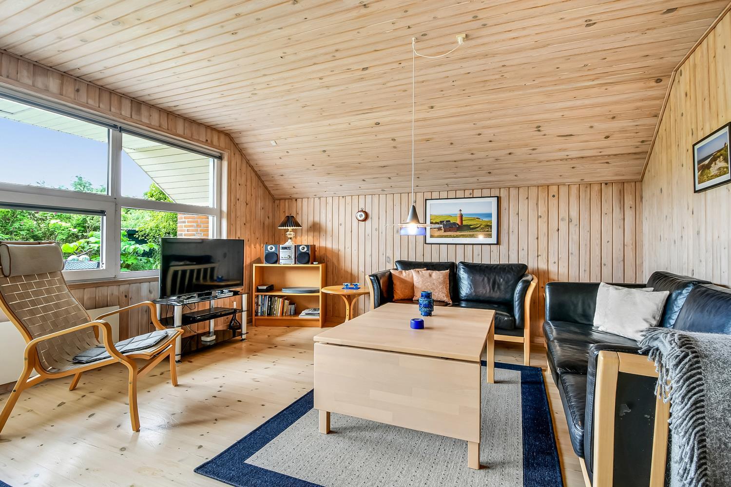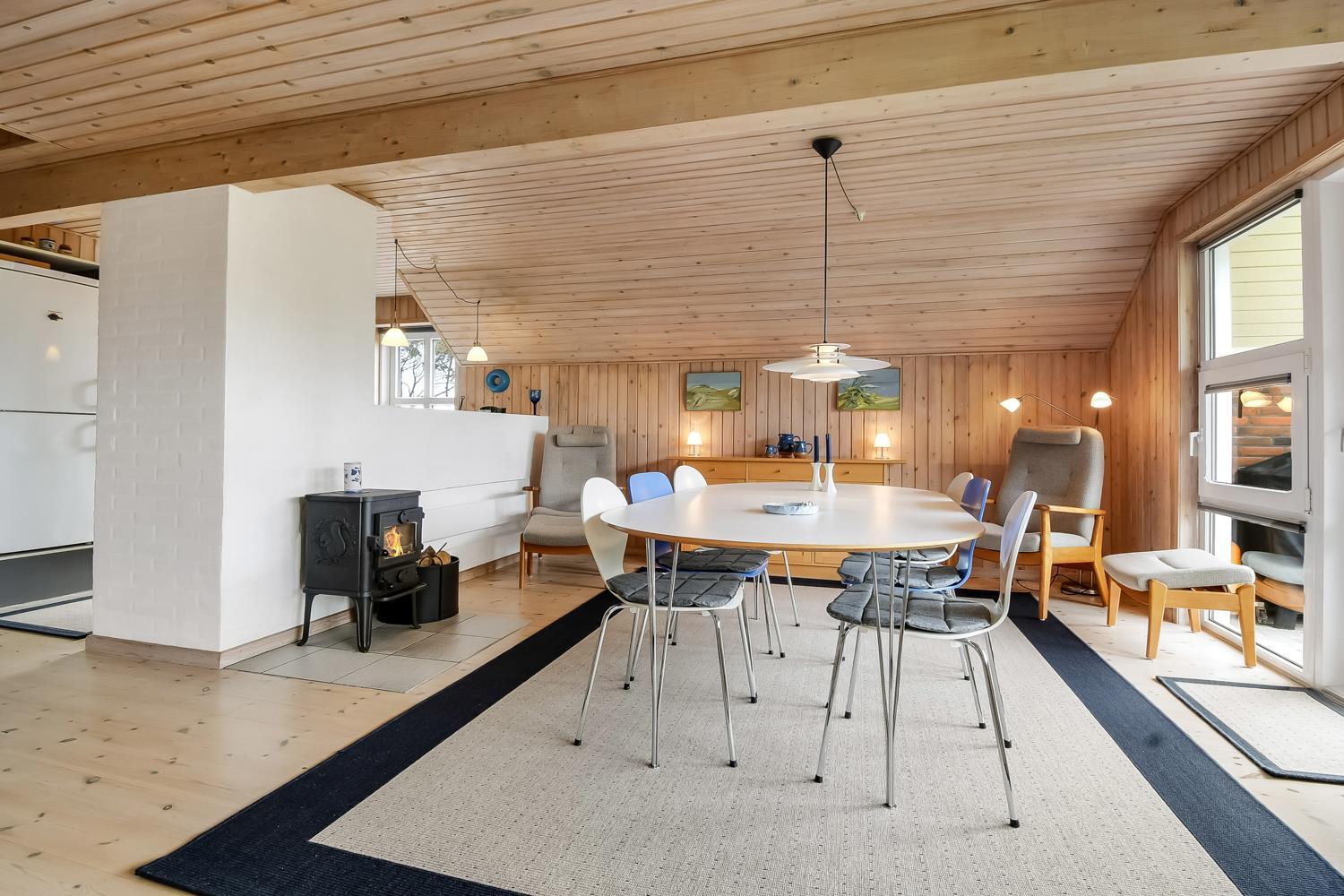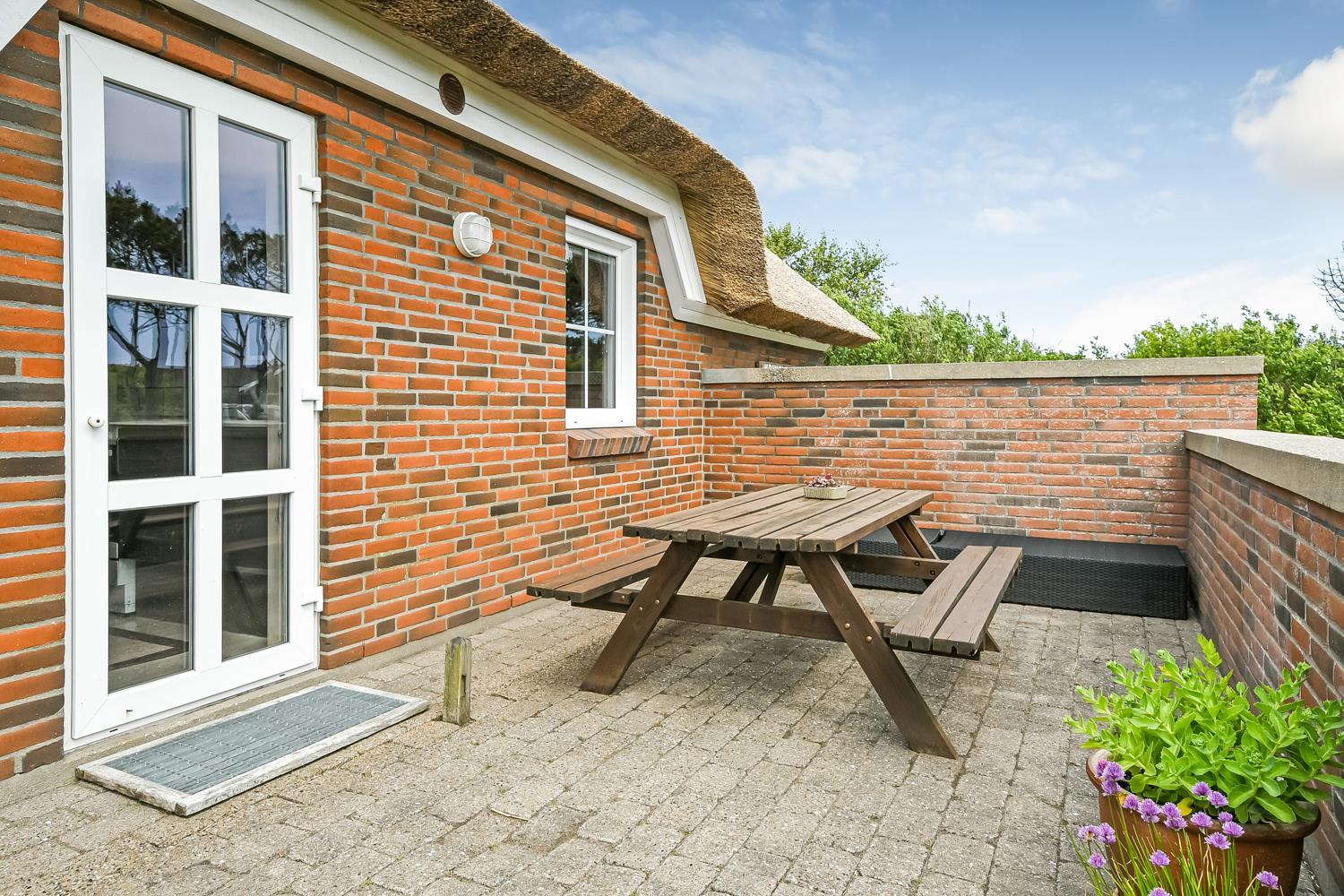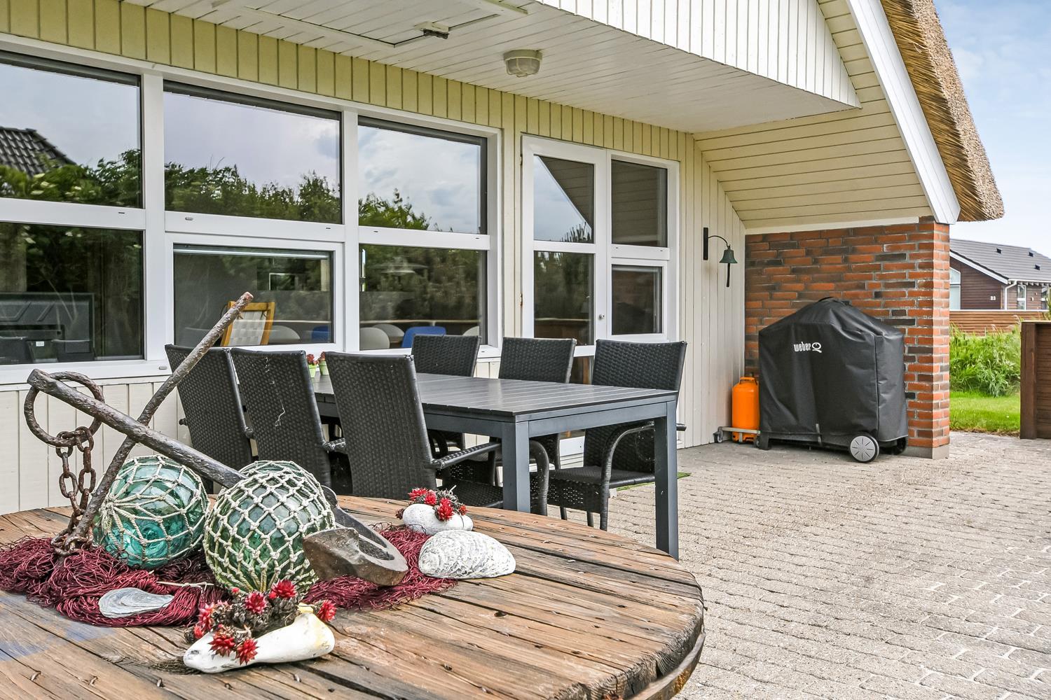 Fra stuen er der udgang til en dejlig delvis overdækket terrasse med havemøbler, gasgrill og 2 solvogne. Huset er beliggende på en velholdt natur-/klitgrund som er omgivet af træer og buske. Afstanden til Vesterhavet er kun 250 m så man kan nemt komme derned på gåben. Vesterhavet er altid et besøg værd og her er der flere muligheder for aktiviteter såsom drageflyvning, fiskeri, bygge sandslot og meget meget mere, så der kan bruges mange timer i den friske havluft. På Ibsensvej ikke langt fra huset, er der desuden også mulighed for udendørsaktiviteter. Der er der bl.a. mulighed for at spille beachvolley og der er også en boldbane, hvor man kan spille fodbold. Fra huset er der ca. 15 min kørsel til Thyborøn som er en dejlig fiskerby også her findes der flere gode attraktioner såsom Sea War museum og Jyllandsakvariet. Kører man i den anden retning kommer man til Lemvig som er en gammel handelsby, her er der en fantastisk havnepromenade med bl.a. legeplads og skaterbane. Dette feriehus er perfekt for en familie eller 2 par som ønsker at holde ferie sammen.