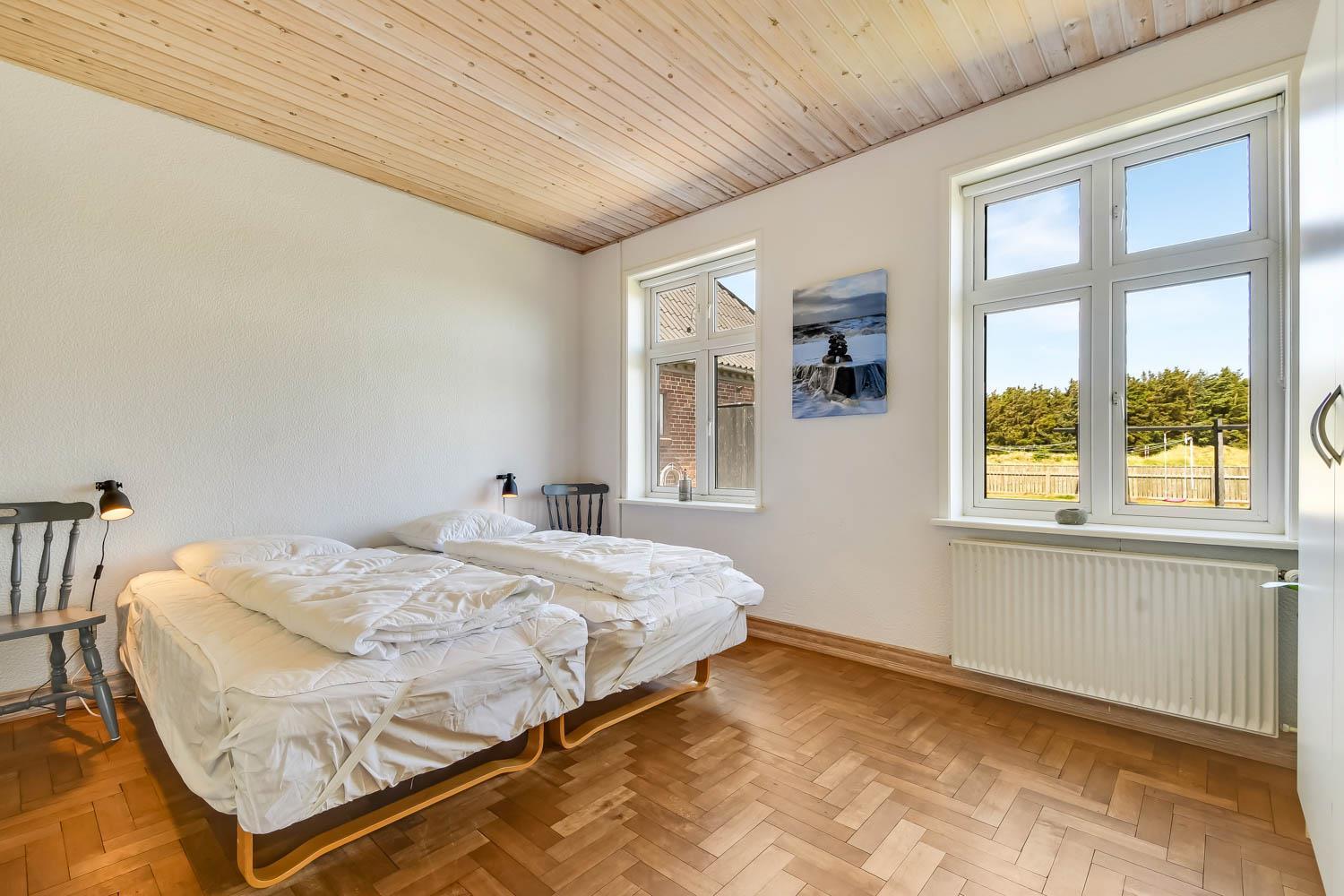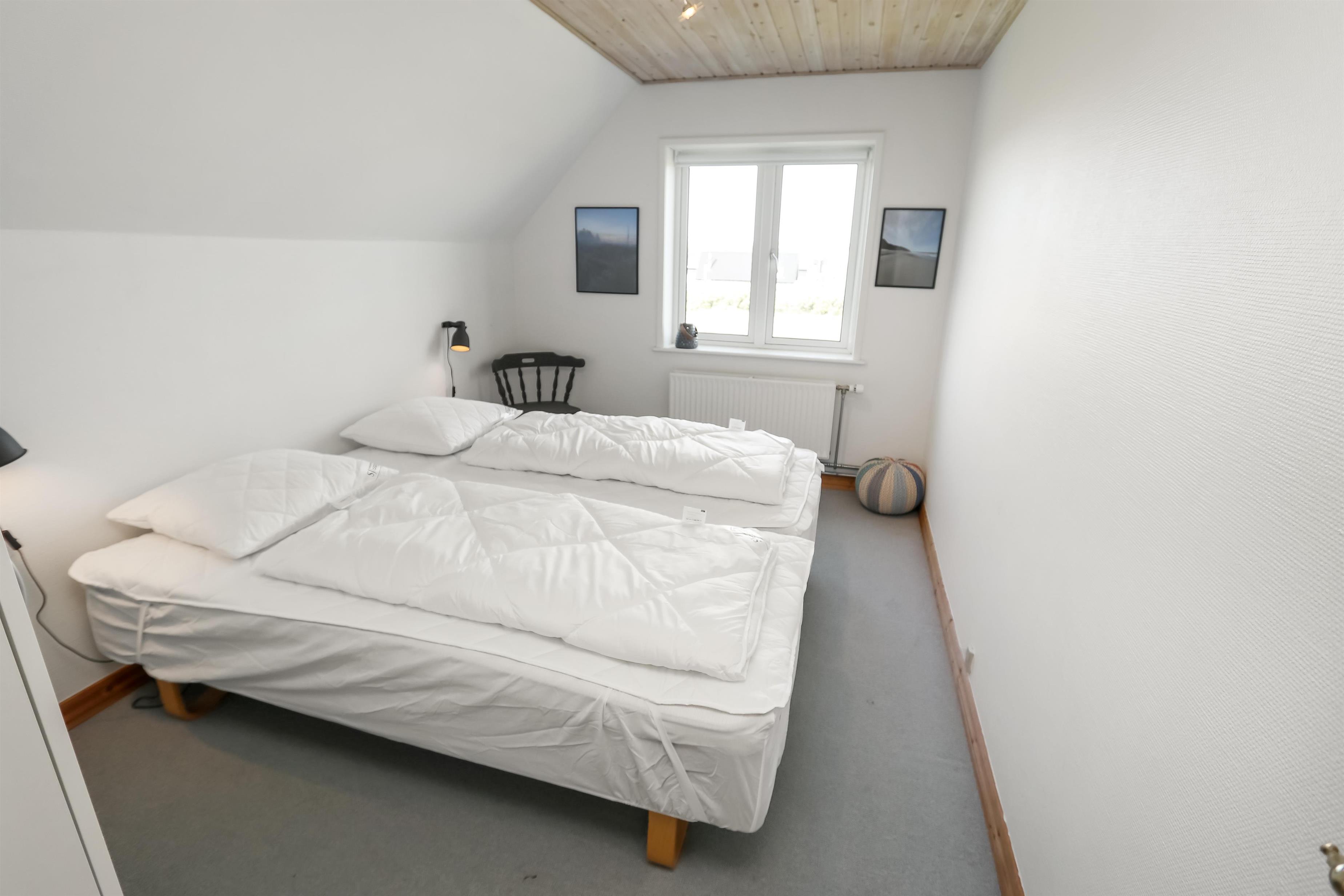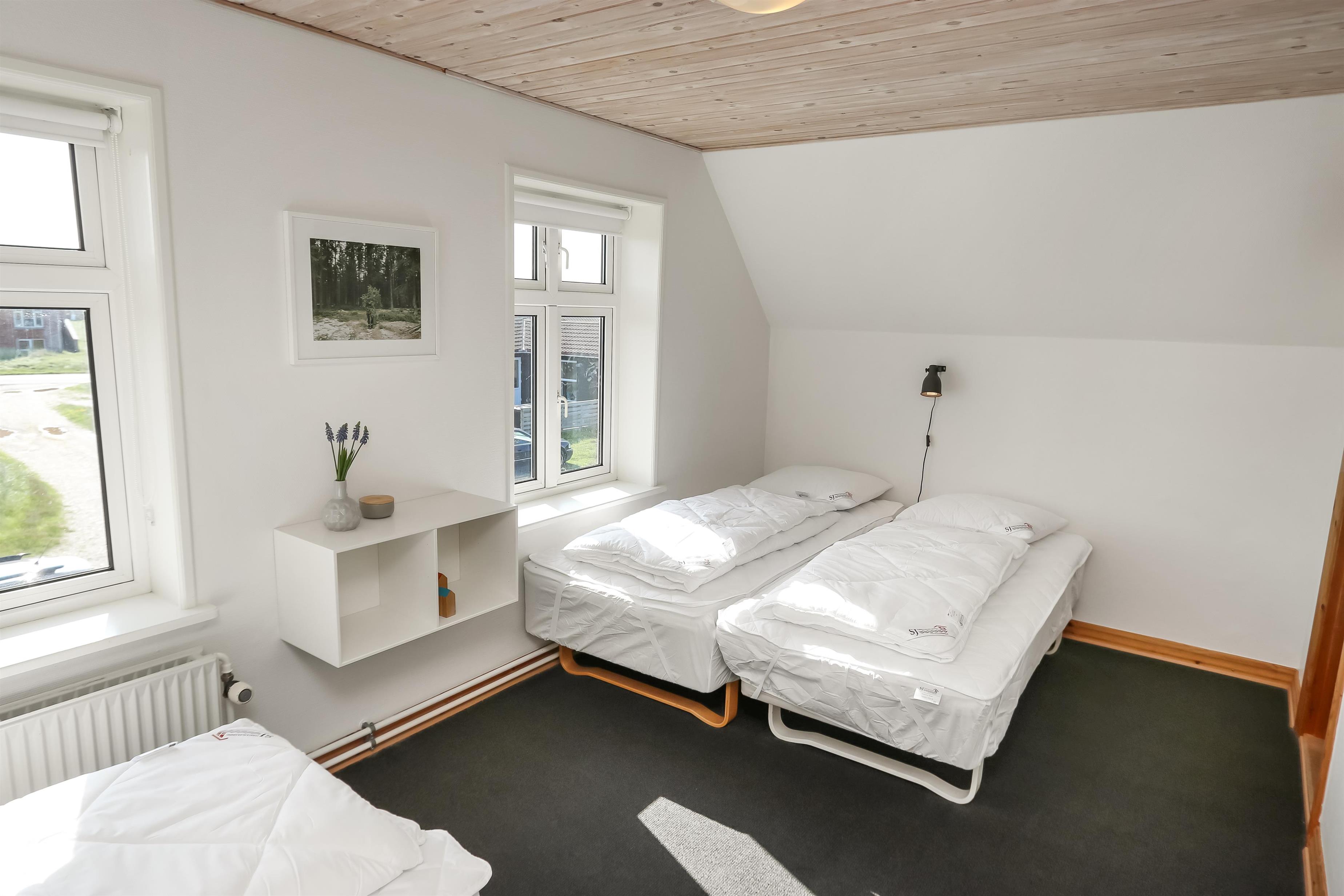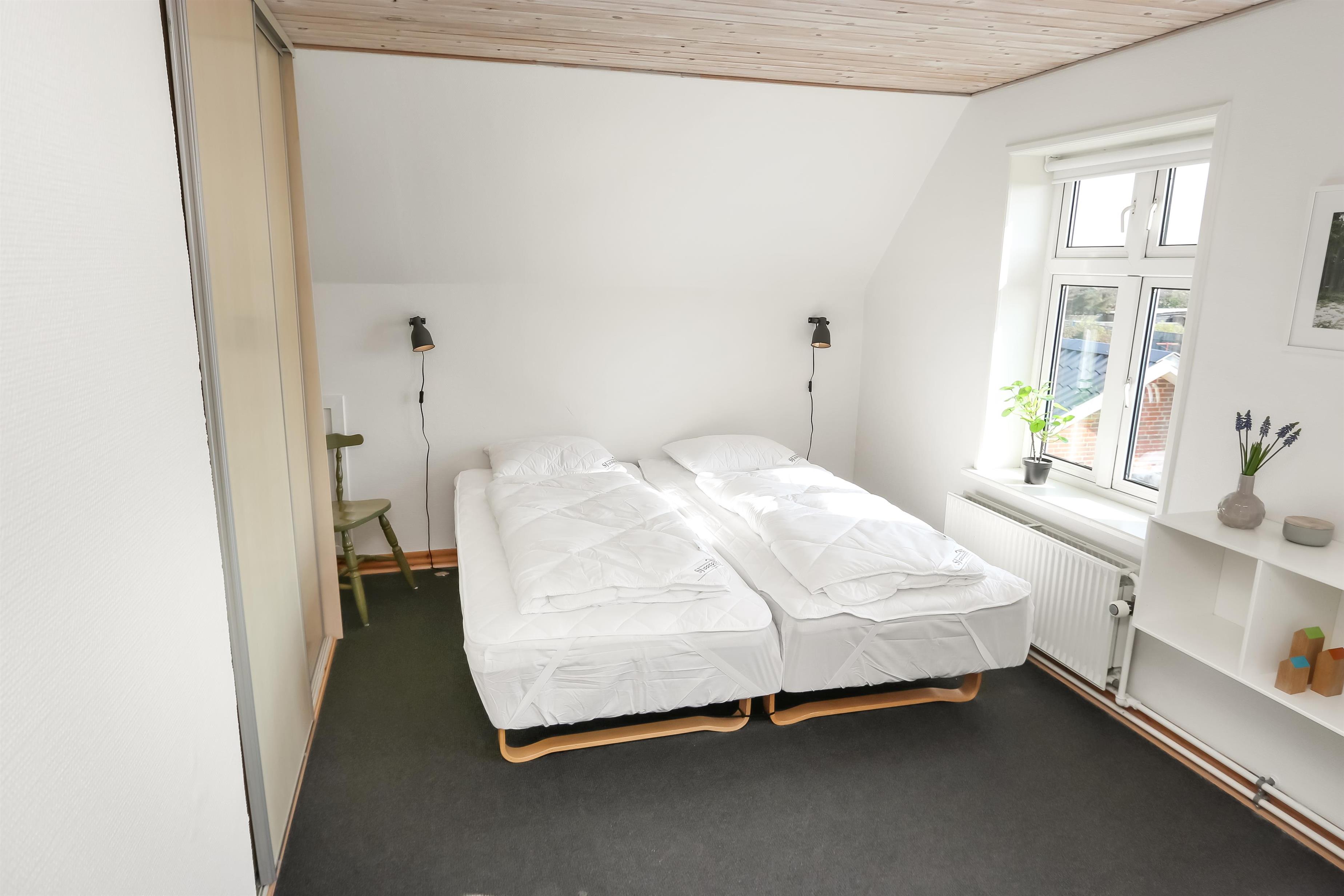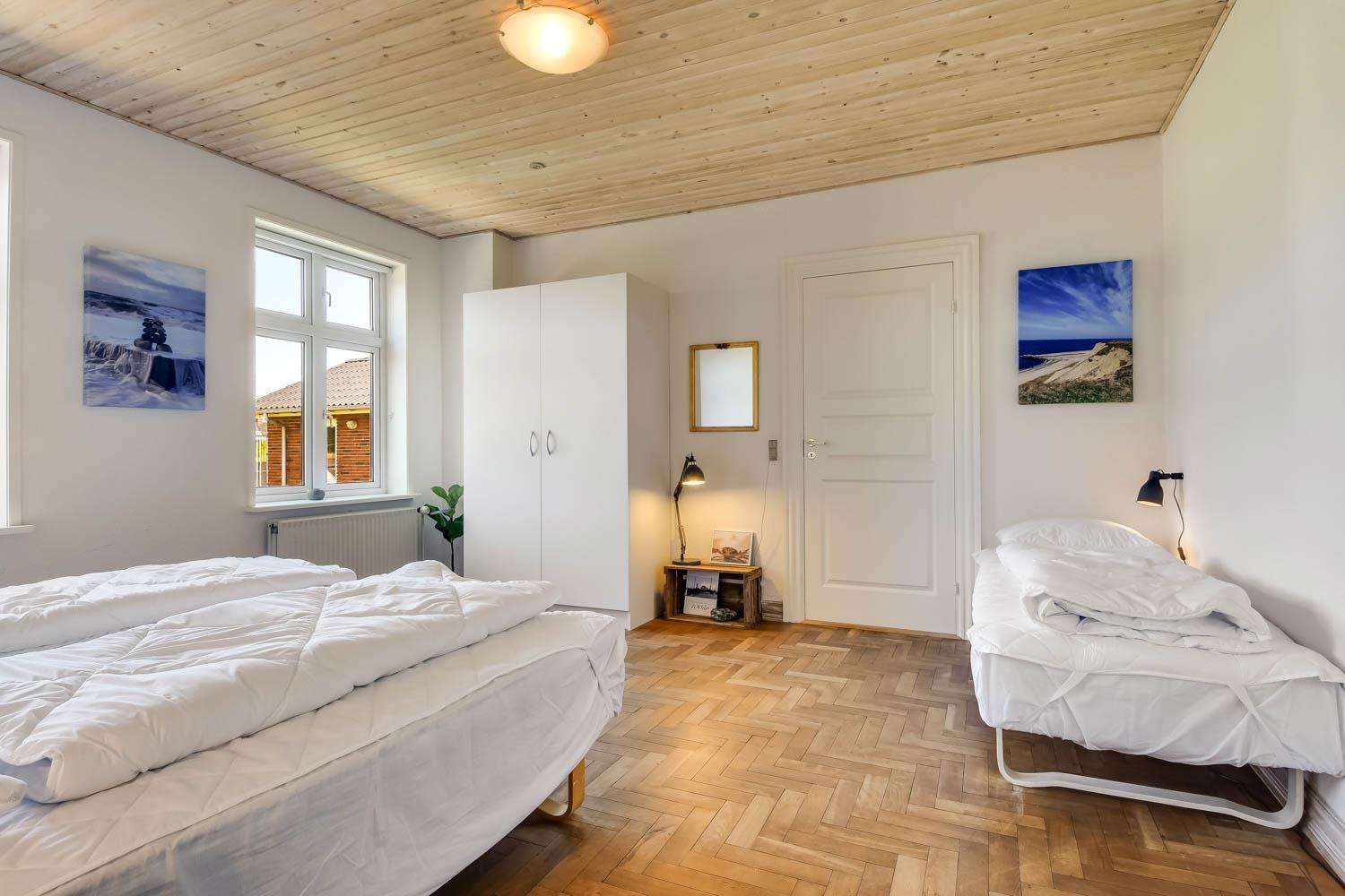 I stueetagen findes desuden 2 soverum: ét med dobbeltseng og enkeltseng (1DS + 1ES) og ét med to enkeltsenge (2ES). Barneseng og højstol til de mindste gæster er til rådighed.