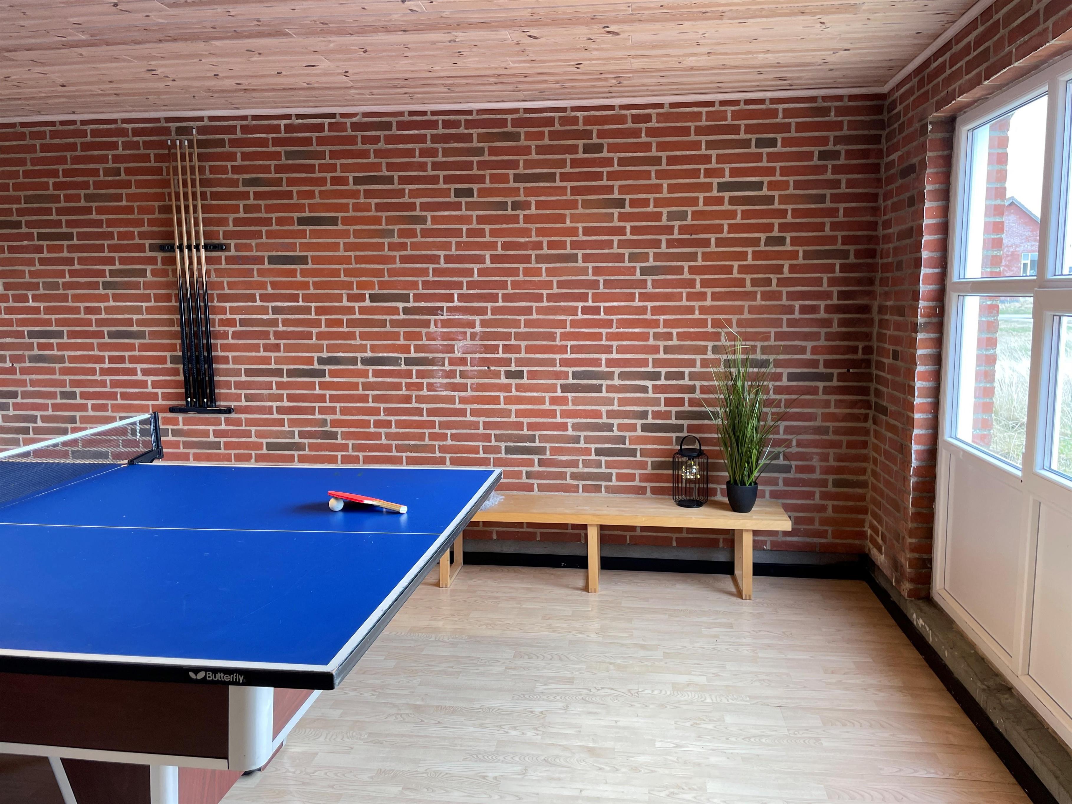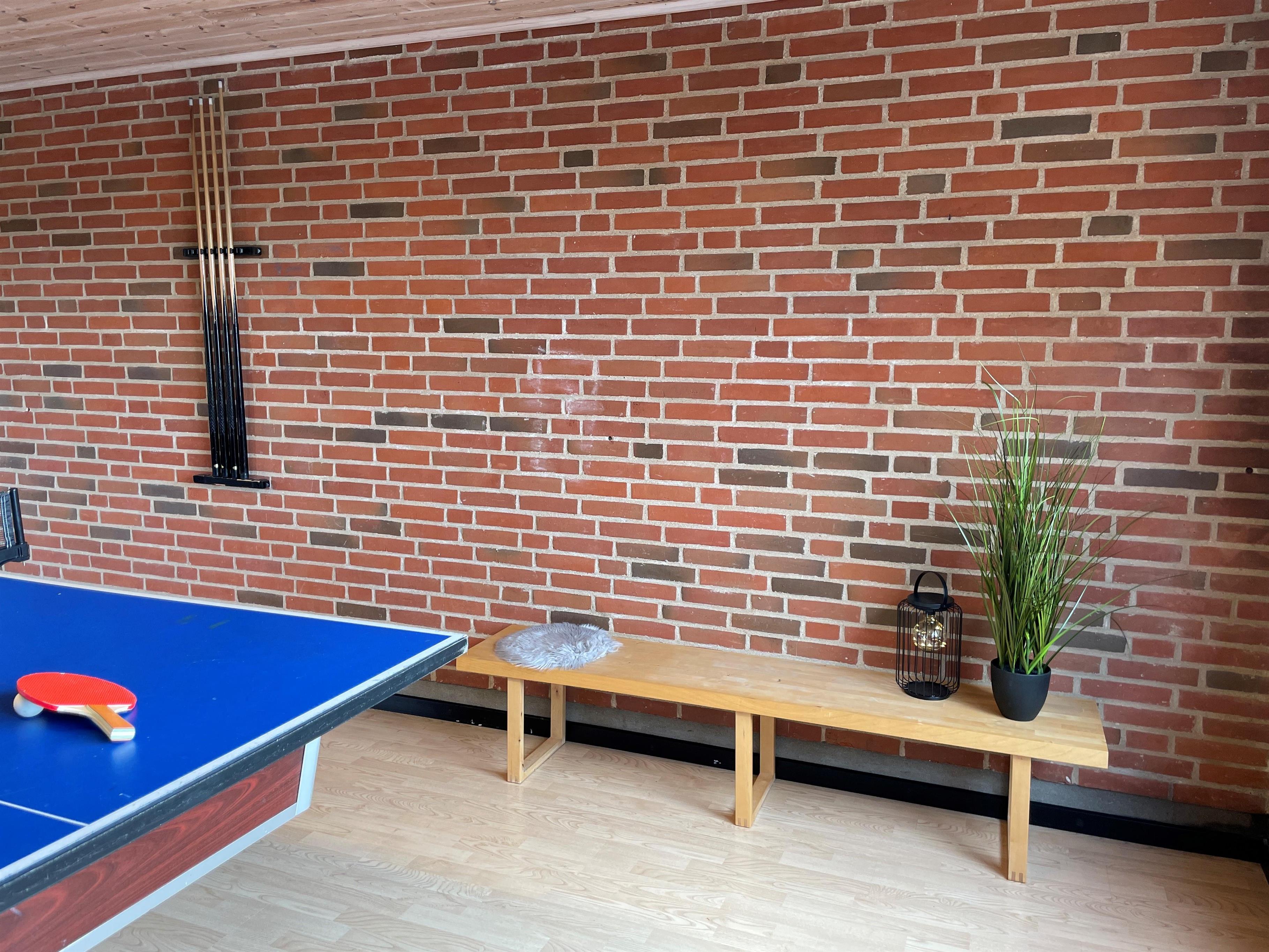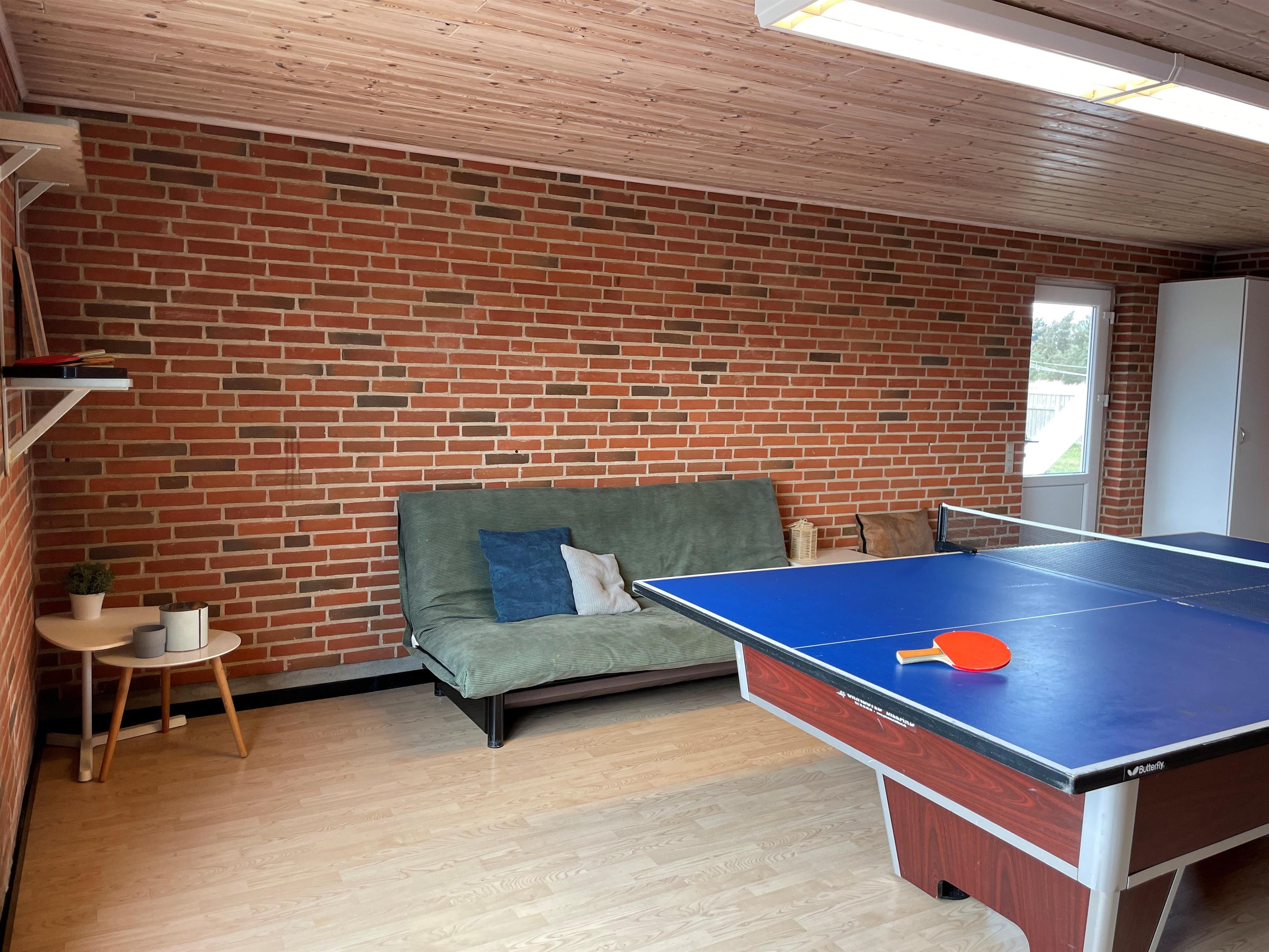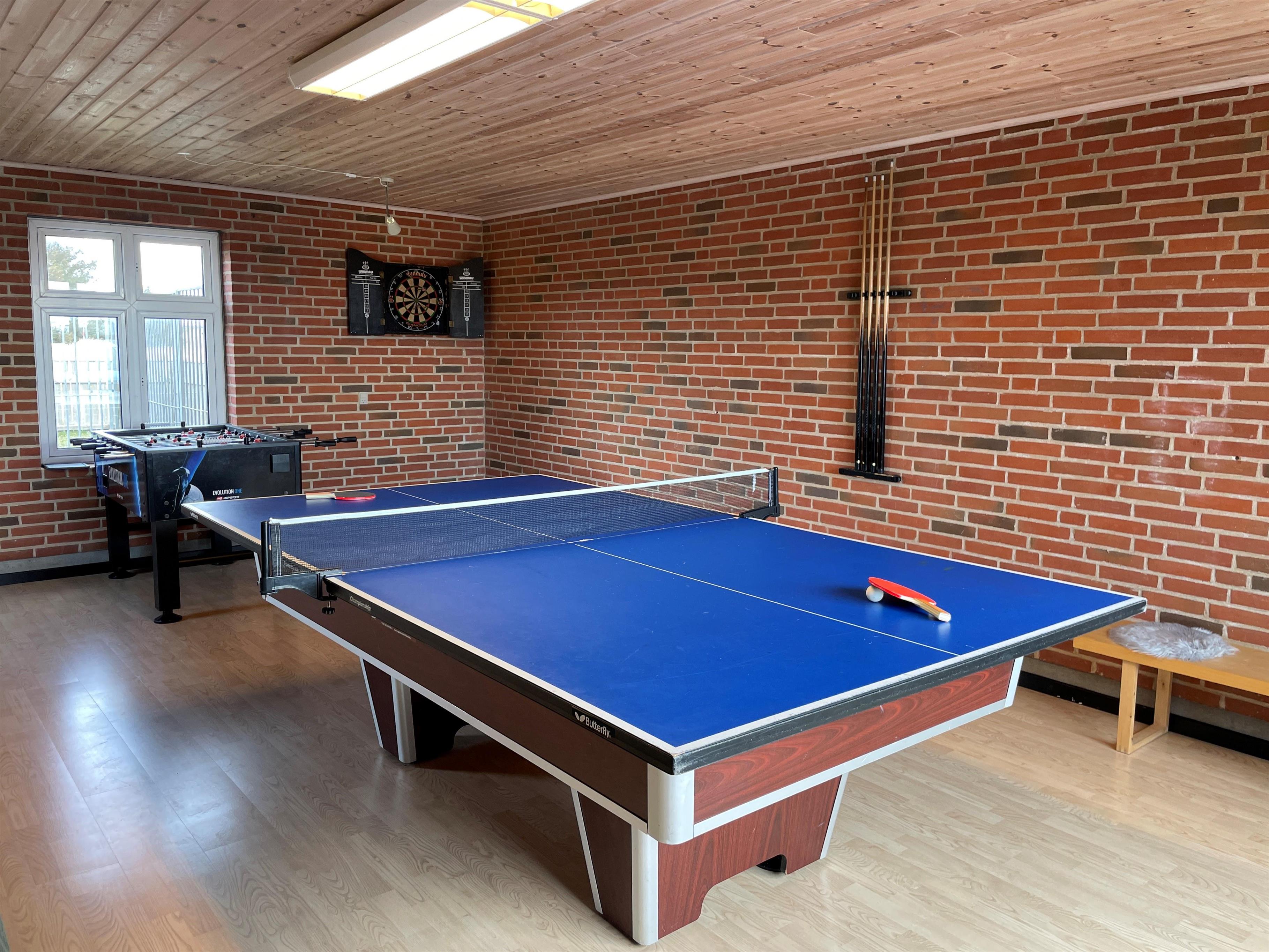 I husets garage er der indrettet et hyggeligt, isoleret aktivitetsrum med bordtennis, bordfodbold, billard og dart. Rummet kan bruges året rundt, og her kan familien dyste mod hinanden og finde ud af, hvem der er bedst. Bag aktivitetsrummet er der to hundegårde med en samlet størrelse på 8 m².