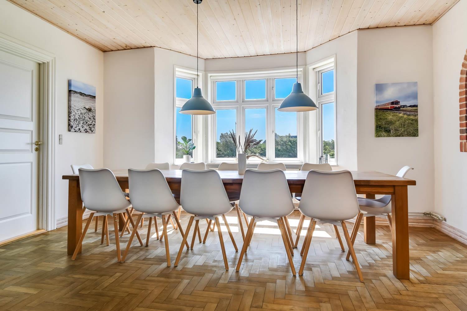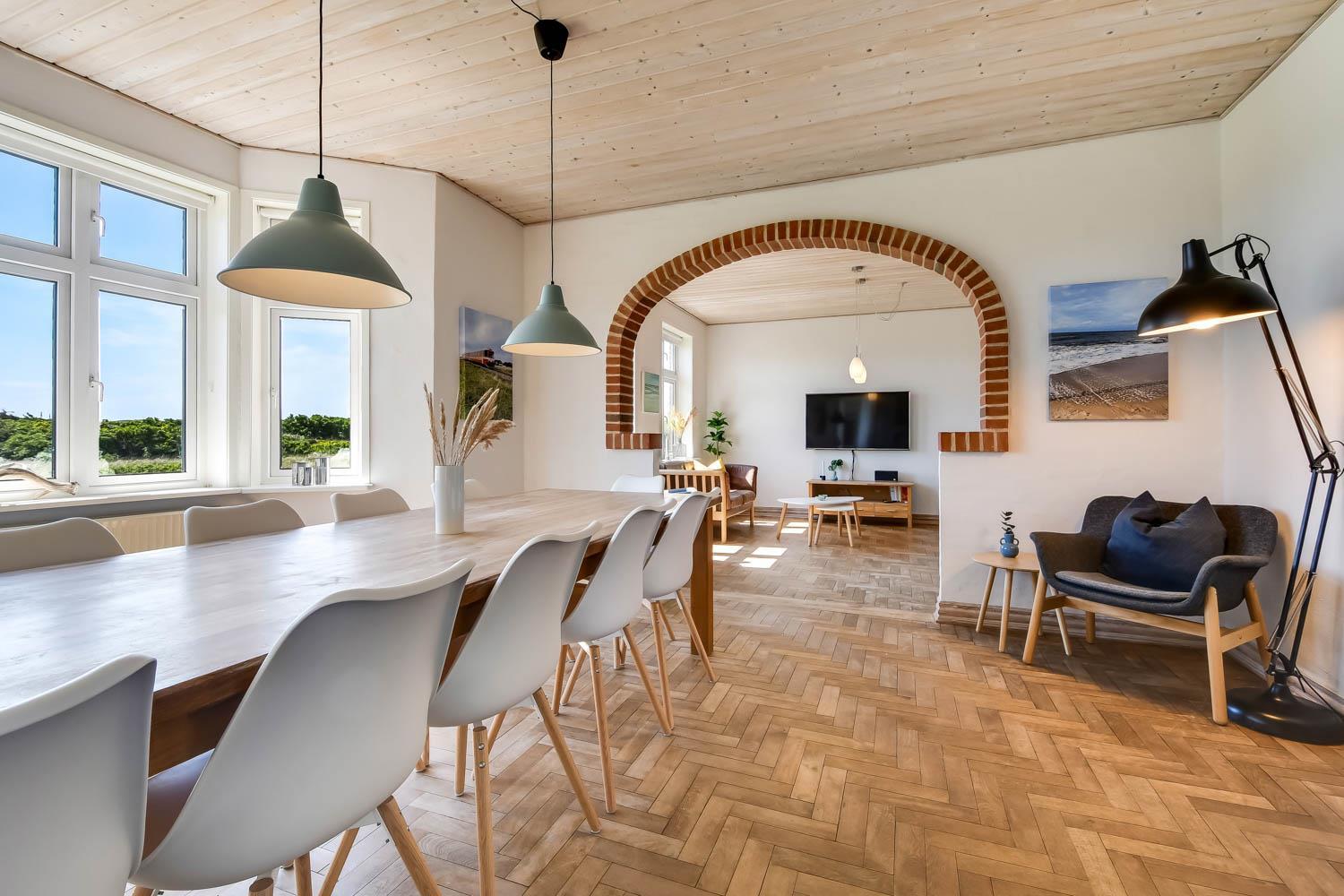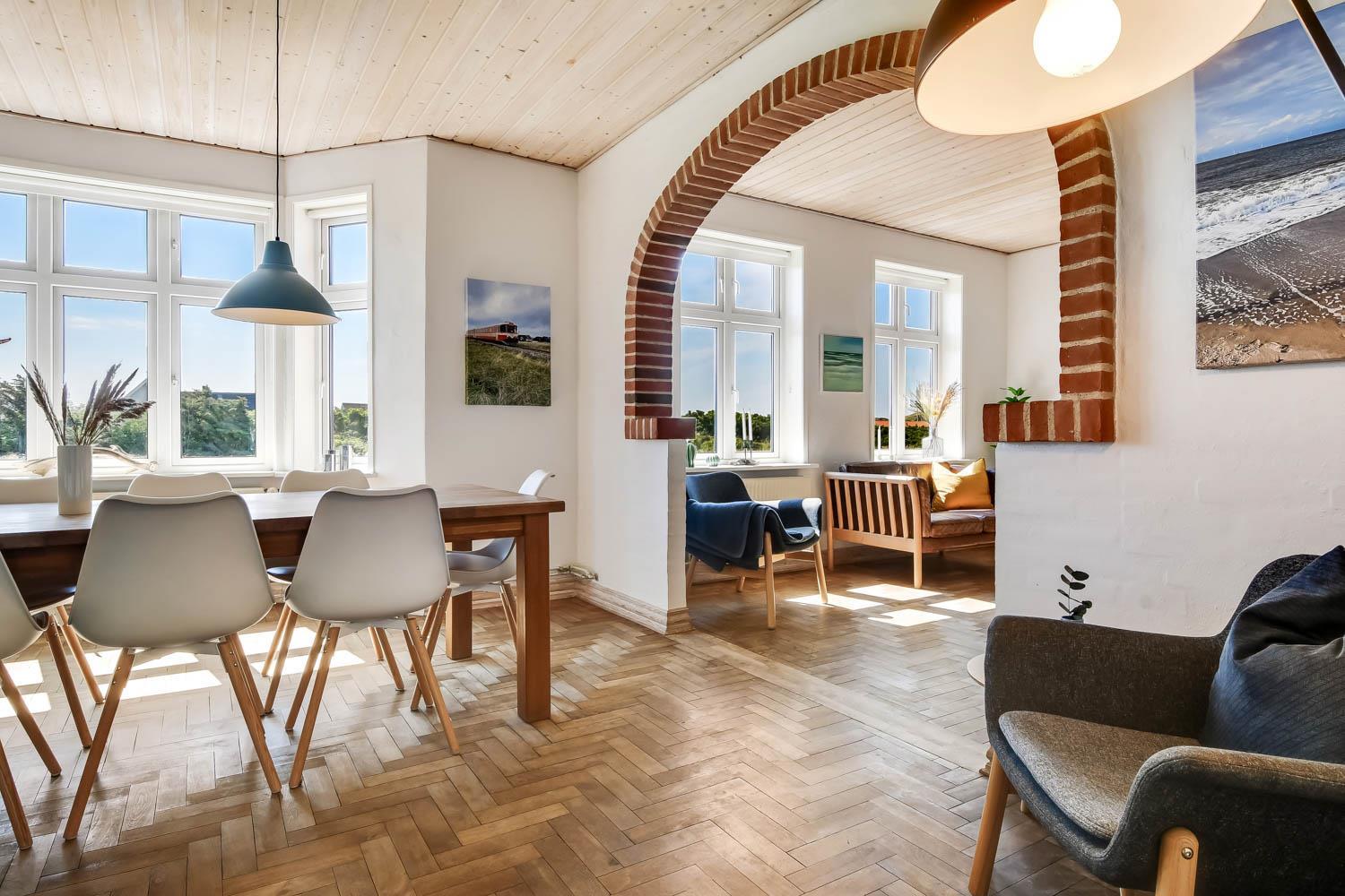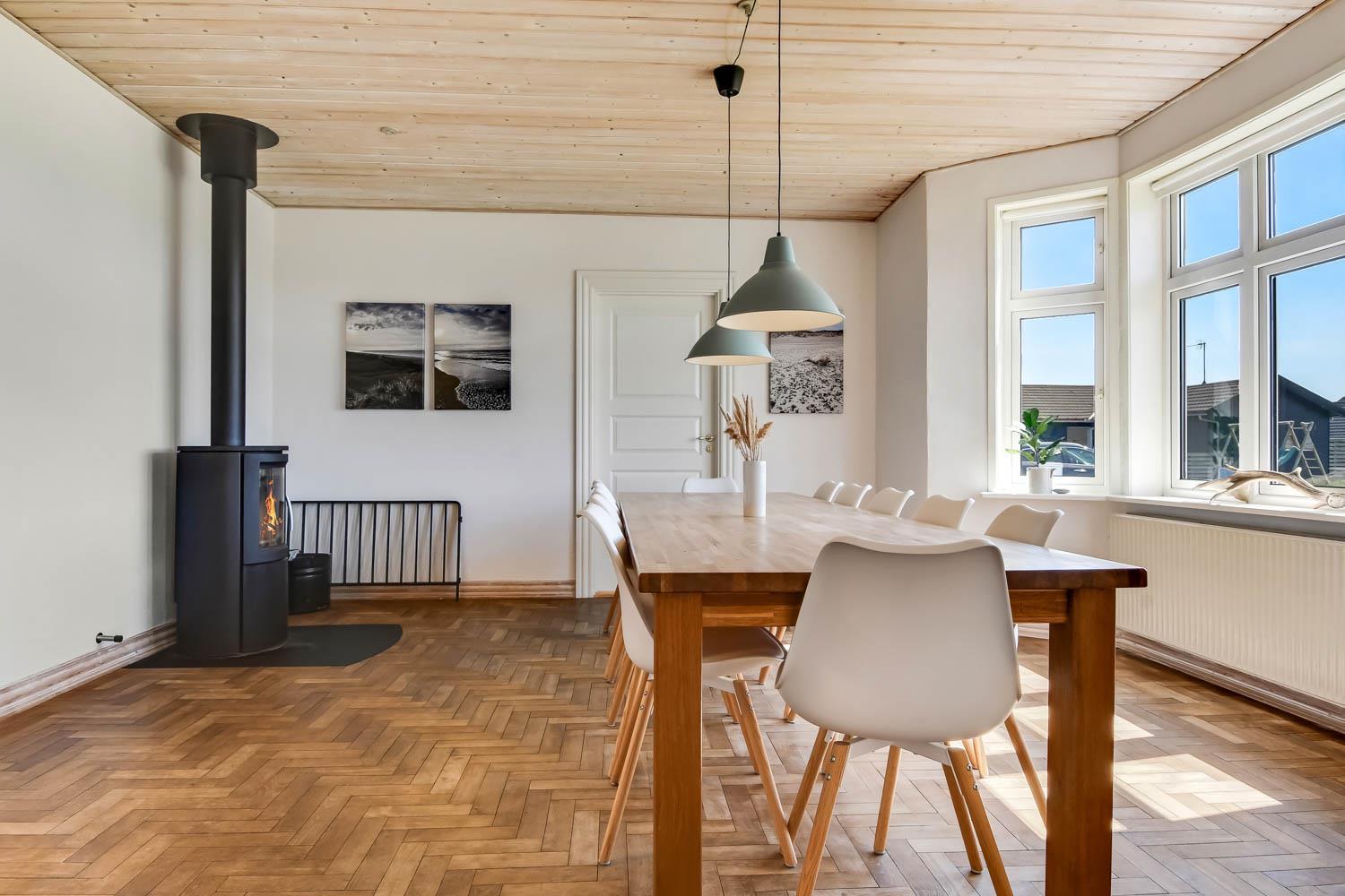 Huset er opført i 1919. I 2019 gennemgik det en omfattende renovering, og i 2024 blev huset yderligere optimeret af den nye ejer, så det fremstår flot og hyggeligt. En smuk entré med trappe til 1. sal byder jer velkommen. Spisestuen/opholdsstuen er rummelig og har masser af plads til hele familien. Uanset om I ønsker at bruge husets fladskærms-tv med danske og tyske kanaler eller streame jeres yndlingsserier via egne abonnementer, er alt muligt. Her er også gode lædermøbler og en dejlig brændeovn. Spisebordet er praktisk placeret tæt ved køkkenet.