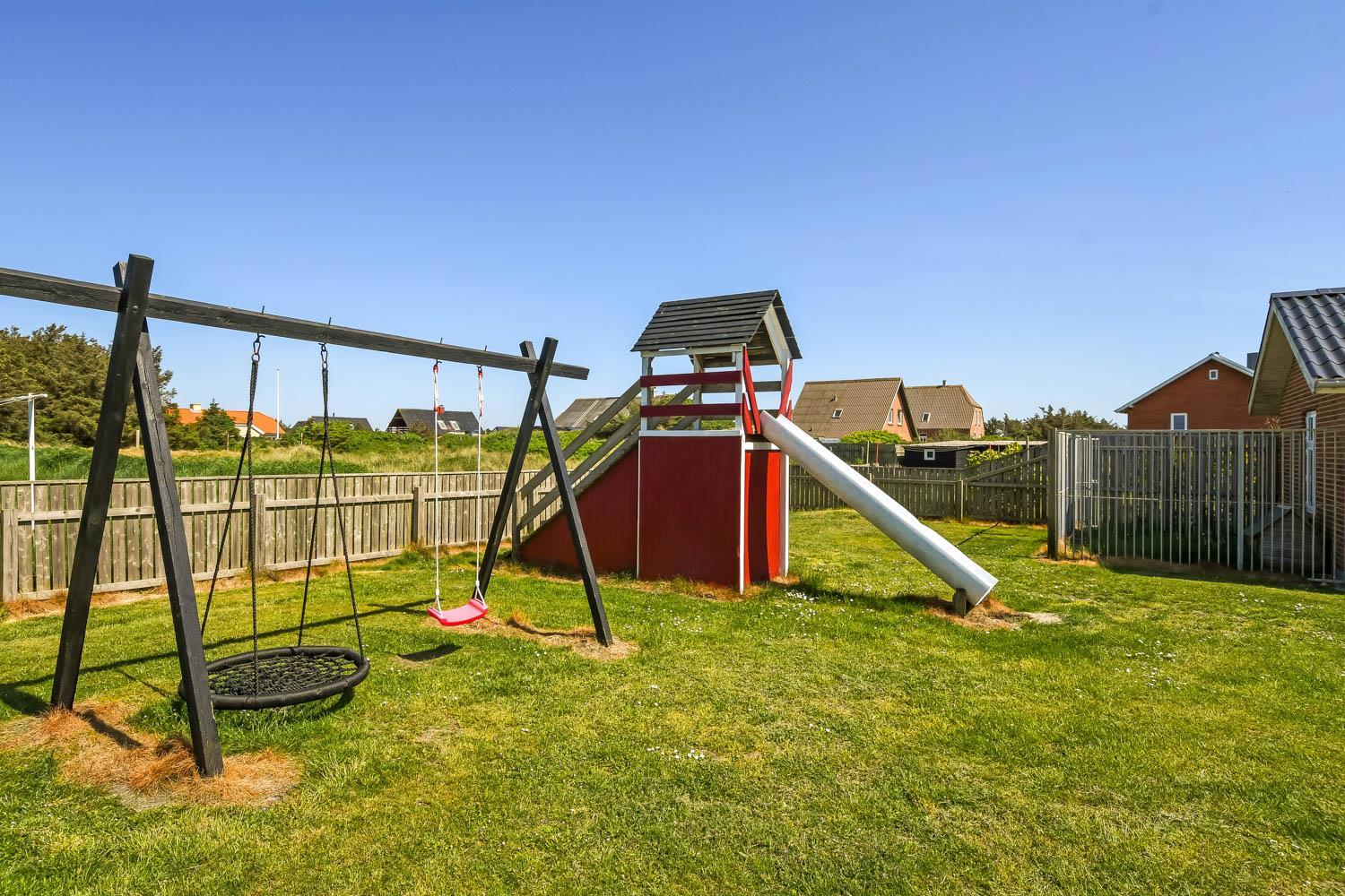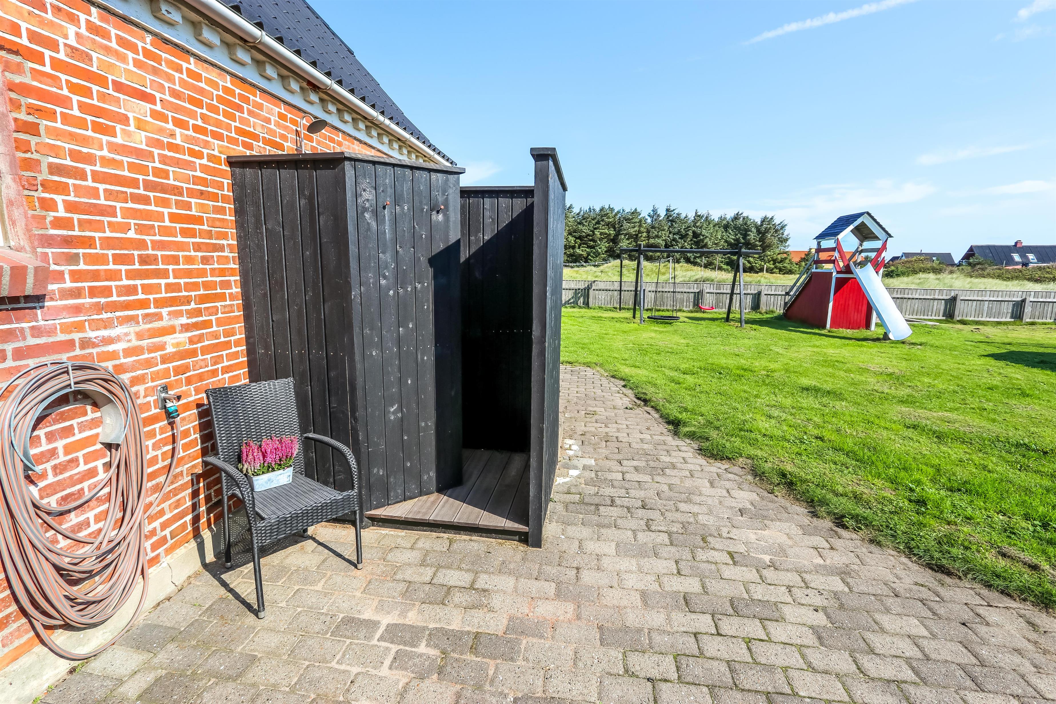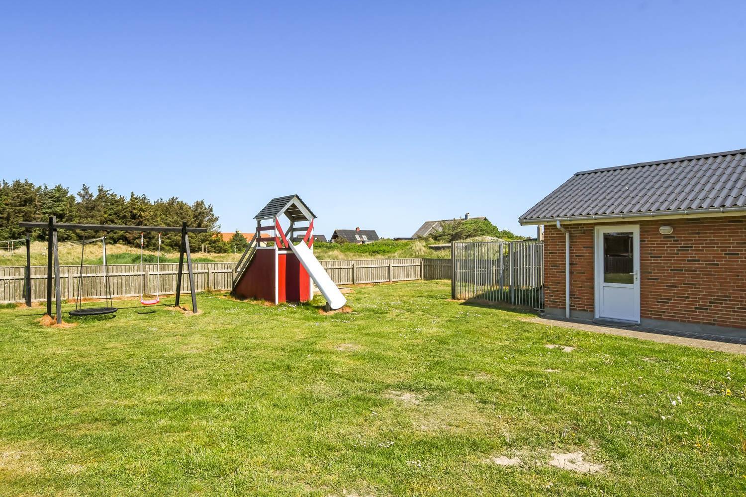 Den 5.000 m² store grund byder på masser af plads. En flot, indhegnet terrasse med læ mod vest har havemøbler, grill og liggestole. Den indhegnede have har mange læ-fyldte områder samt en sandkasse og et legehus med rutsjebane – en ideel have for både børn og hunde.