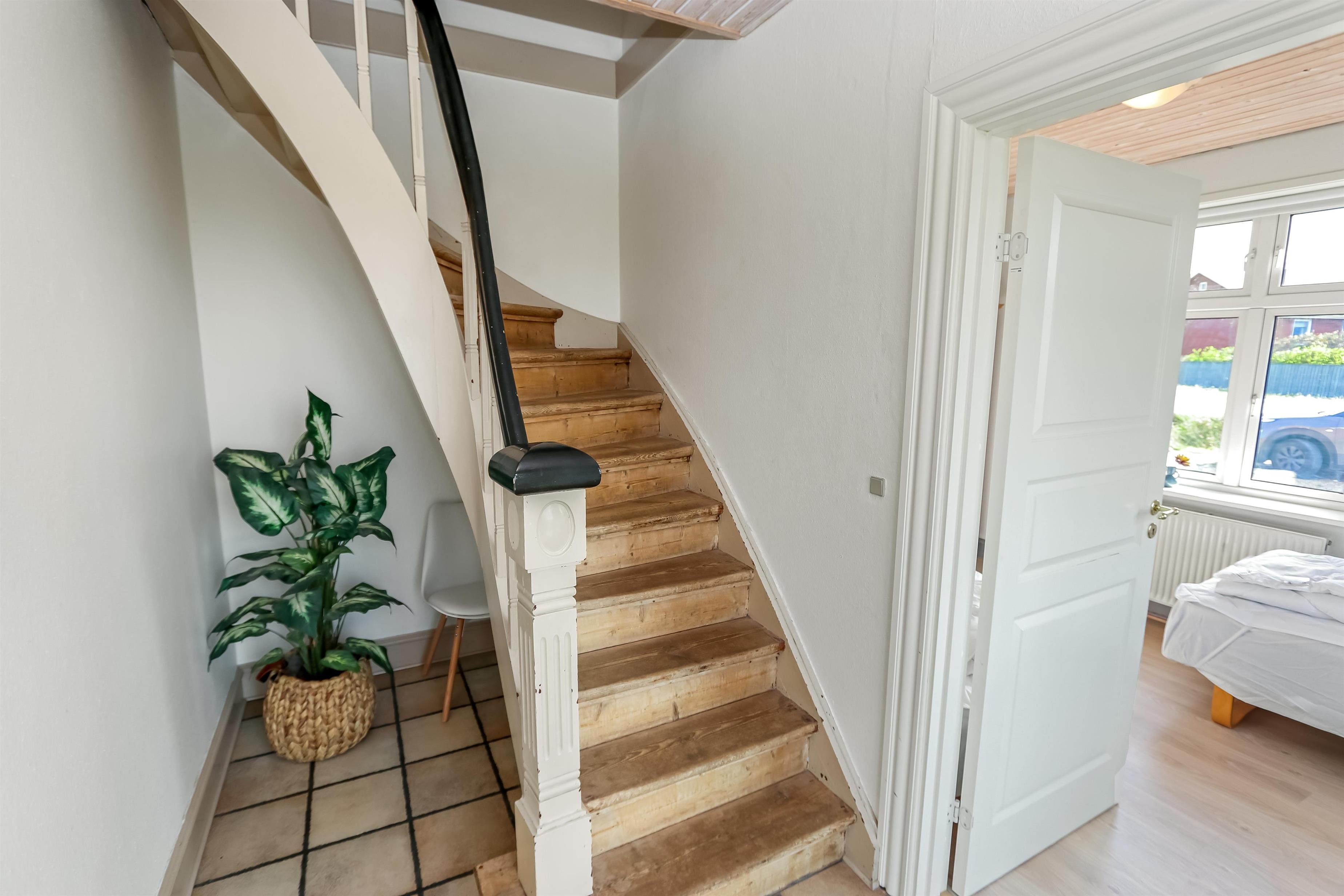 Fra entréen fører trappen op til 1. sal. Her er der en ekstra stue med en stor, lækker sofa med chaiselong og et ekstra fladskærms-tv med danske og tyske kanaler. Der står også en PlayStation med spil klar til brug, som også kan bruges til afspilning af DVD/Blu-ray.