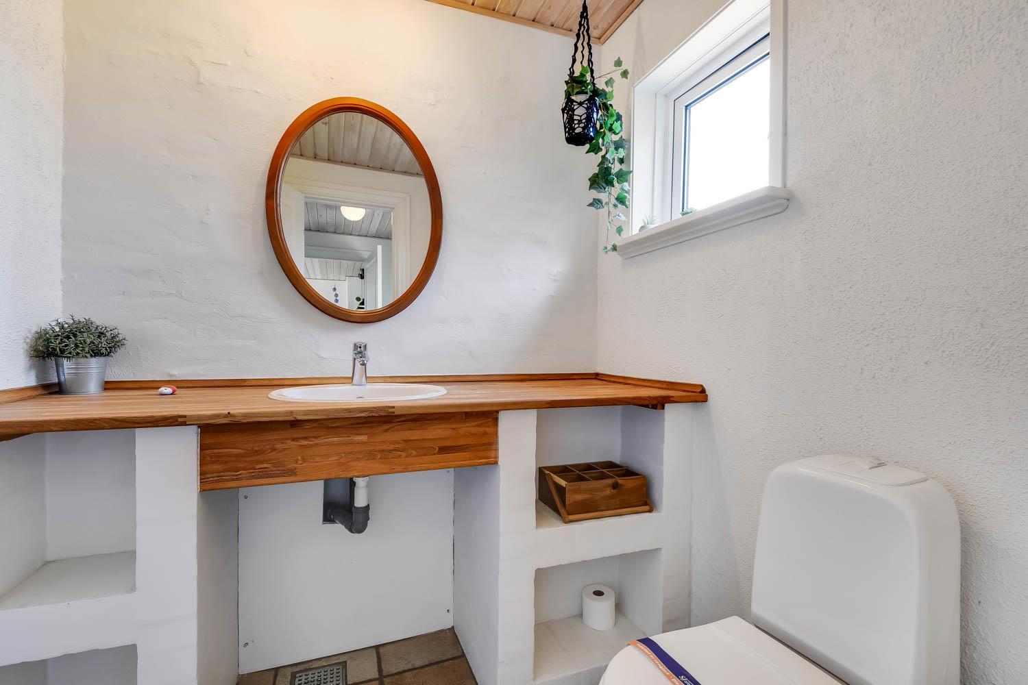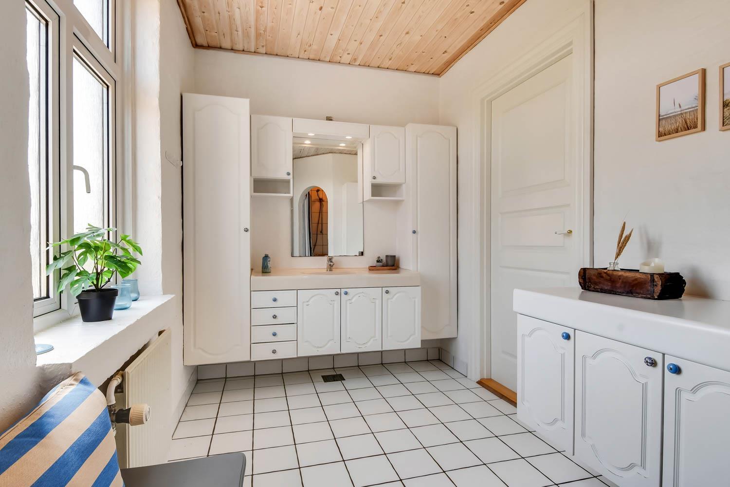 Det flotte og stilrene køkken er udstyret med bl.a. keramiske kogeplader, emhætte, indbygningsovn, mikroovn og et stort køleskab samt fryseboks. Entré, opholdsstue og køkken har alle praktiske klinkegulve. Huset har også et renoveret, dejligt og praktisk bryggers med masser af opbevaringsplads, vaskemaskine og tørretumbler. I stueetagen er der et stort badeværelse med toilet, håndvask, muret bruseniche og klinkegulv med gulvvarme, samt et lille badeværelse med toilet og håndvask.