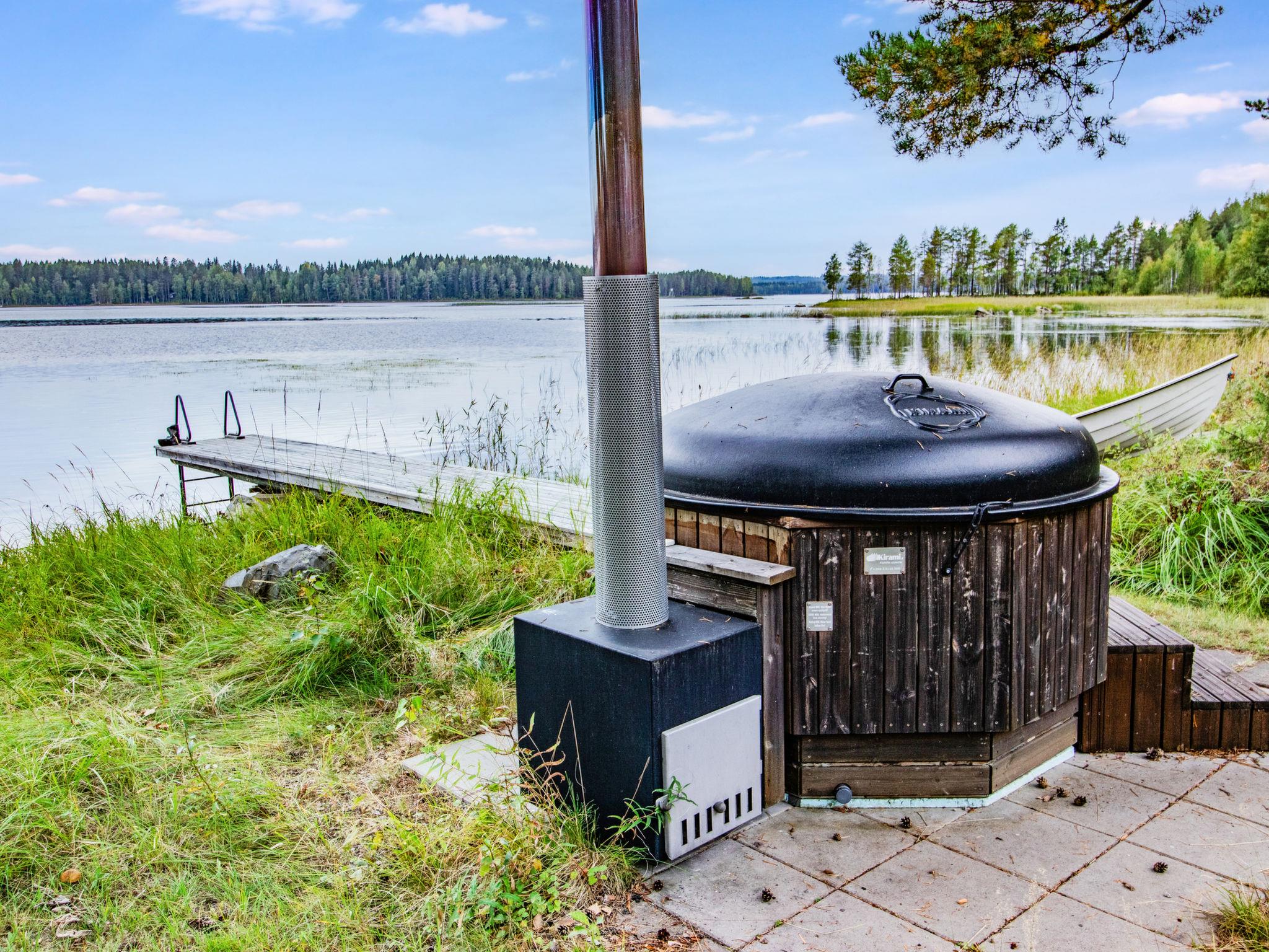 The cabin features a kitchen/living room, living area with one bed, and two bedrooms—one with a double bed and a separate single bed, and the other with two single beds. You’ll also have access to a separate WC, a washroom with a shower, and a traditional wood-heated sauna. Near the shoreline, there is a grill hut. A wood-heated hot tub is available for rent at an additional cost.
