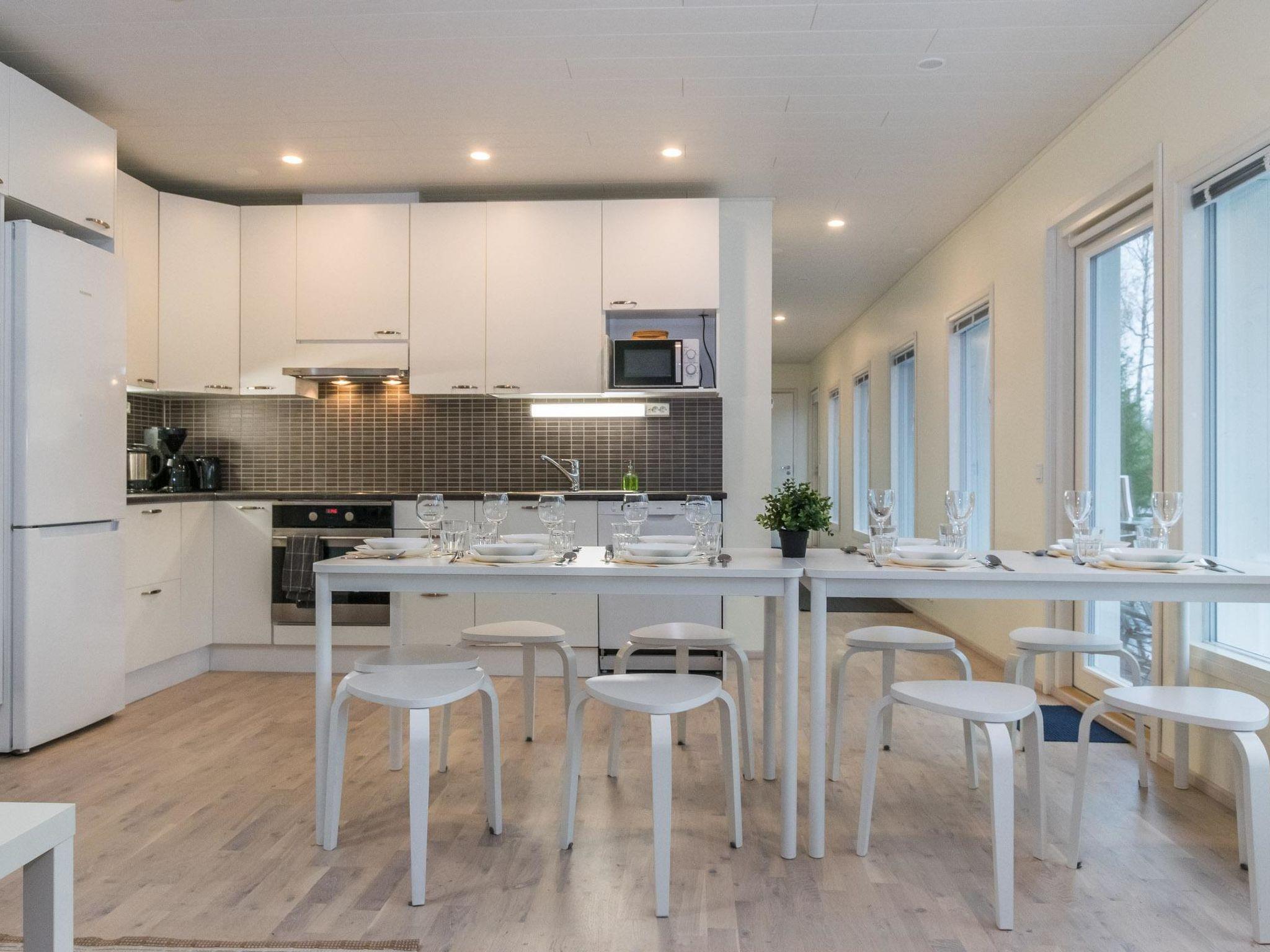 Inside the cabin, there's a generous dining area that comfortably seats the whole group for meals, providing an ideal setting for a holiday getaway.