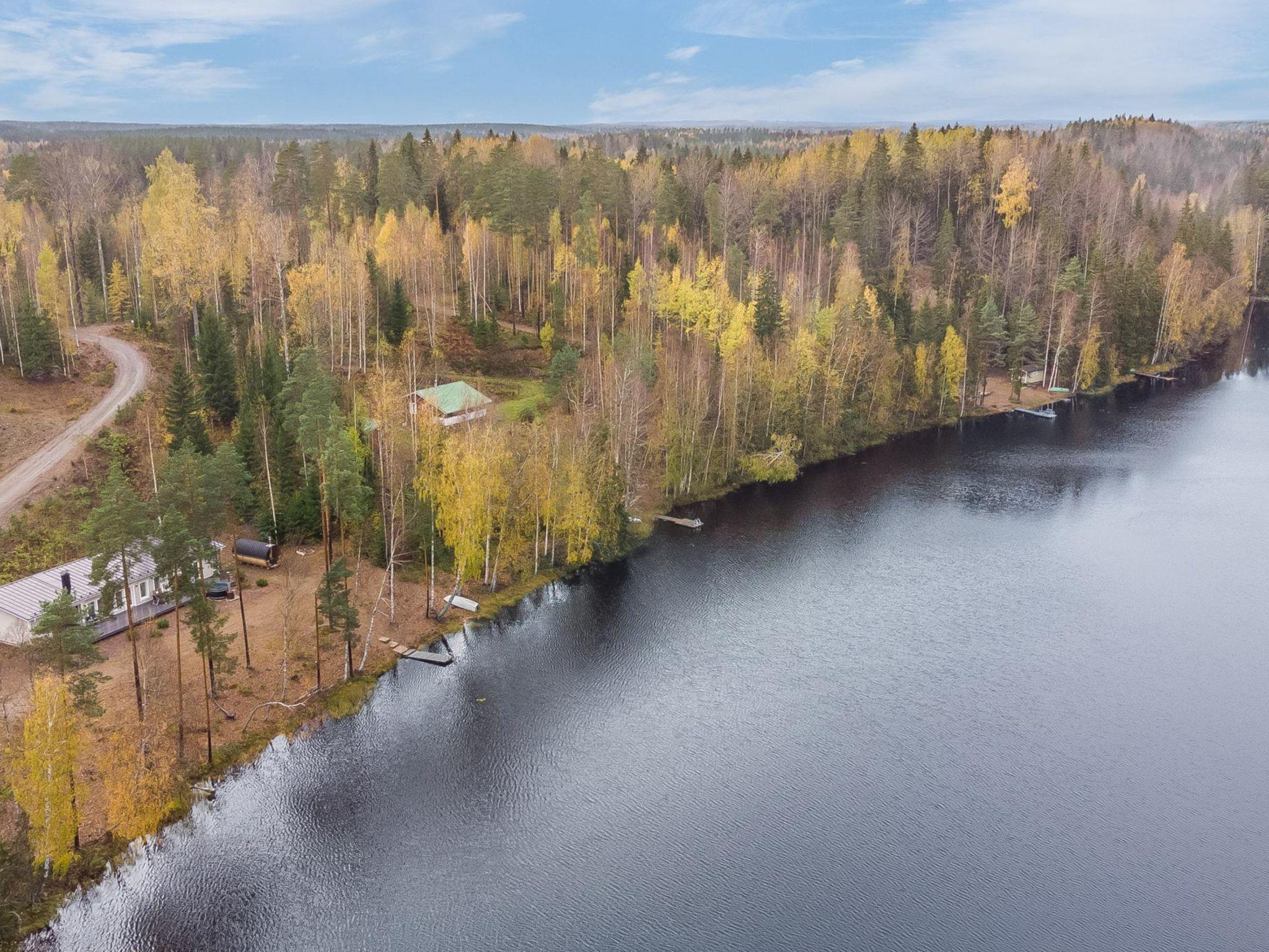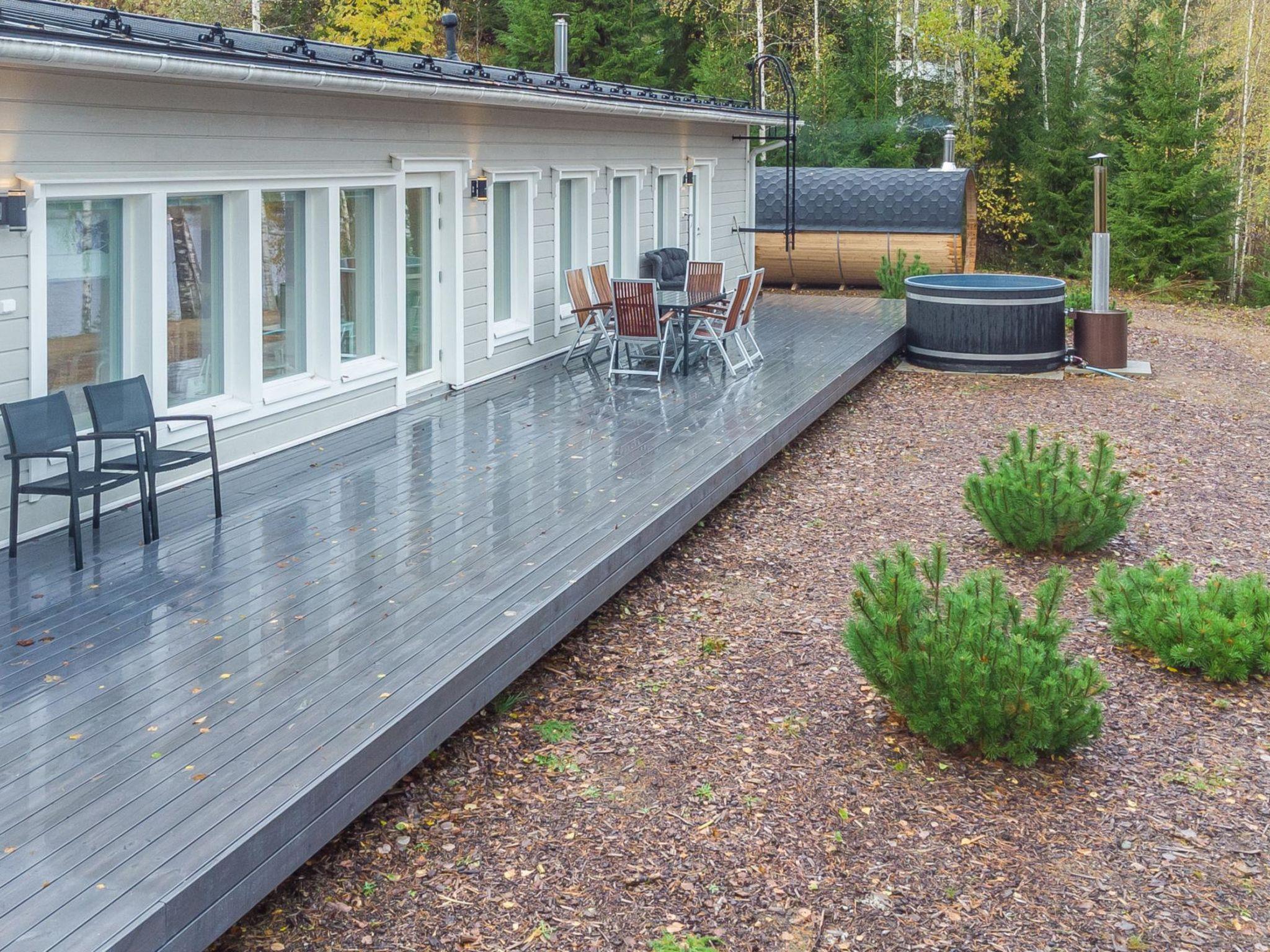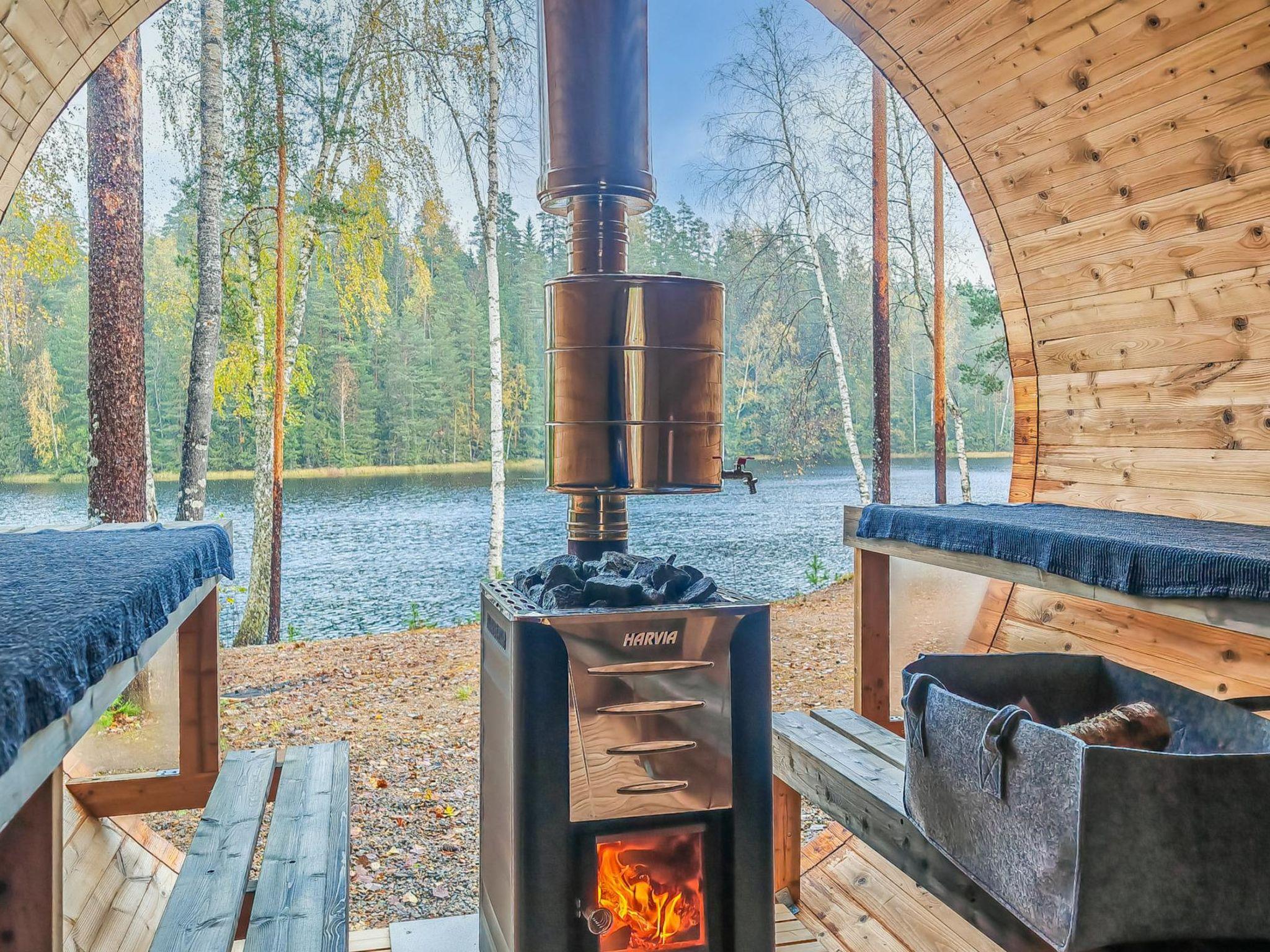 Villa Renkaranta cabin features a spacious, sunny yard and a terrace. The spacious wood-heated panoramic sauna comfortably accommodates larger groups, providing a stunning view of the lake through its panoramic window. The cabin's terrace features a wood-heated hot tub, just a short distance from both the panoramic sauna and the cabin's wood sauna.