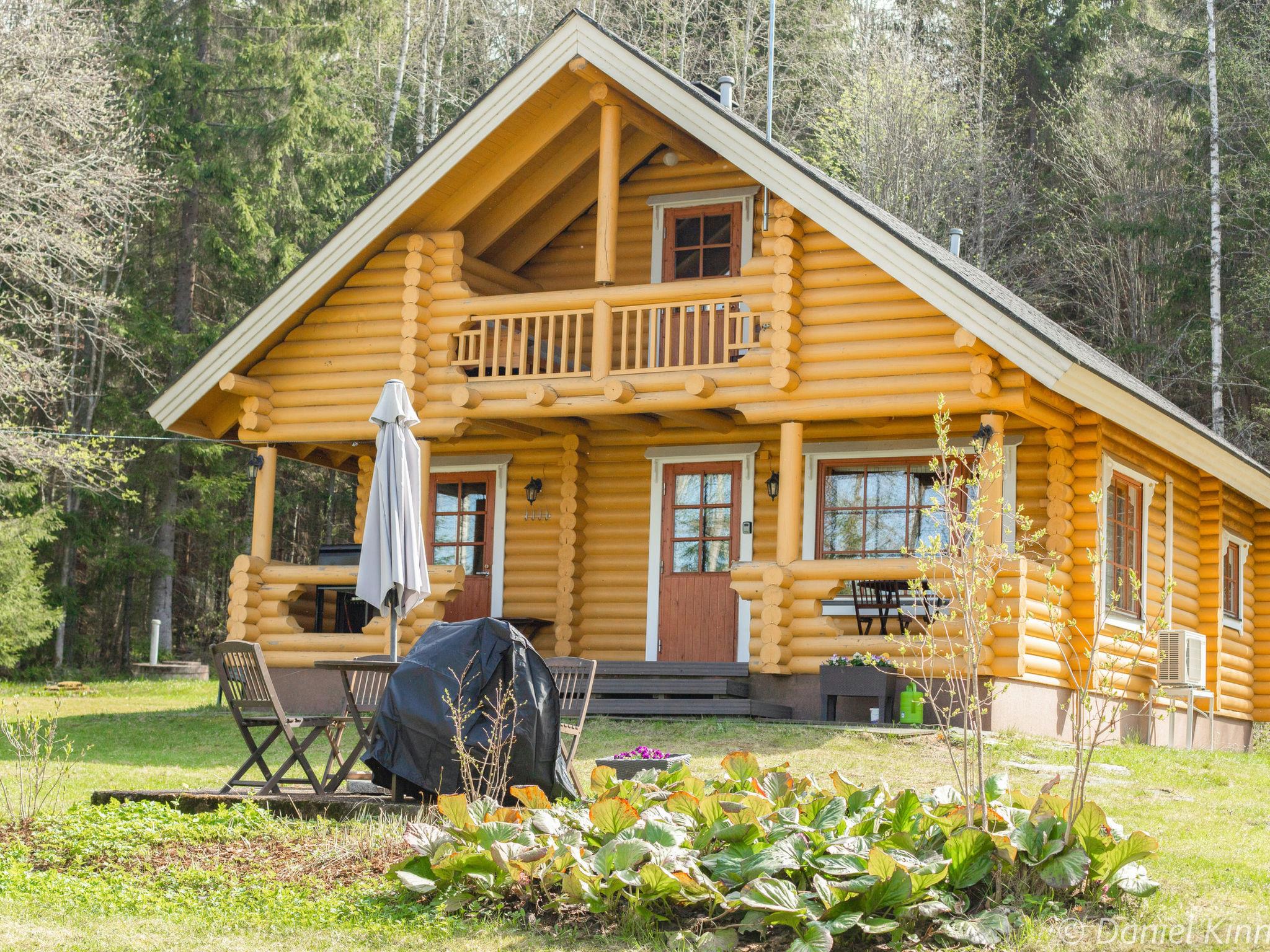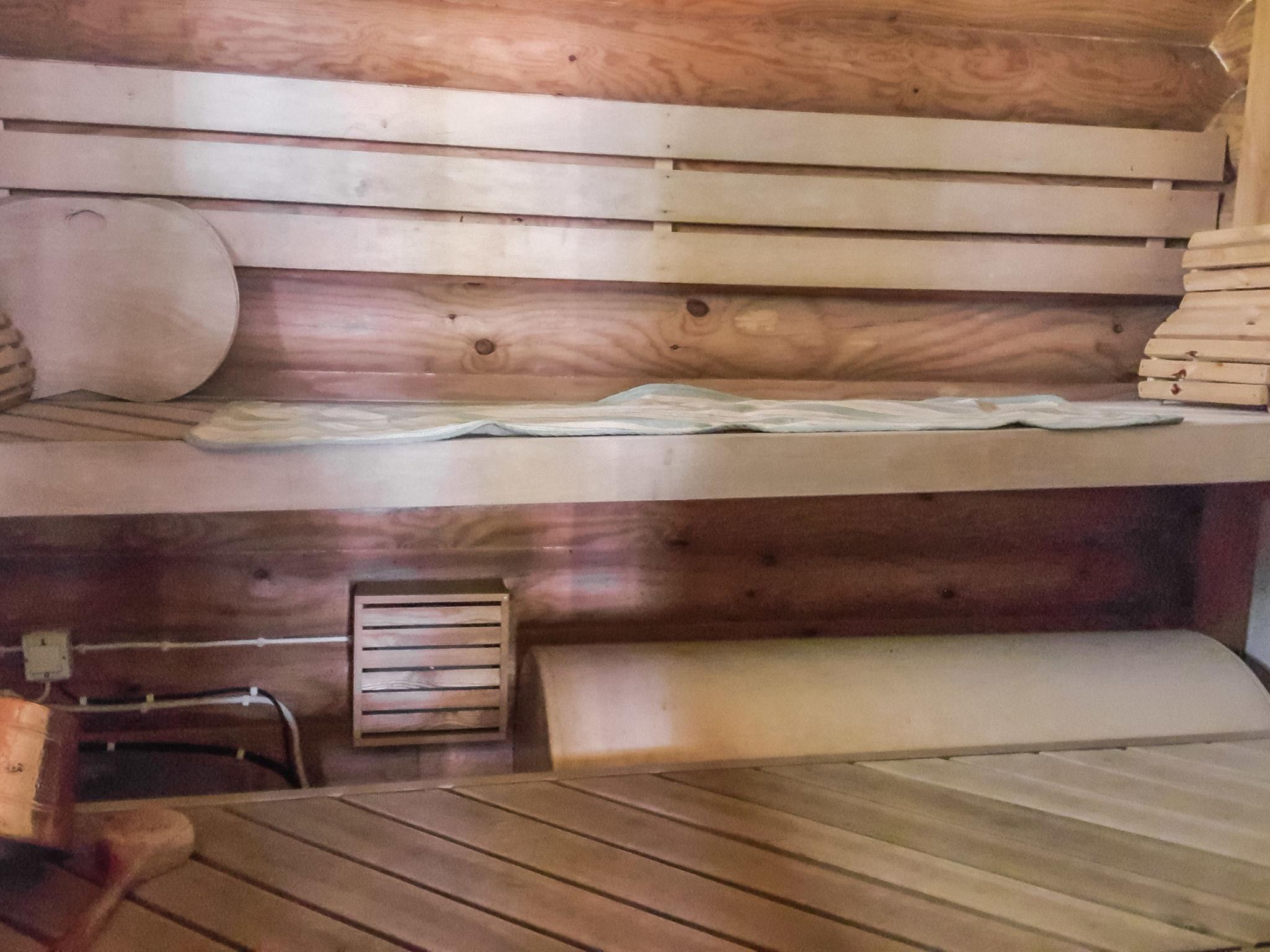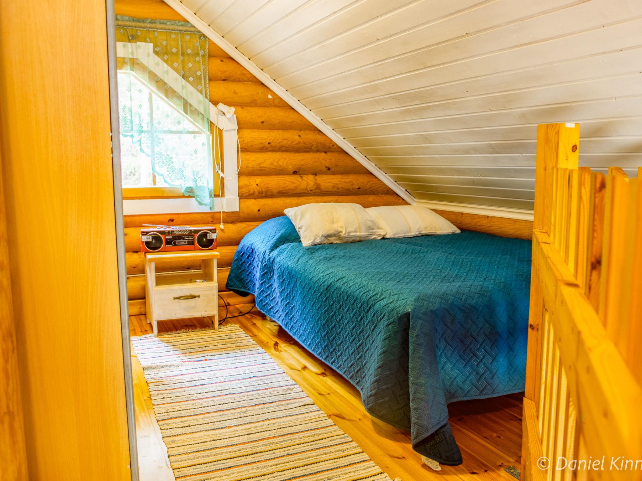 Log cottage 2003, living room/kitchen, alcove double bed (width 140 cm), sleeping loft double bed (width 140 cm), single bed (width 90 cm) and sofa bed (area 18 m², sloping ceilings, highest point 2 m, steep stairs to sleeping loft), dressing room, sauna, open porch and balcony. Access to sauna through porch.
