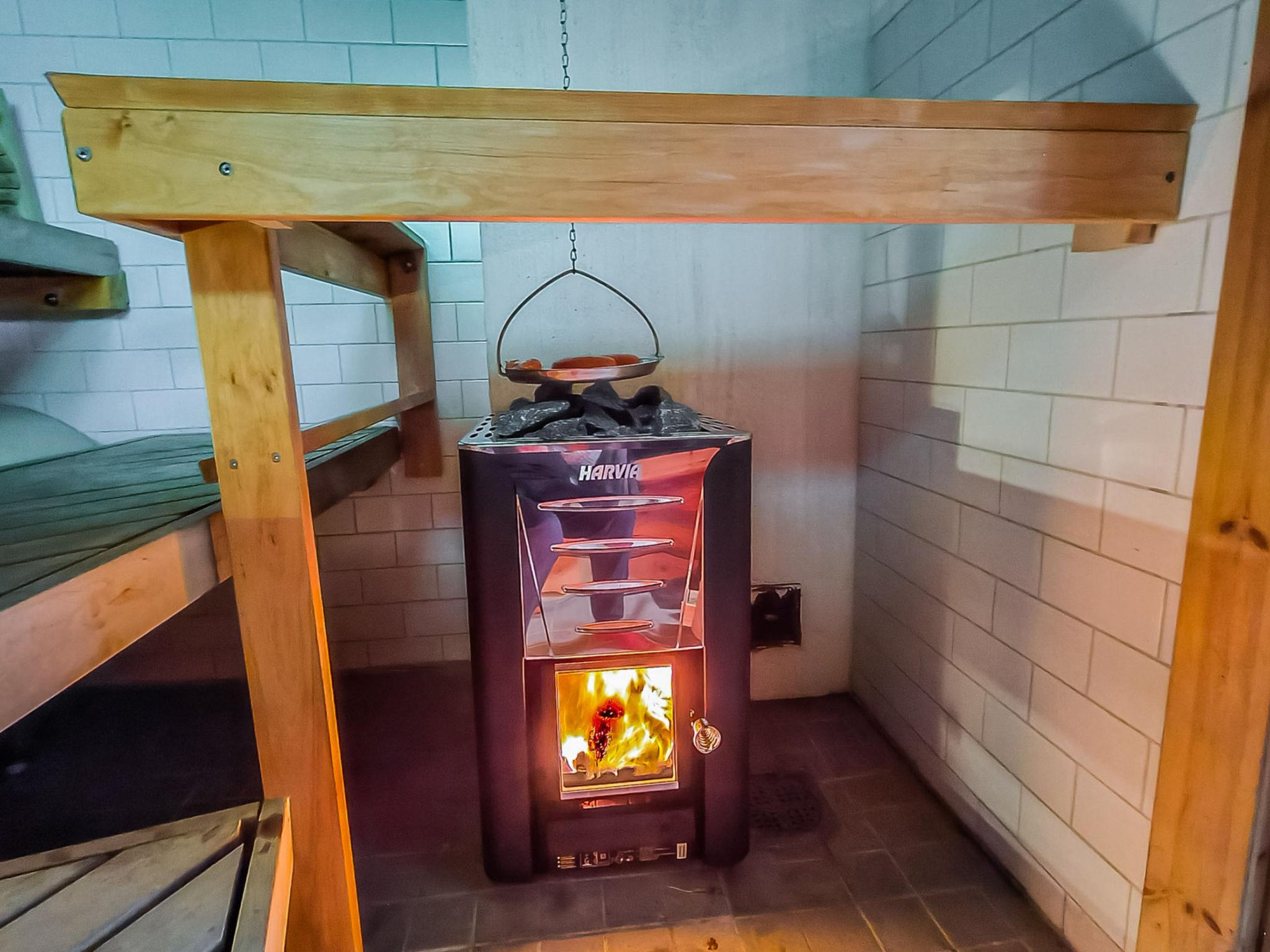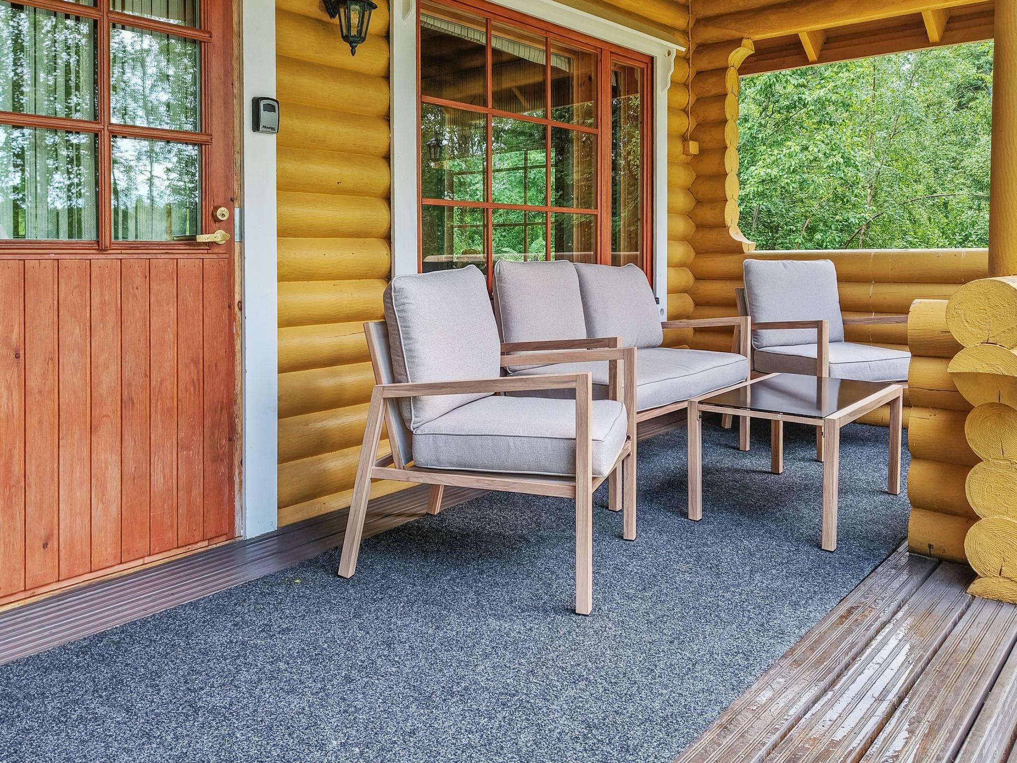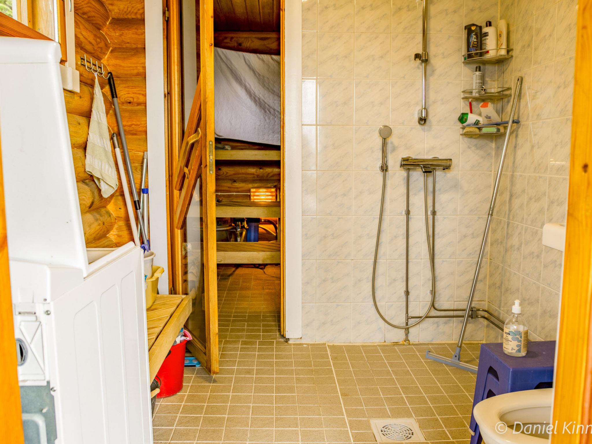 Log cottage 2003, living room/kitchen, alcove double bed (width 140 cm), sleeping loft double bed (width 140 cm), single bed (width 90 cm) and sofa bed (area 18 m², sloping ceilings, highest point 2 m, steep stairs to sleeping loft), dressing room, sauna, open porch and balcony. Access to sauna through porch.