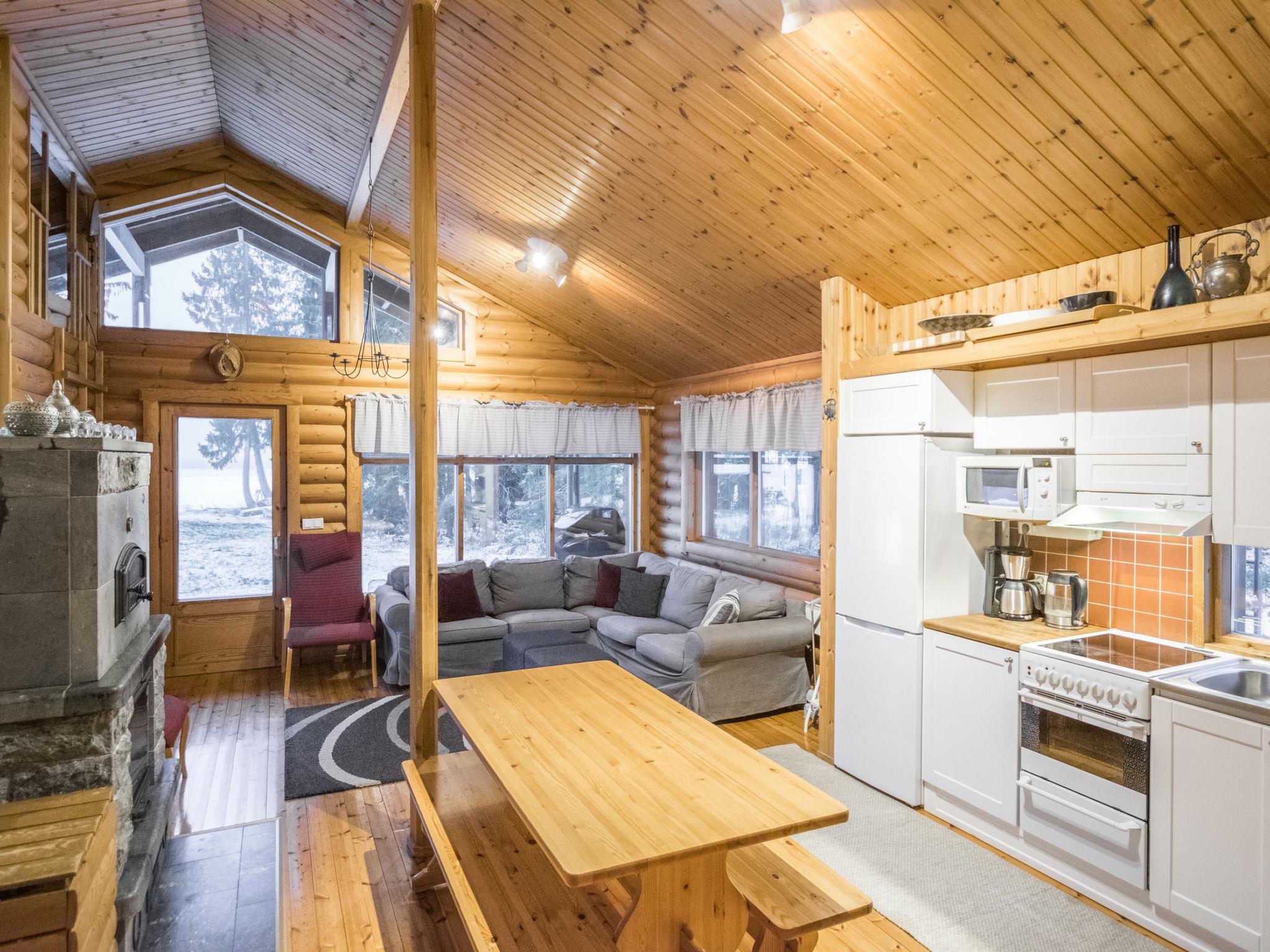 Wooden/log cottage 1994, living room/kitchen, bedroom 2 beds, second bedroom double bed, sleeping loft with folding door 2 beds and 2 mattresses, dressing room (convertible sofa as an alternative sleeping Place) , washroom, sauna (electric stove). Gas grill on the terrace.