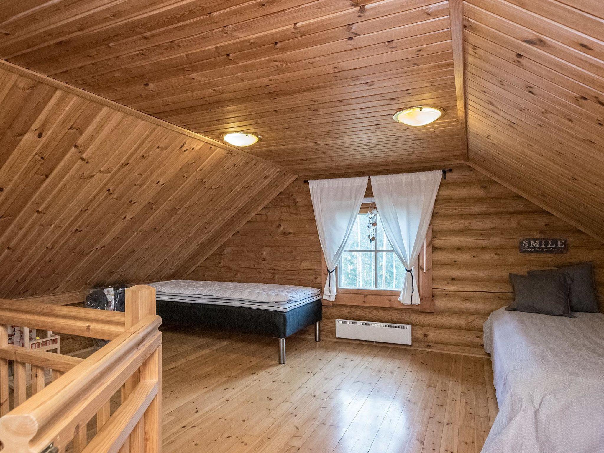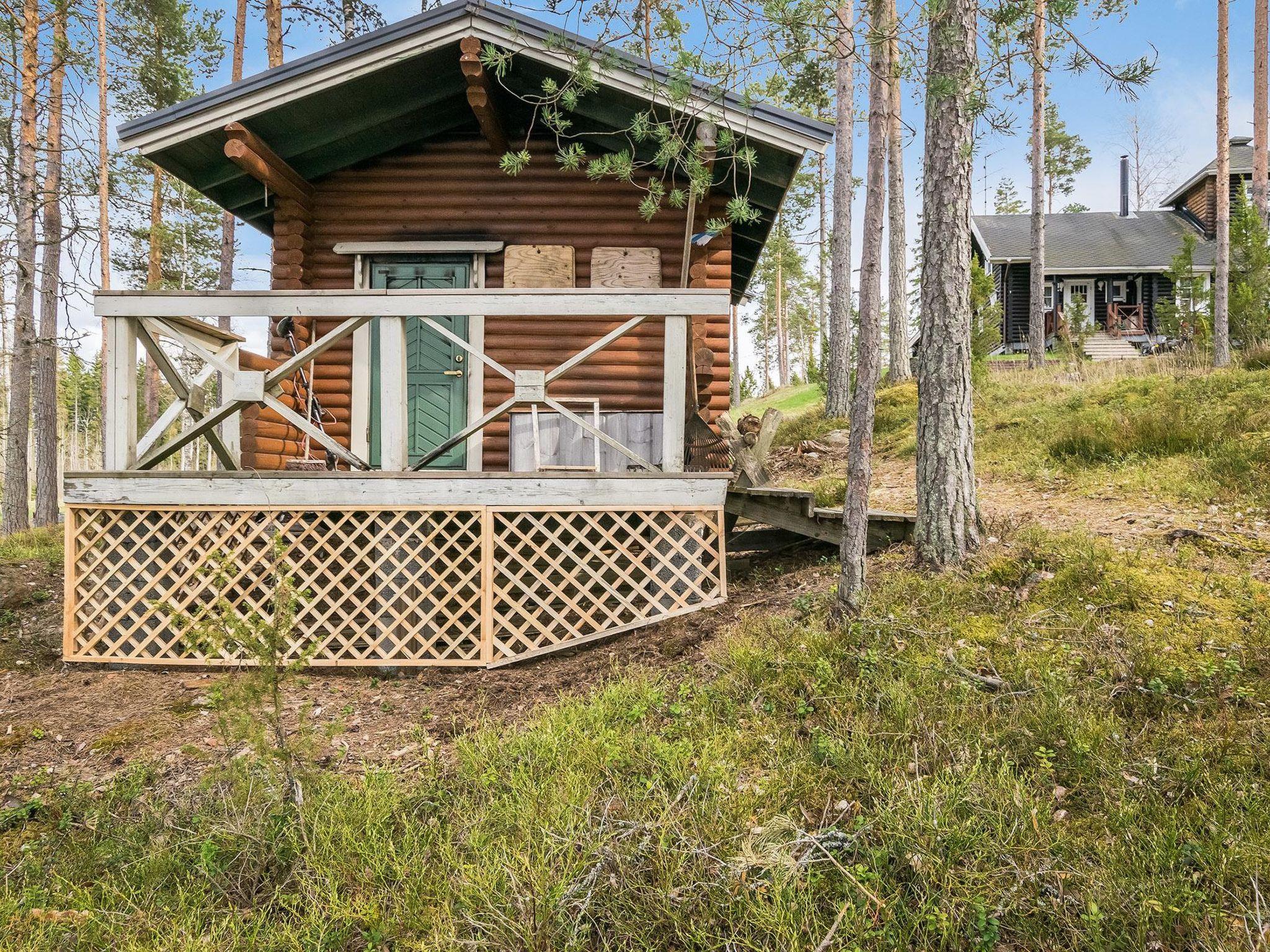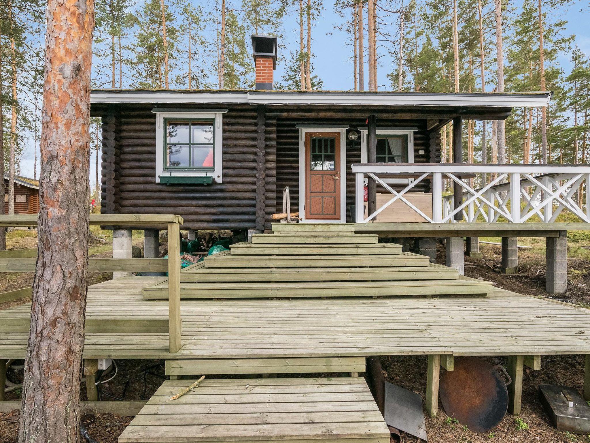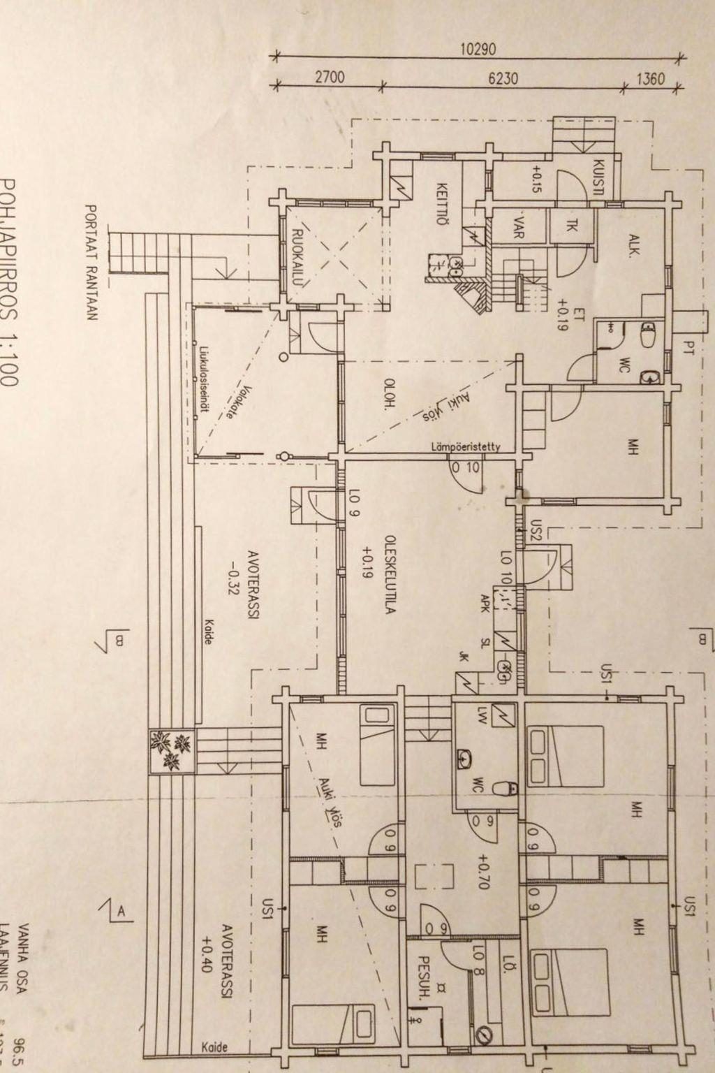 Log villa built in 2003, extended in 2020, the old part has living room, kitchen, bedroom (12 m²) double bed, bunk bed in the sleeping area, washroom with shower and WC, loft (20 m²) with four beds. Glazed terrace.