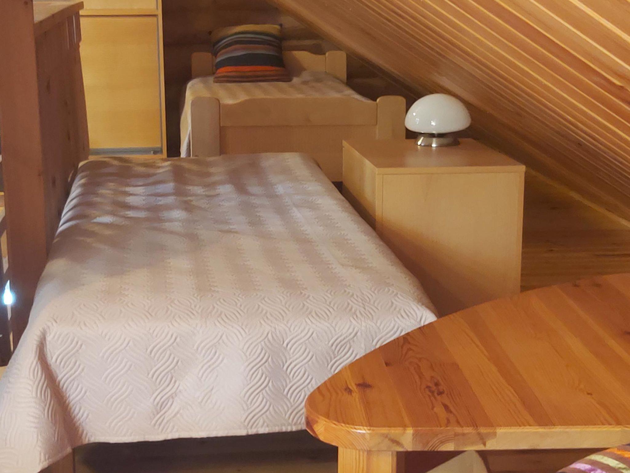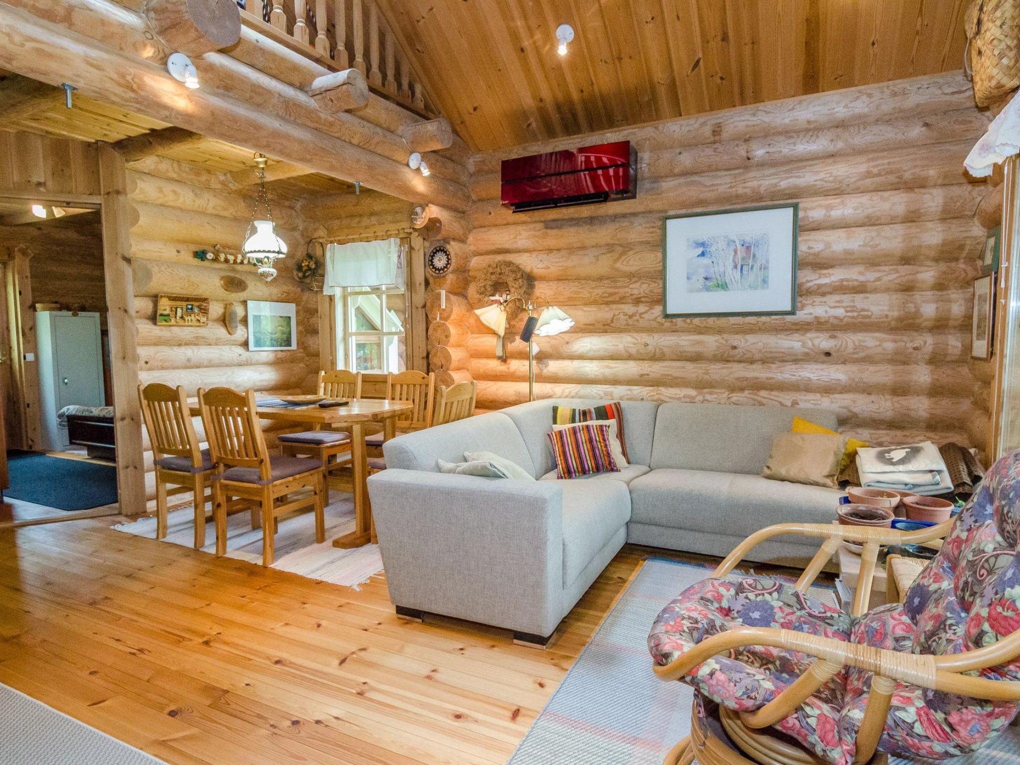 Log cabin 1997. Living room/kitchen, double bed in the bedroom, double bed and 3 beds in the spacious loft (50 m²), wood-heated sauna, glazed porch, balcony. Child gates at the top of the loft stairs. Airfryer in the kitchen. Wi-Fi 4G.