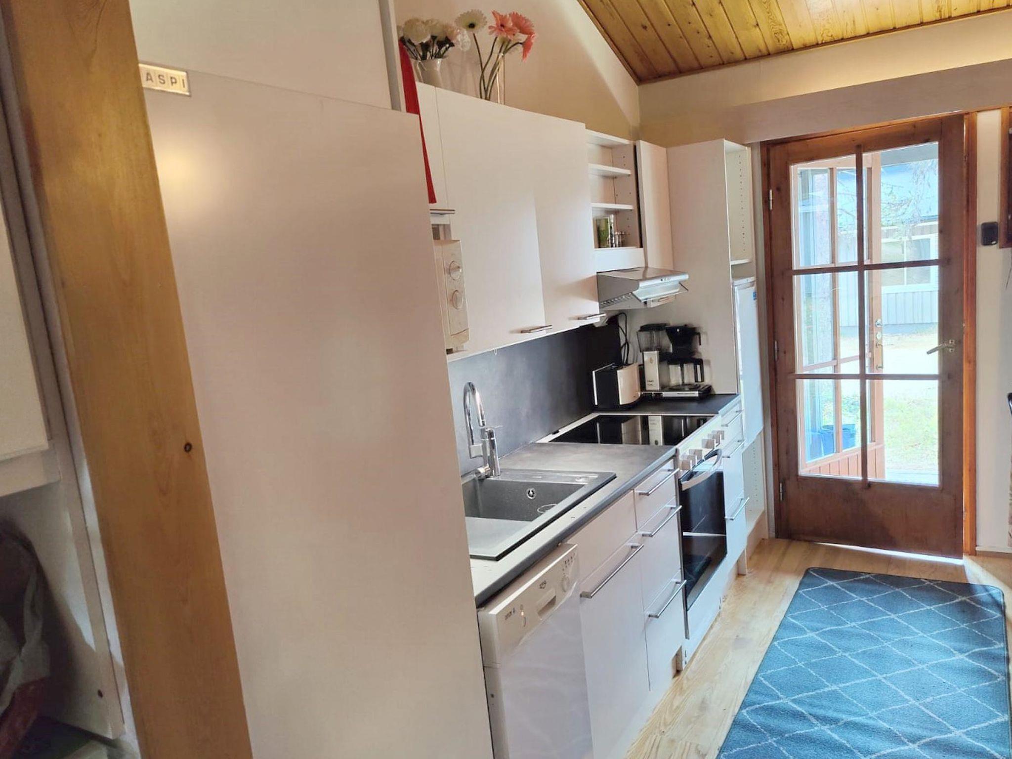 Apartment in wooden semi-detached house, built in 1983, afterwards renovated. Livingroom / kitchen with sofa bed, bedroom with 2 beds, loft with 2 beds, steep stairs to loft. Sauna, bathroom / toilet. Small covered terrace and storage.