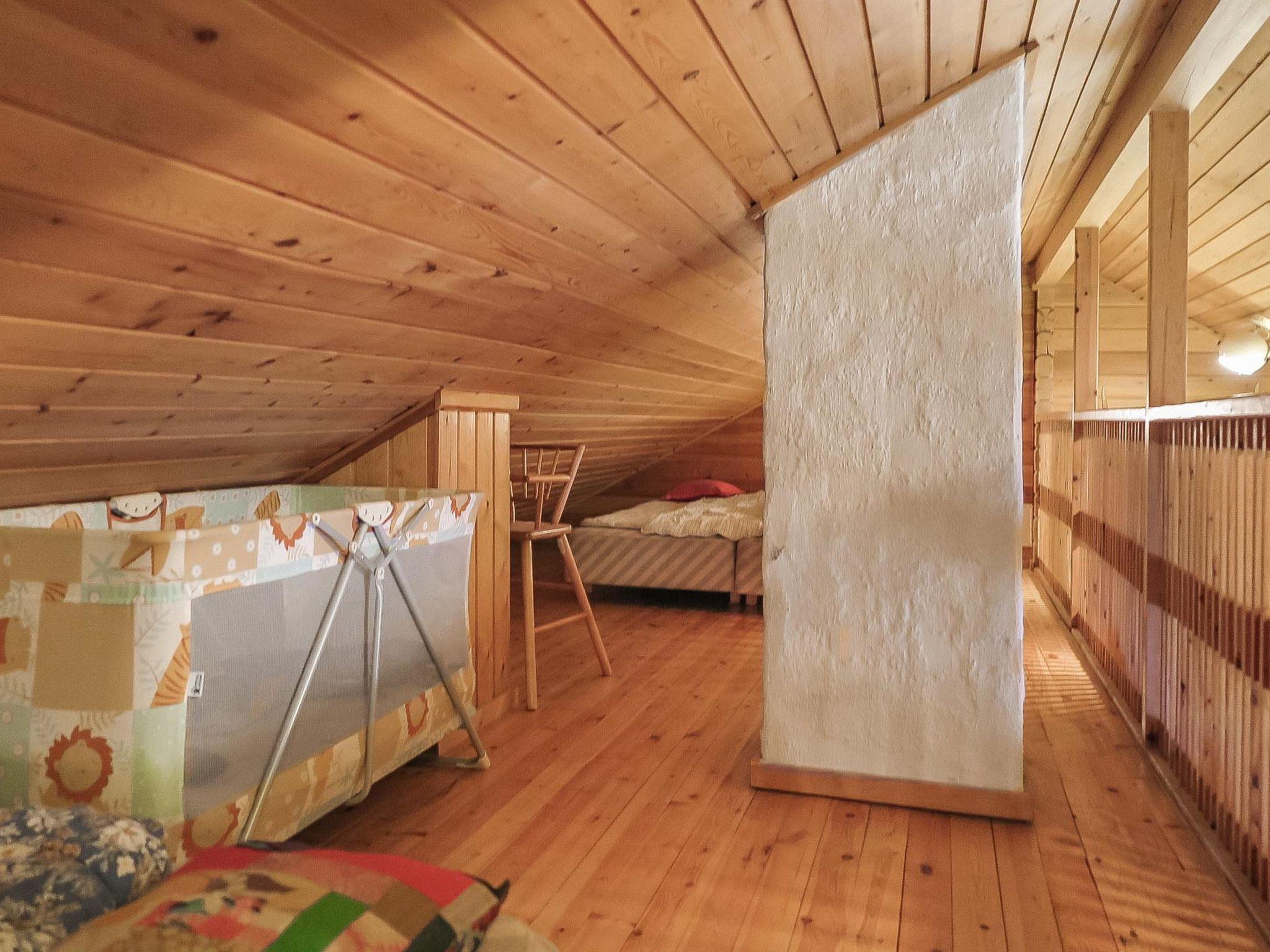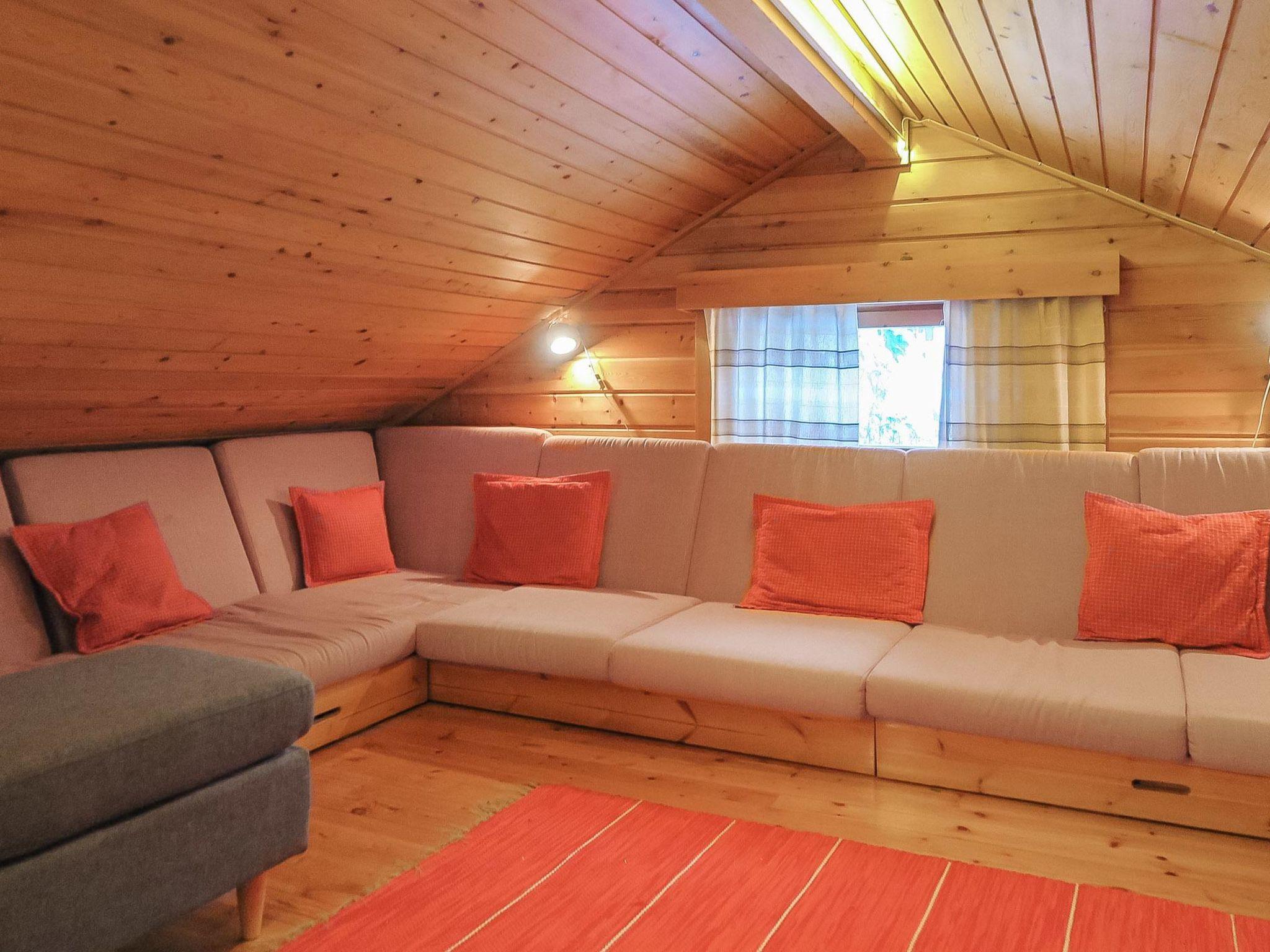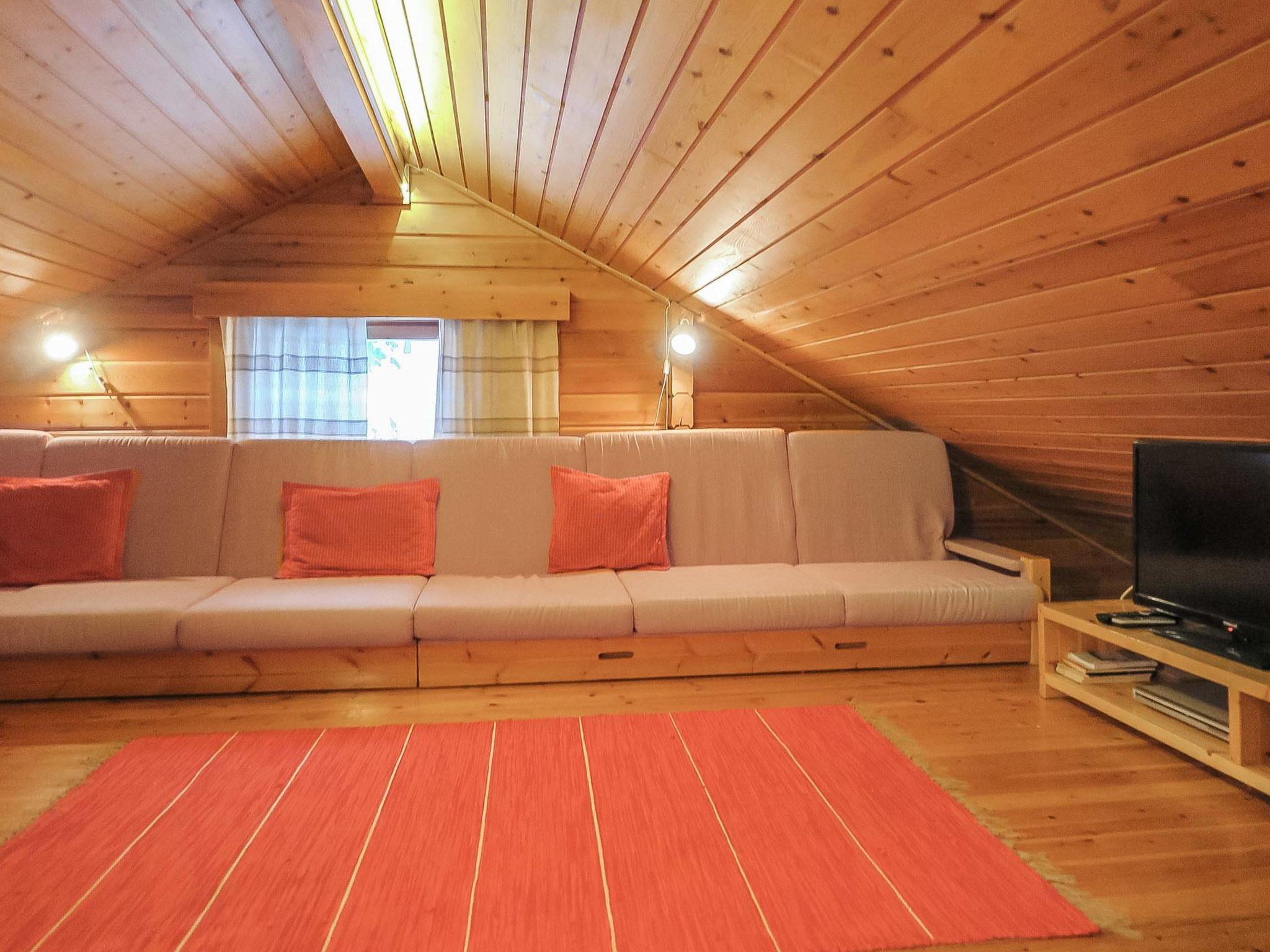 A living room, spacious kitchenette, three bedrooms all with 2 beds, spacious loft with 3 beds and a large corner sofa, steep stairs to the loft, sauna, washroom, dressing room, separate WC and covered terrace on southern/western side of the cabin.
