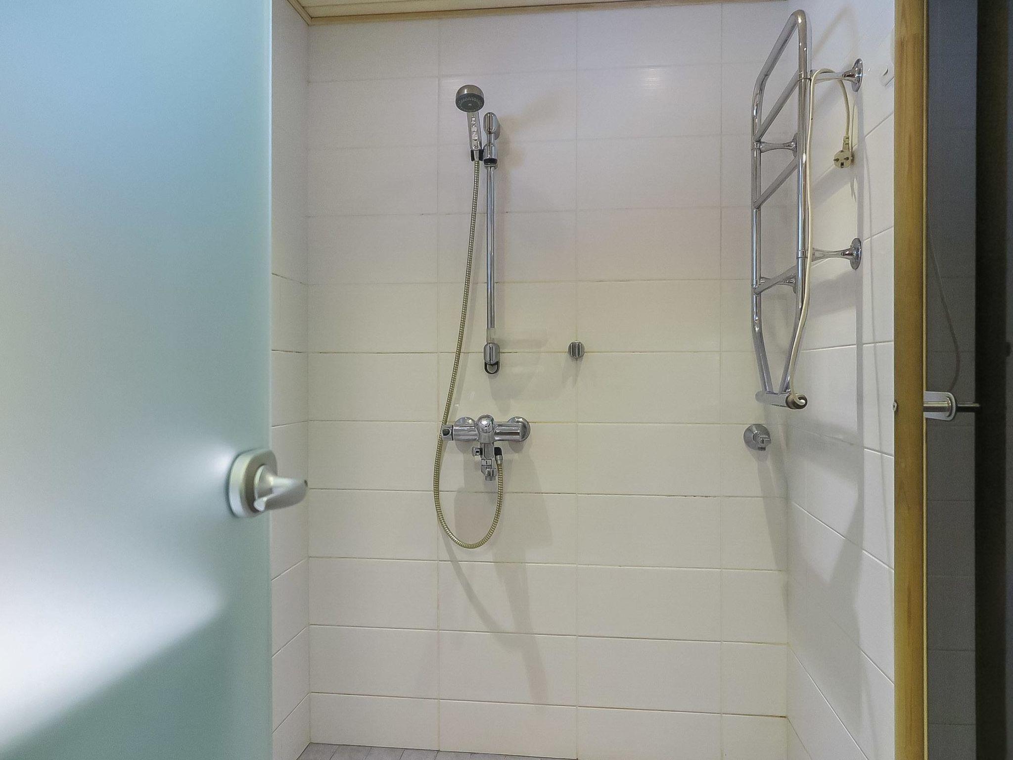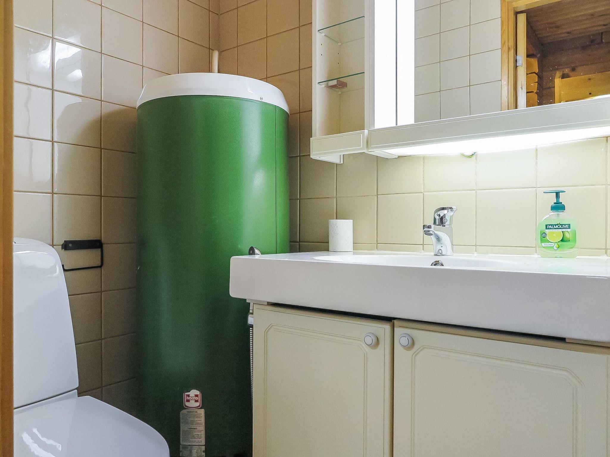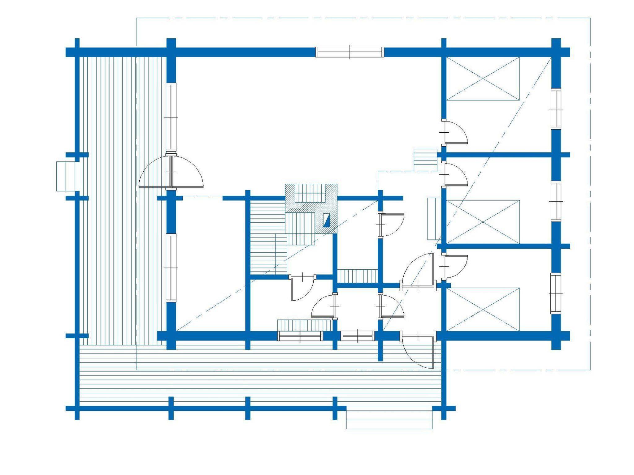 A living room, spacious kitchenette, three bedrooms all with 2 beds, spacious loft with 3 beds and a large corner sofa, steep stairs to the loft, sauna, washroom, dressing room, separate WC and covered terrace on southern/western side of the cabin.