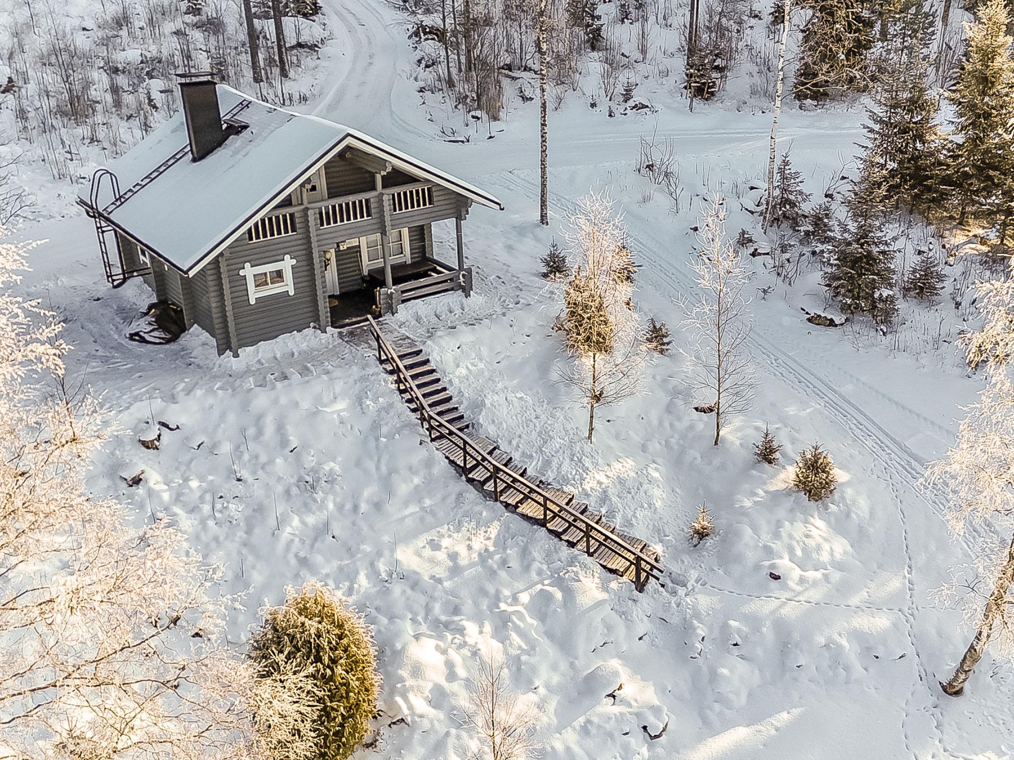 Log cottage 1993, living room/ kitchen, bedroom double bed, sleeping loft (10 m²) 2 beds, washroom, sauna, open porch and balcony. Access to sauna and shower through porch.