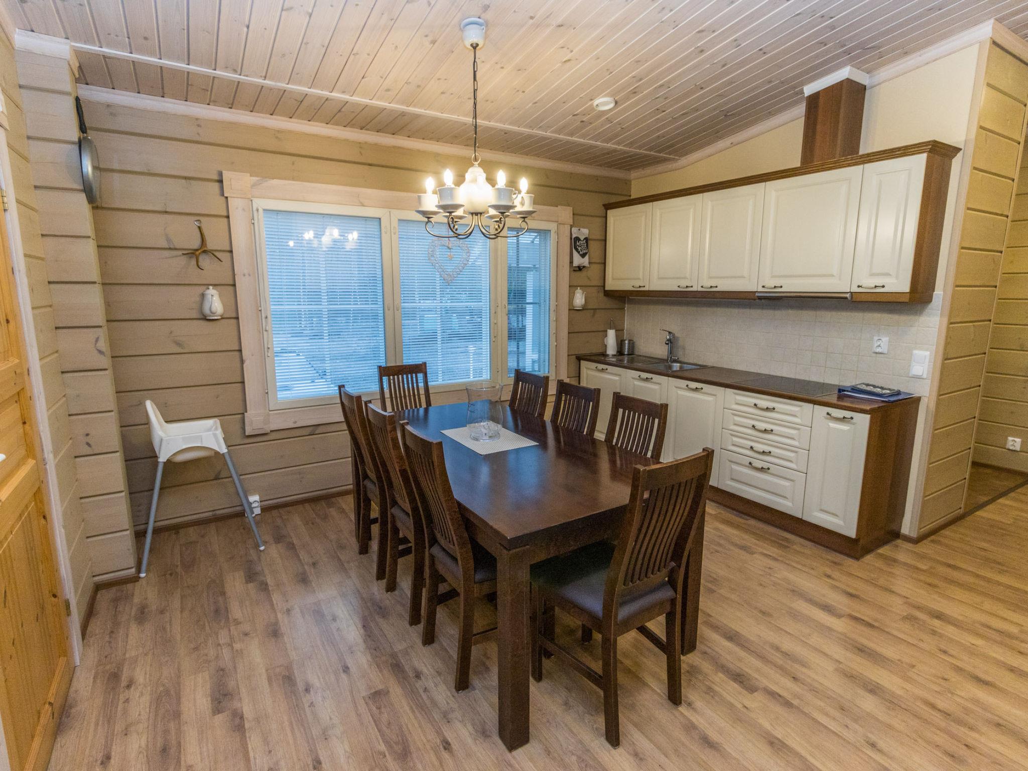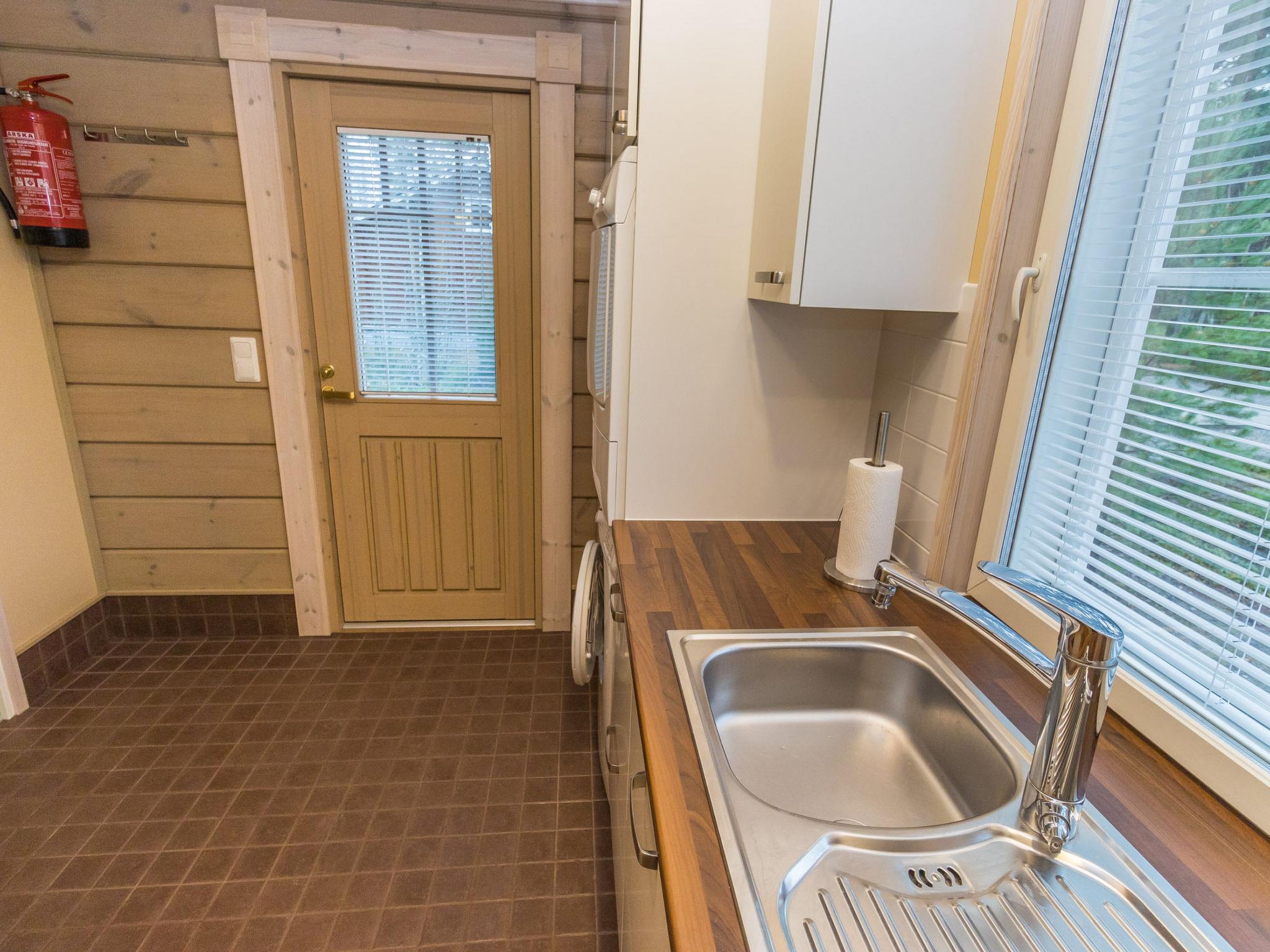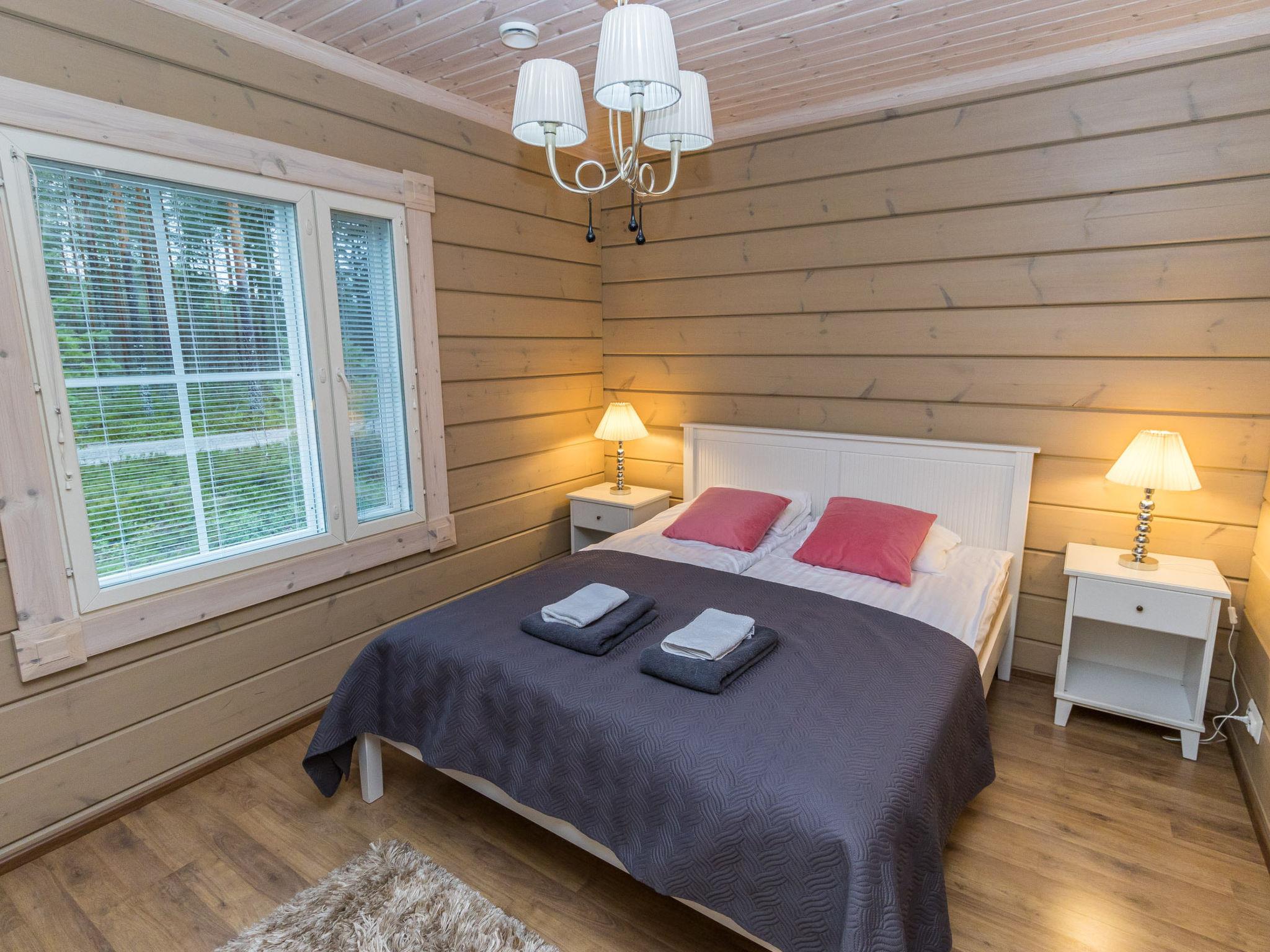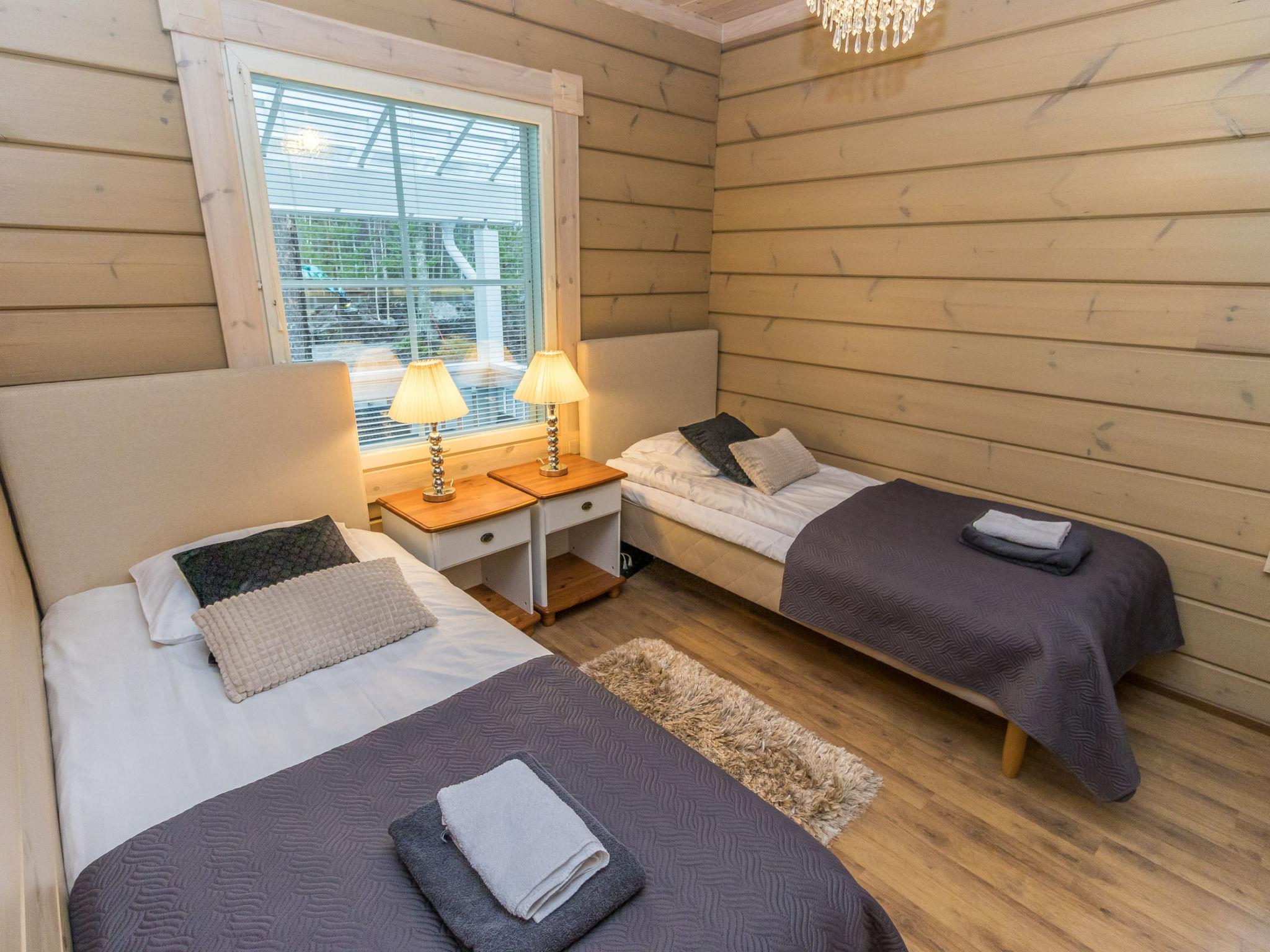 The cabin features three bedrooms: two with double beds and one with two separate 90 cm wide single beds. The spacious kitchen is connected to the living room and the utility room, which has its own outdoor access for cooling off after the sauna. From the utility room, you enter the washroom equipped with a shower and an electric sauna. The cabin also includes two separate WCs.