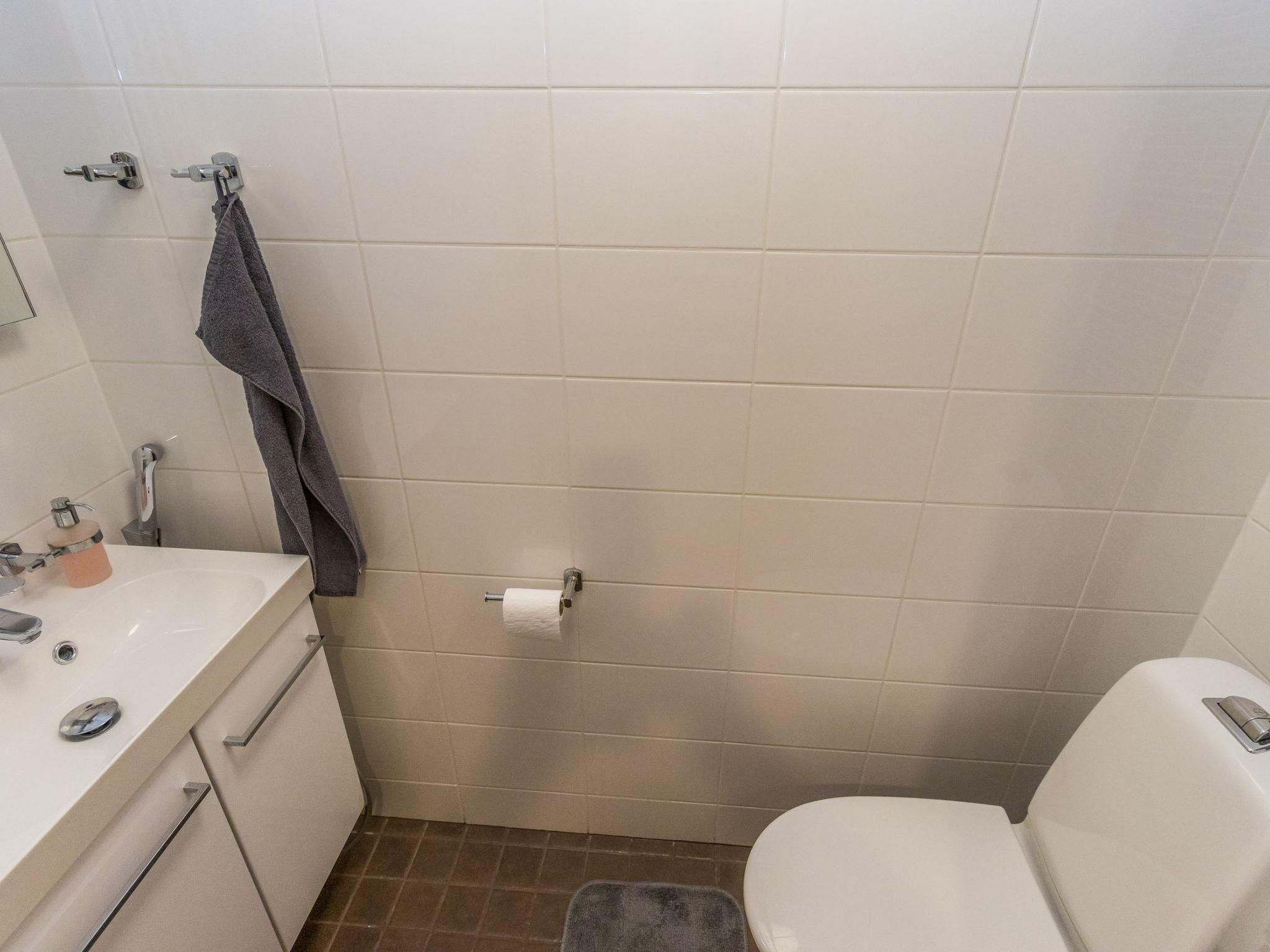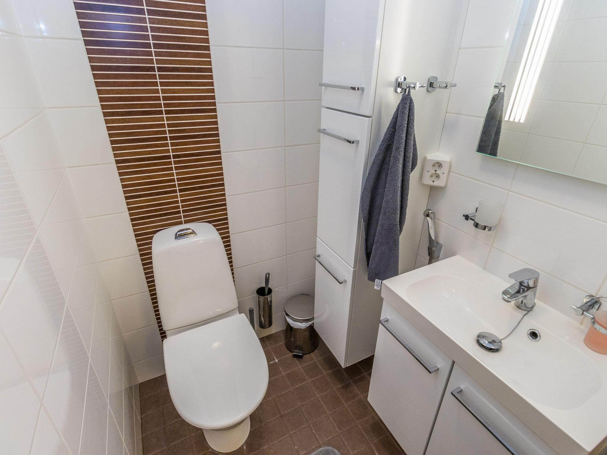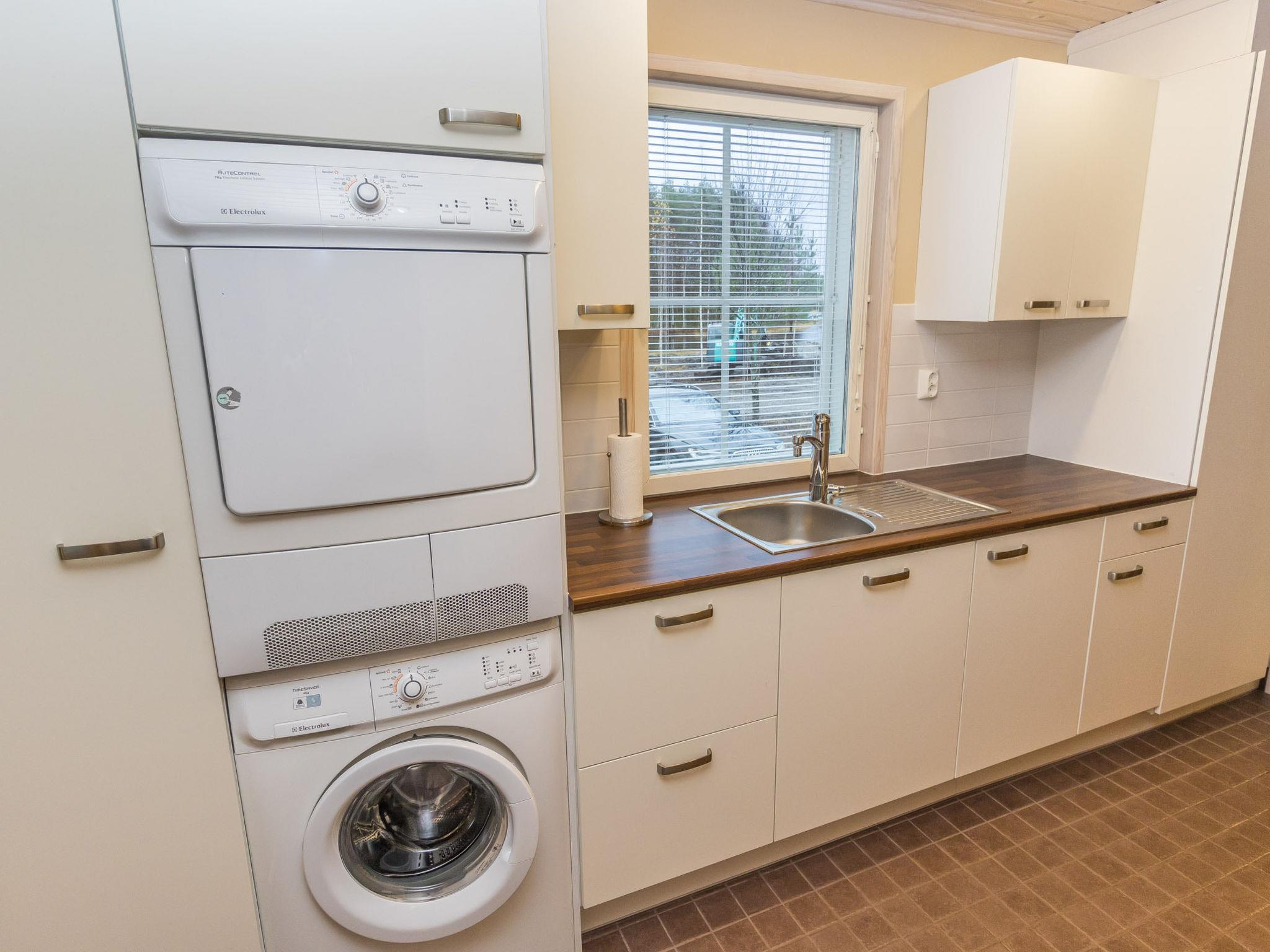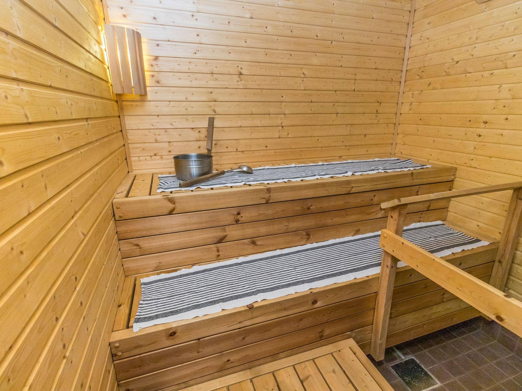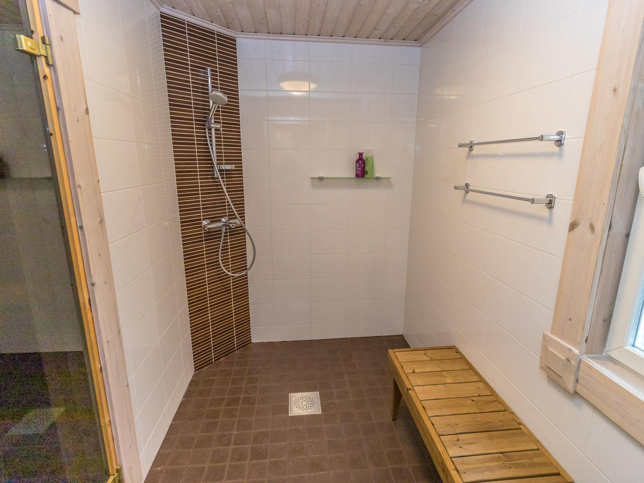 The cabin features three bedrooms: two with double beds and one with two separate 90 cm wide single beds. The spacious kitchen is connected to the living room and the utility room, which has its own outdoor access for cooling off after the sauna. From the utility room, you enter the washroom equipped with a shower and an electric sauna. The cabin also includes two separate WCs.