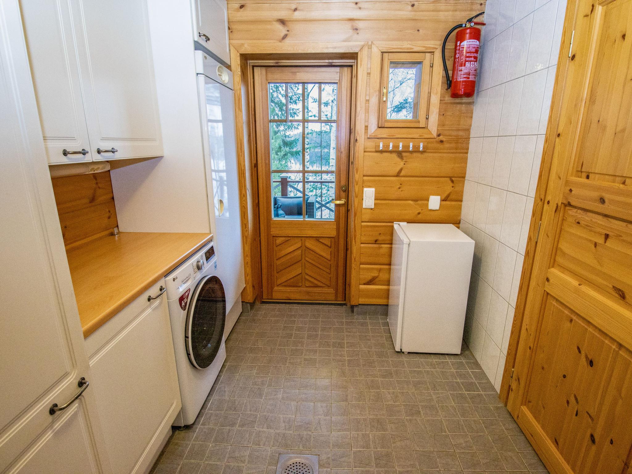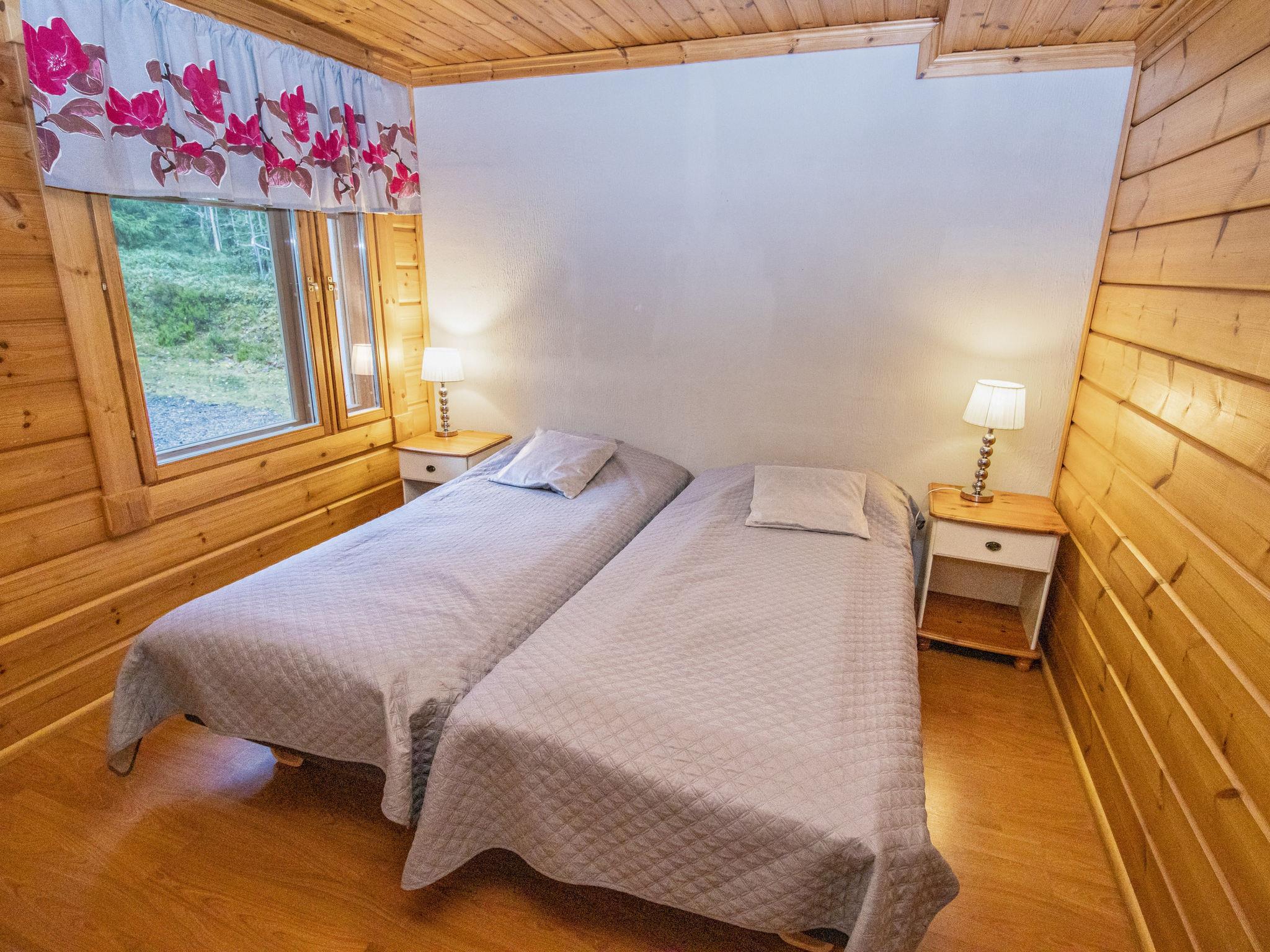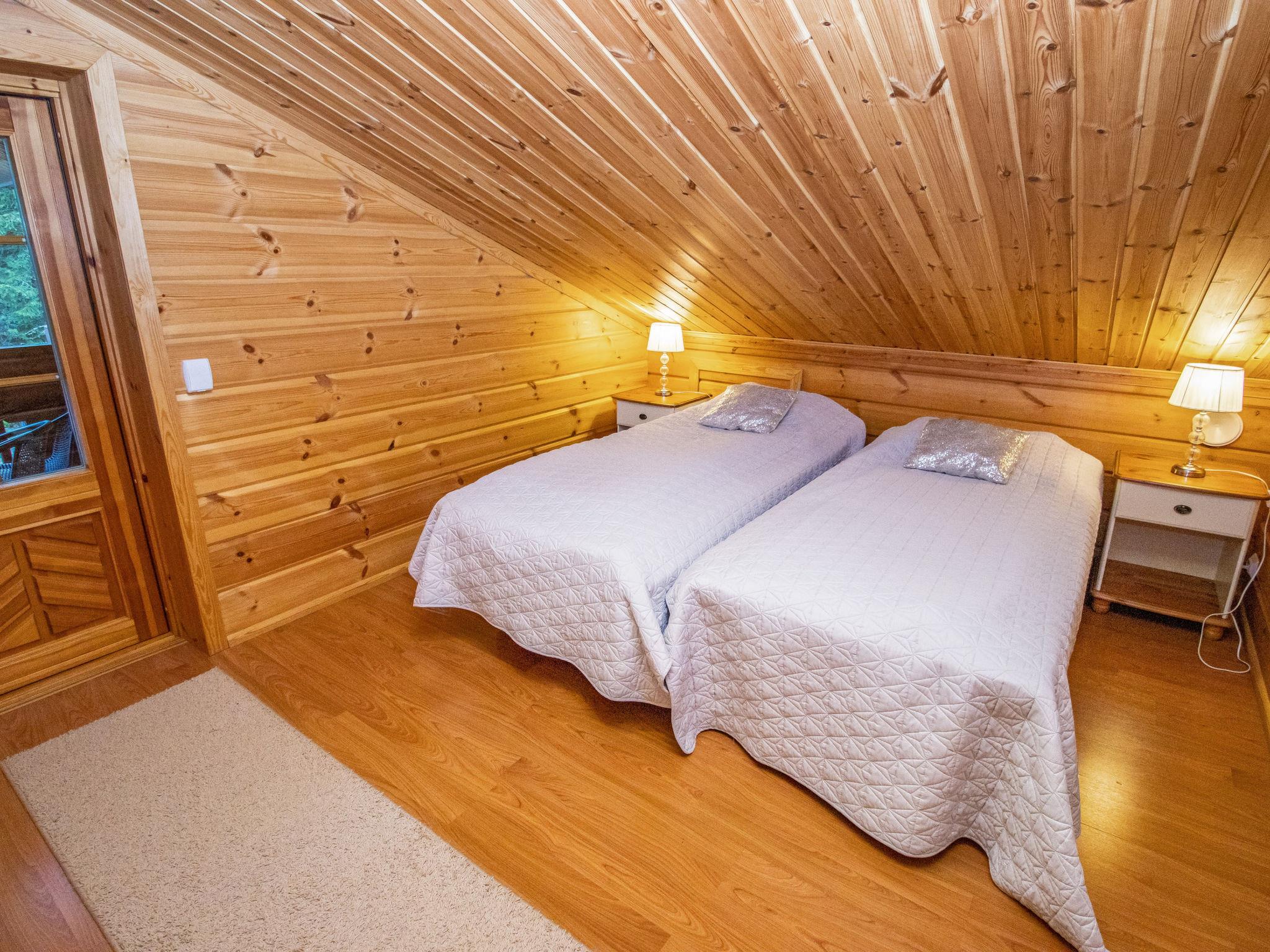 On the ground floor of the cabin, there is a kitchen, a spacious living room and two bedrooms. One bedroom has a double bed, while the beds in the second bedroom can be placed together or kept separate. A separate WC and a dressing/utility room are also located on the ground gloor, with direct access to a private terrace for cooling off after the sauna. The dressing room also has its own refrigerator.