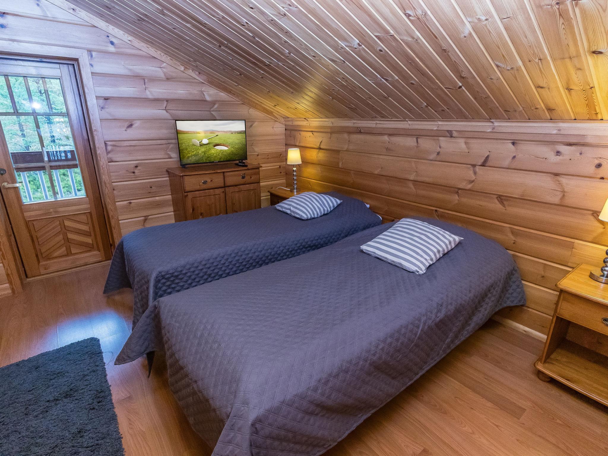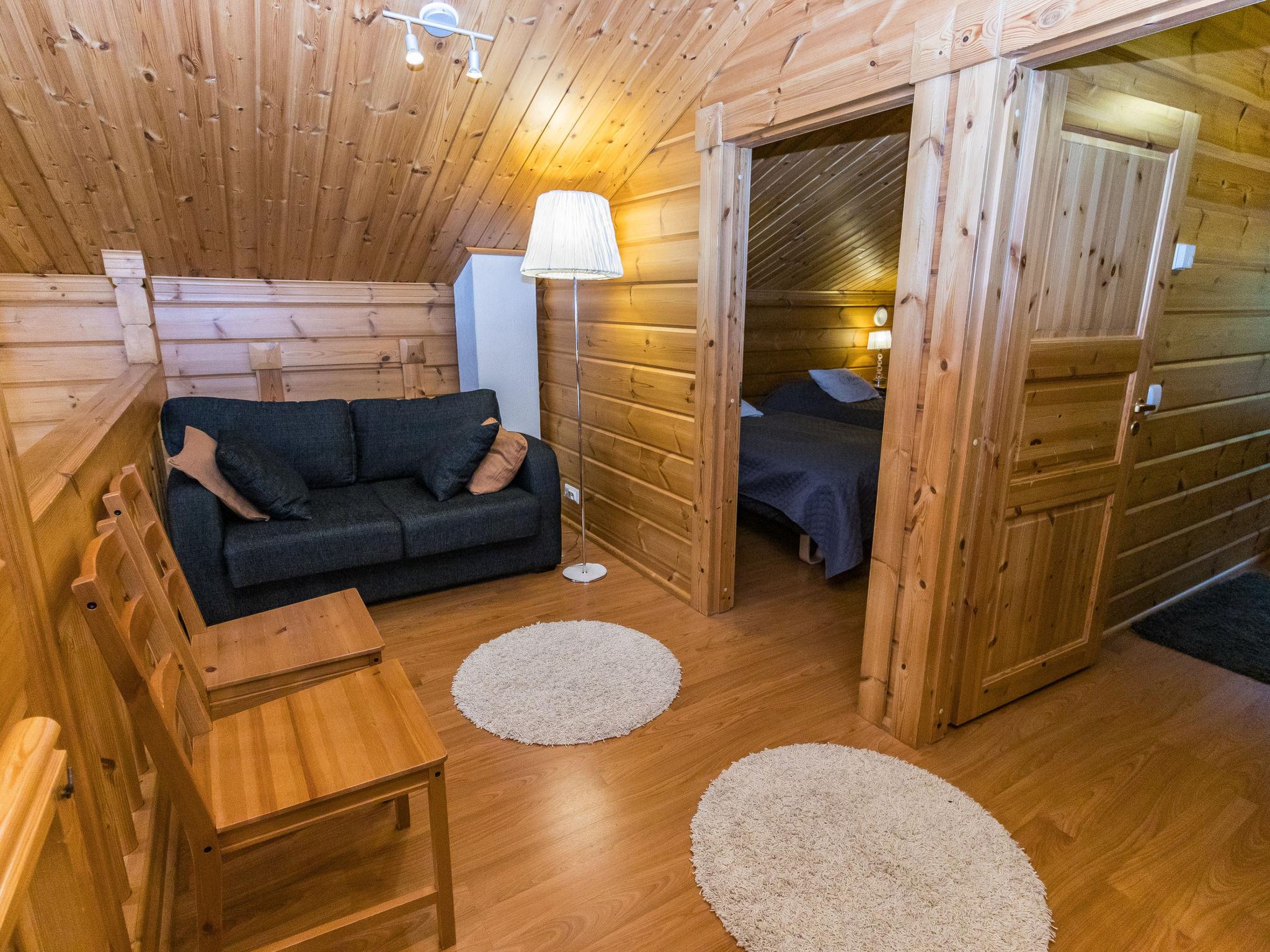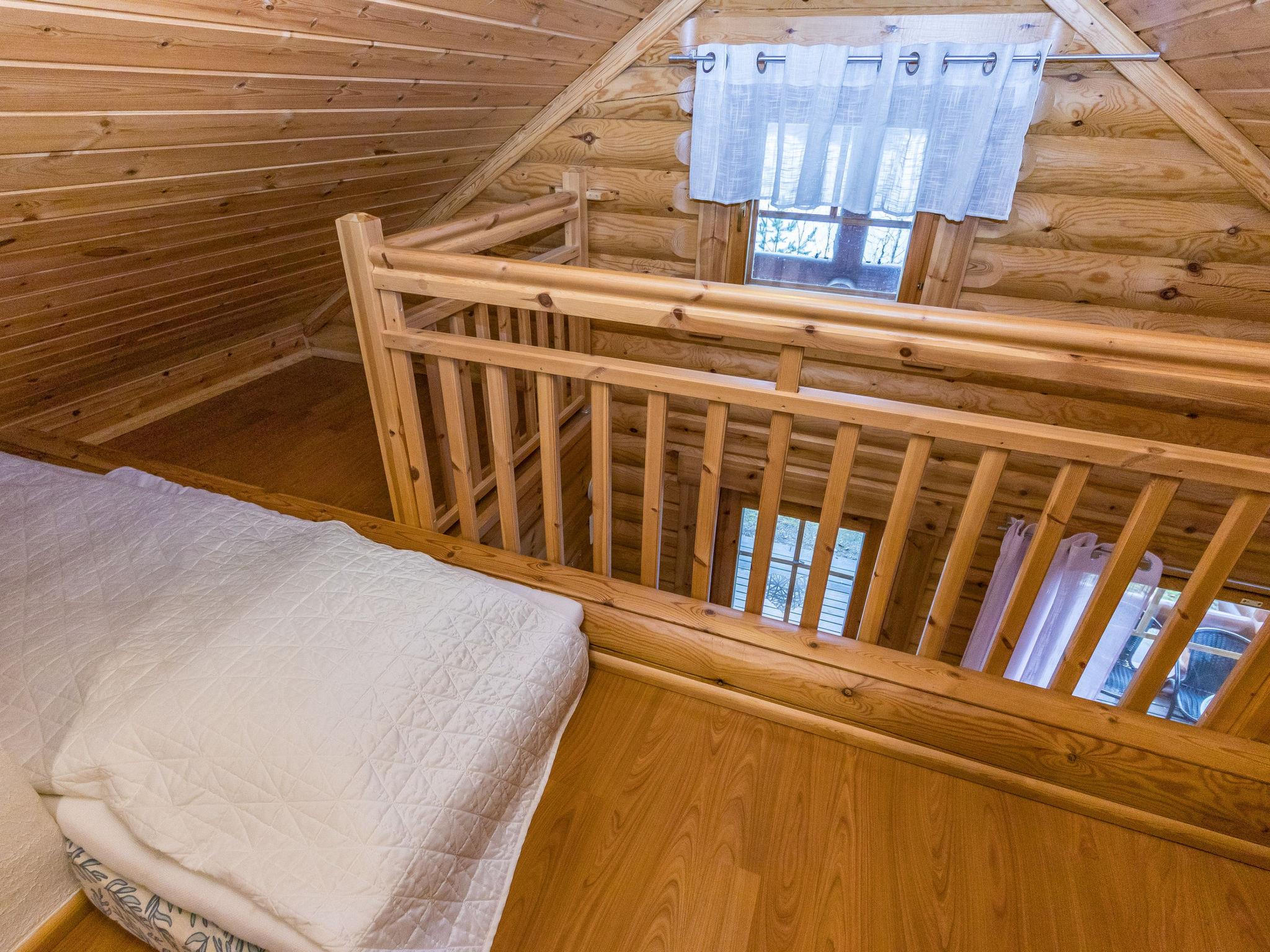 The main cabin’s ground floor features a kitchen, a spacious living room and a bedroom with a double bed. There is also a separate WC, an electric sauna with instant ready sauna stove, a washroom with two showers, and a dressing/utility room with direct access to a terrace for cooling off