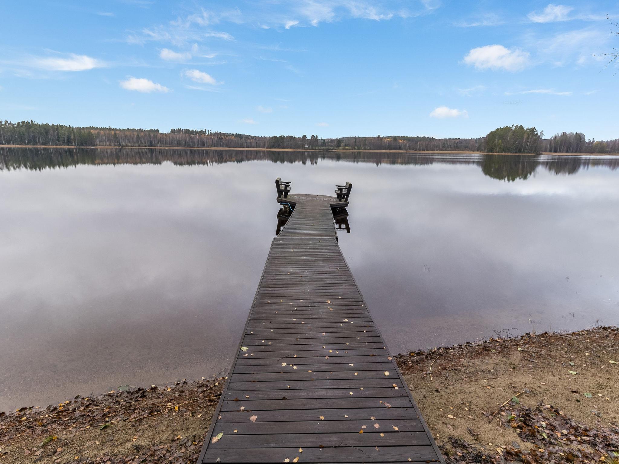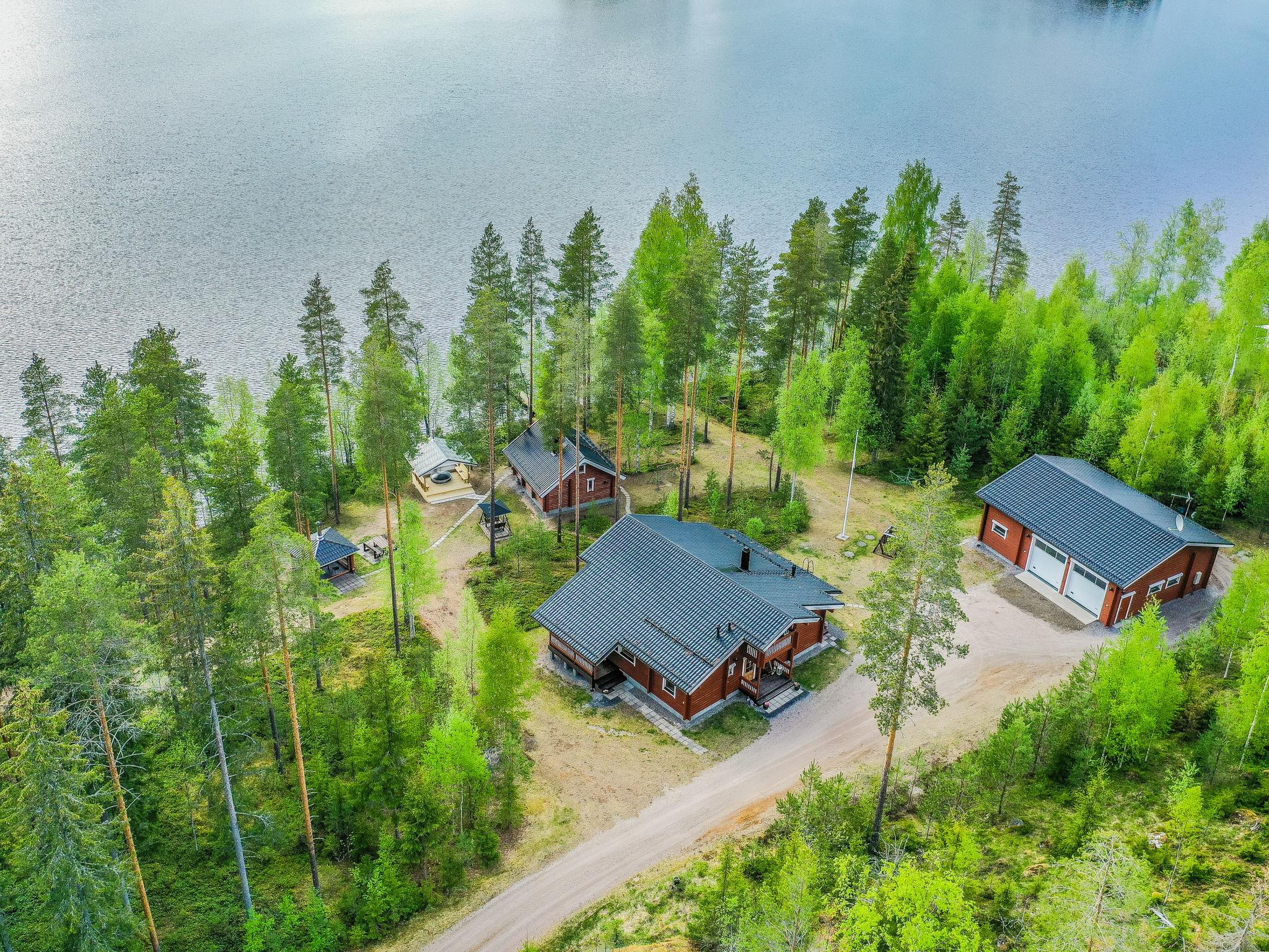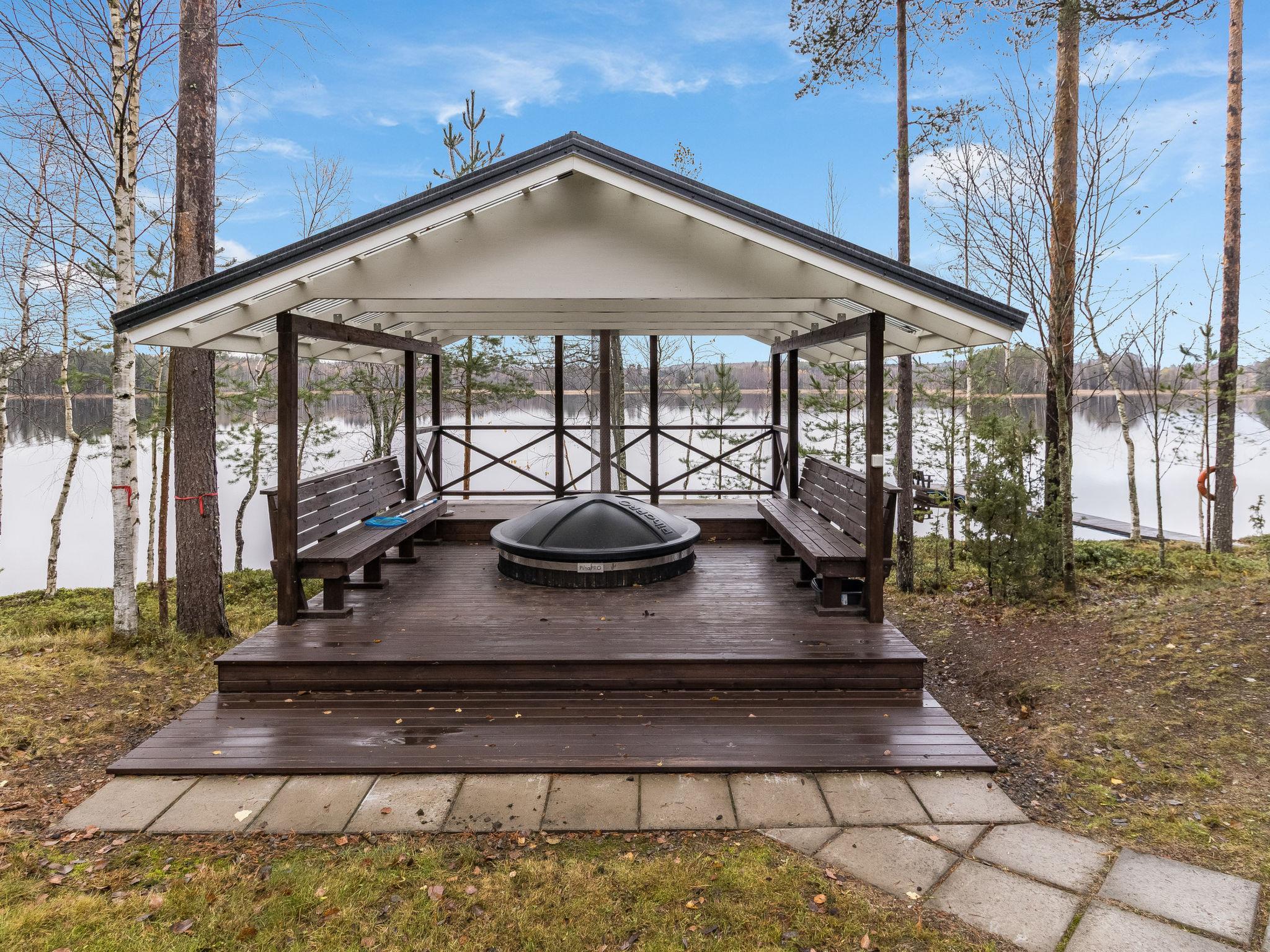 Down by the shore stands a 25 m² sauna cabin featuring a wood-heated sauna, shower and WC. The building also includes a breakfast kitchen, a sofa bed, and a loft with two separate beds. There are also a hot tub and a cozy grill shelter on the shore, which makes spending summer evenings even more enjoyable.