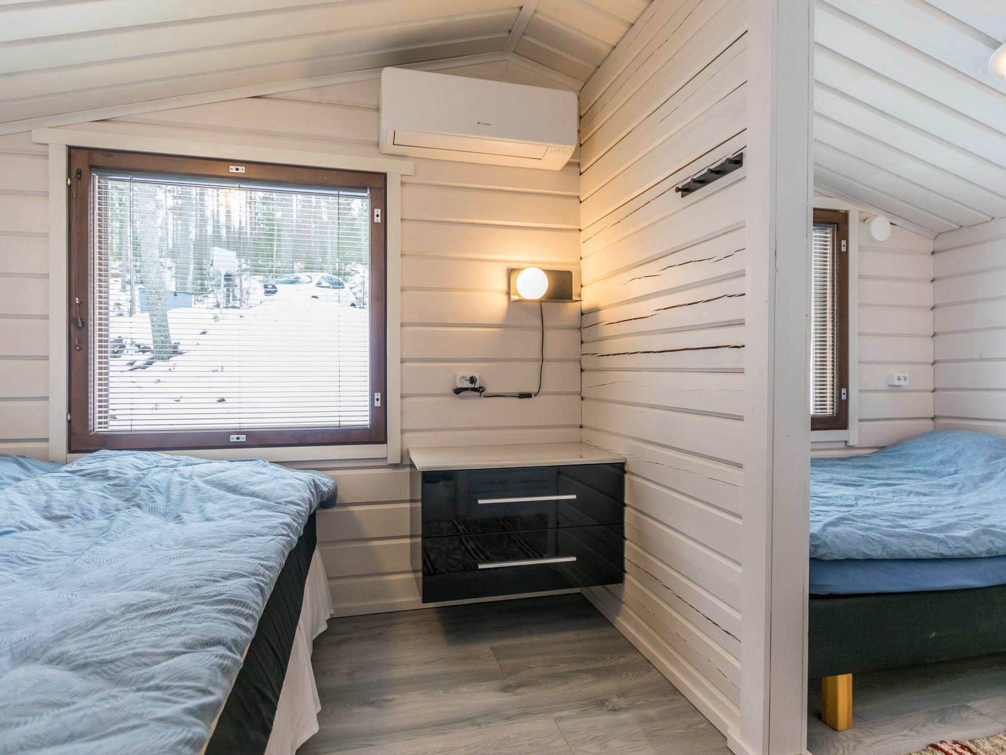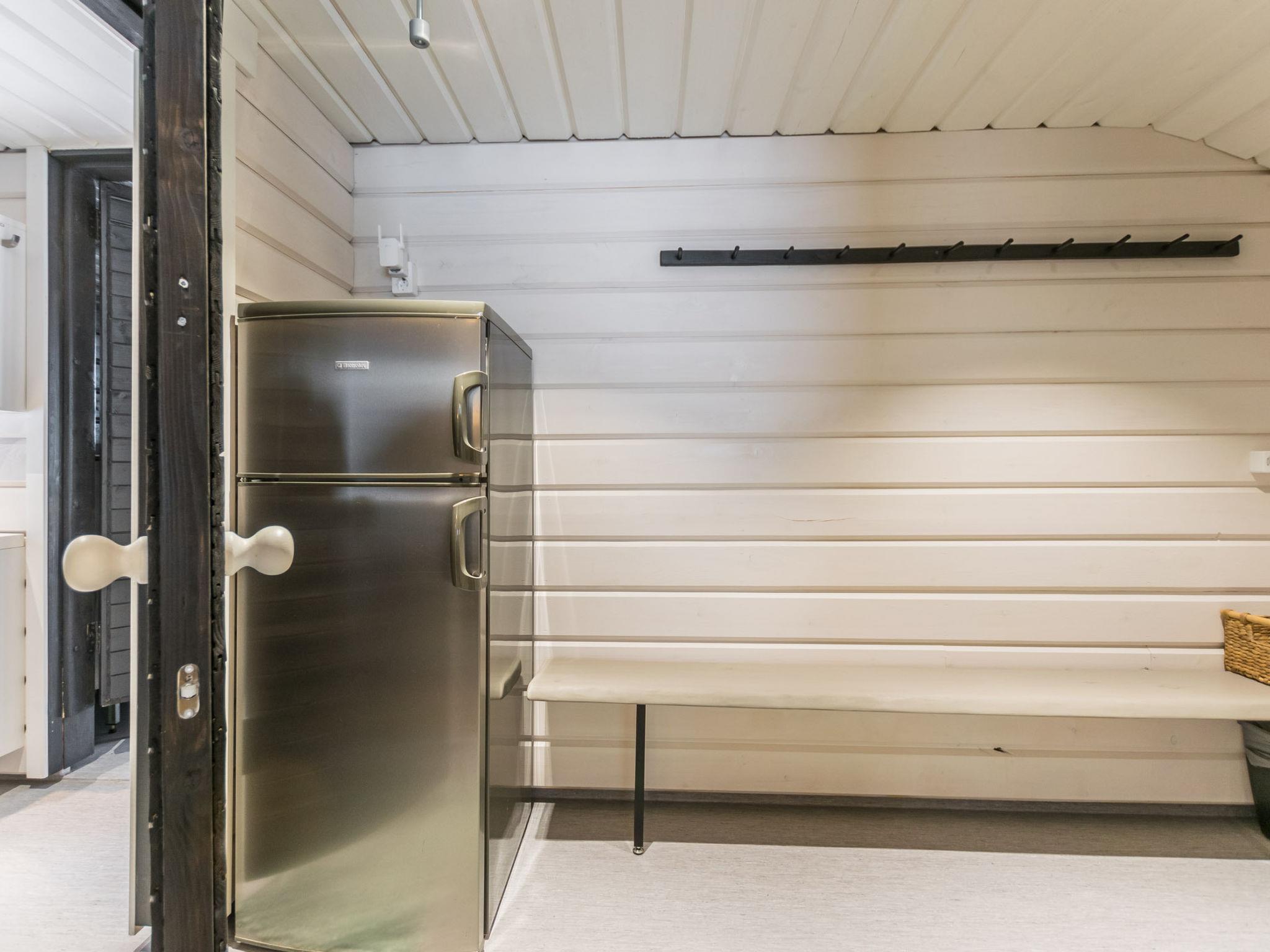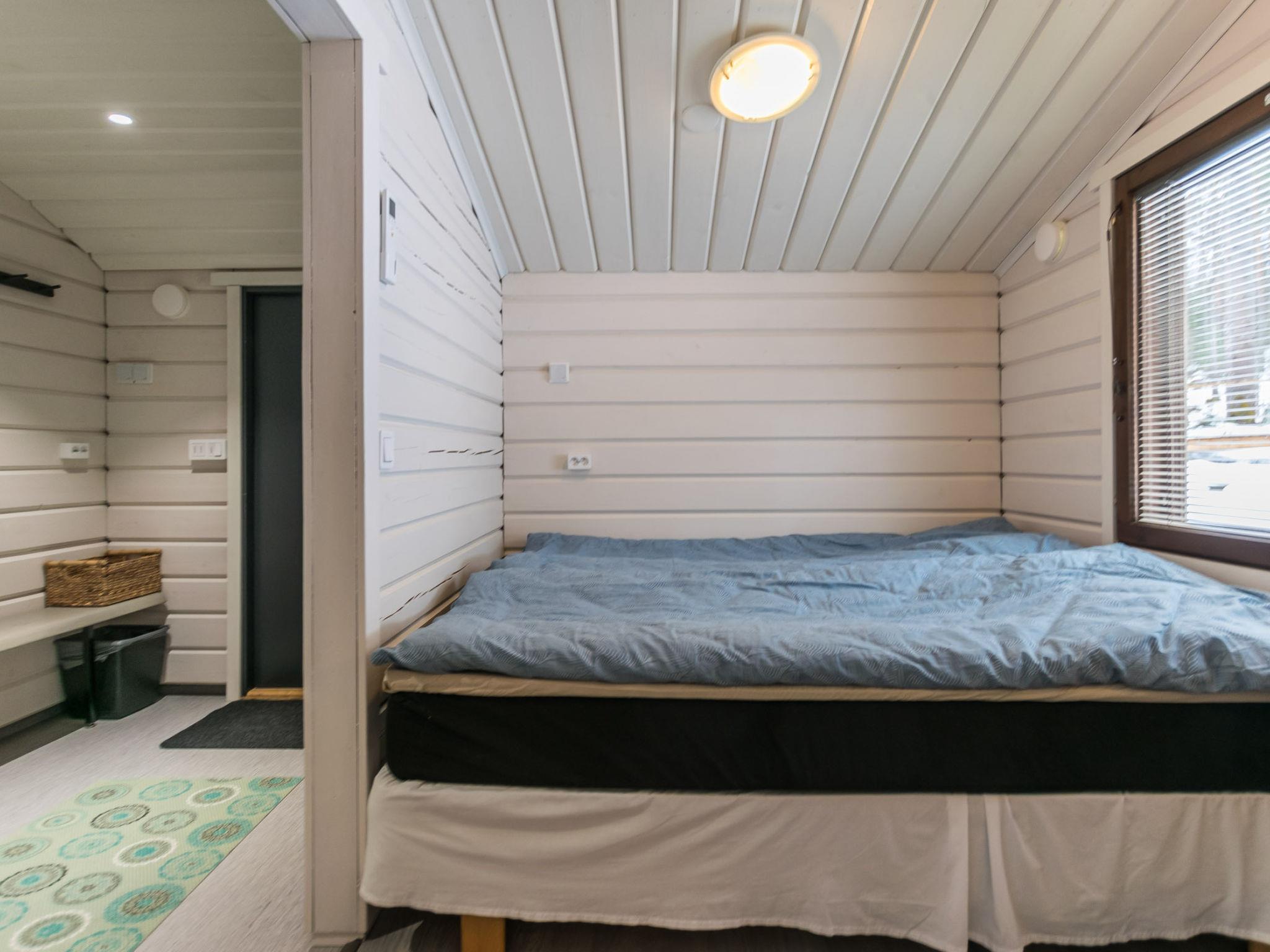 The separate 32 m² wood-heated sauna by the lake includes a dressing room with a fridge/freezer compartment. The washroom has a shower and hand basin. The sauna features a wood-heated stove, with dark walls and light benches creating a peaceful atmosphere. Windows provide a lovely view of the lake and yard. The lakeside sauna includes two sleeping areas – one with a double bed, the other with a 120 x 200 cm bed, and an air source heat pump. Bedside lights here also have USB-A ports.