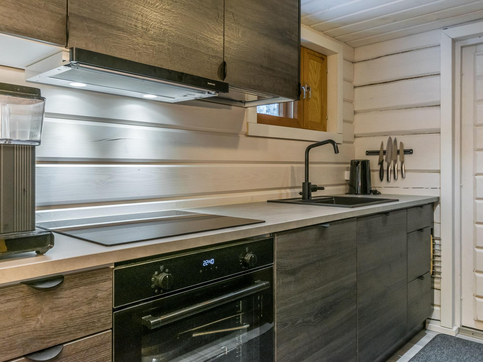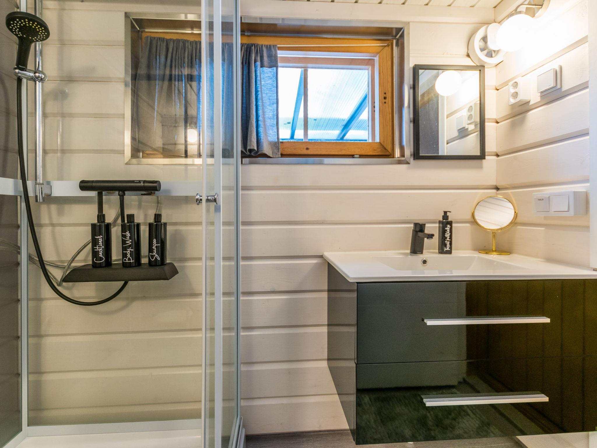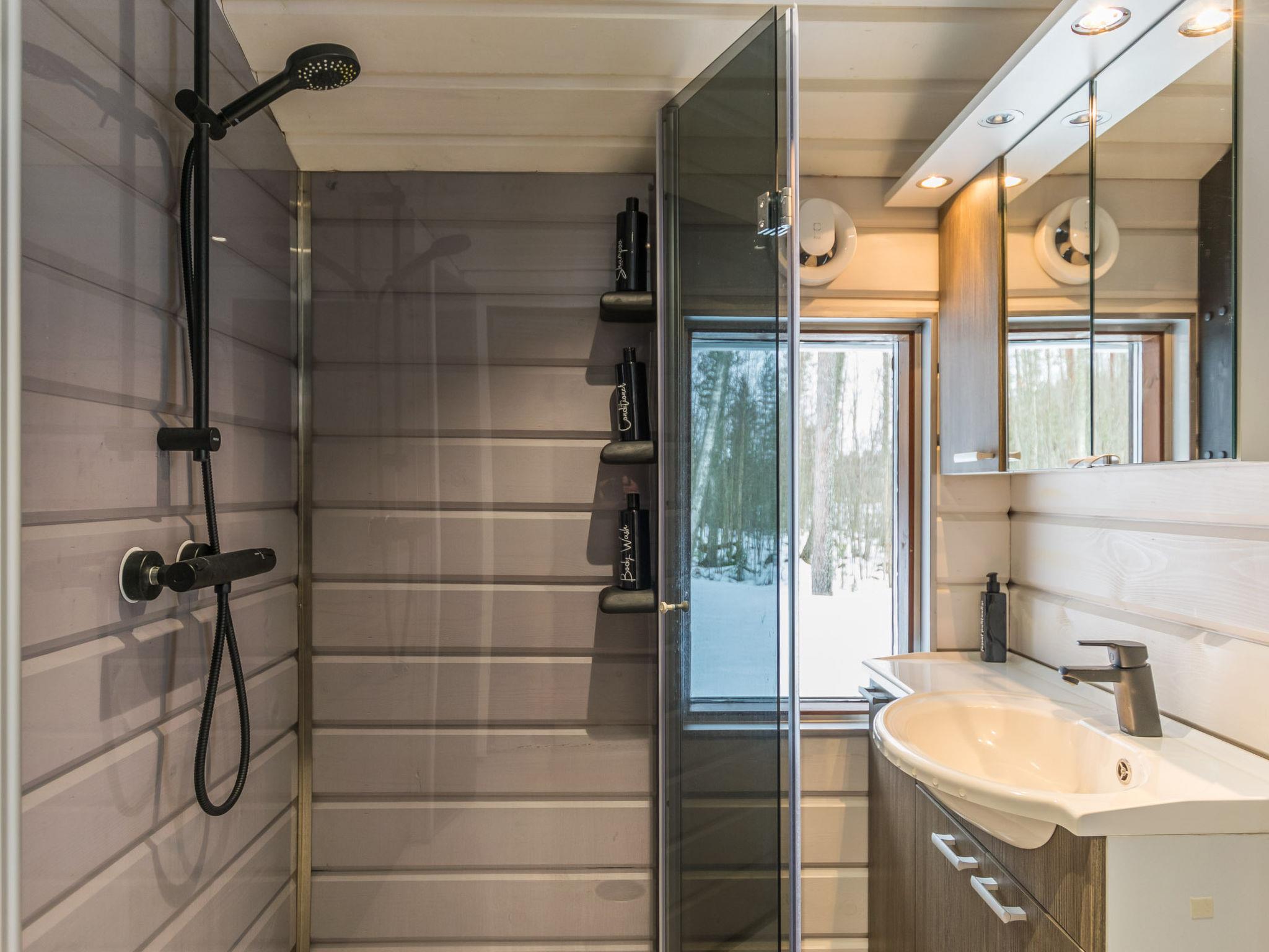 The separate 32 m² wood-heated sauna by the lake includes a dressing room with a fridge/freezer compartment. The washroom has a shower and hand basin. The sauna features a wood-heated stove, with dark walls and light benches creating a peaceful atmosphere. Windows provide a lovely view of the lake and yard. The lakeside sauna includes two sleeping areas – one with a double bed, the other with a 120 x 200 cm bed, and an air source heat pump. Bedside lights here also have USB-A ports.