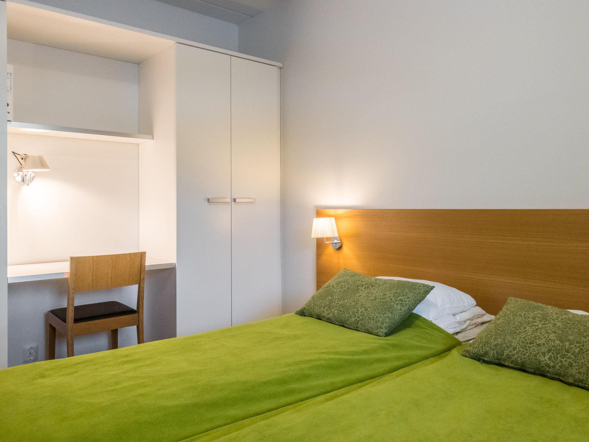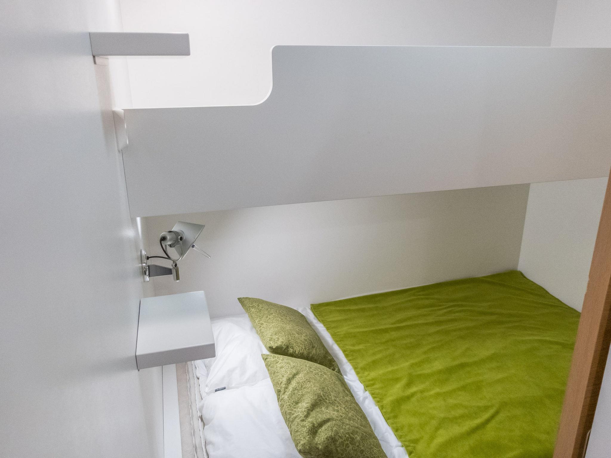 The apartment features an open kitchen, a bedroom with two beds, and a bunk bed in the alcove, with the lower bed being 120 cm wide. Sauna, a shower room, a separate WC, and a glazed balcony. Moreover, the bedroom is equipped with a workspace.