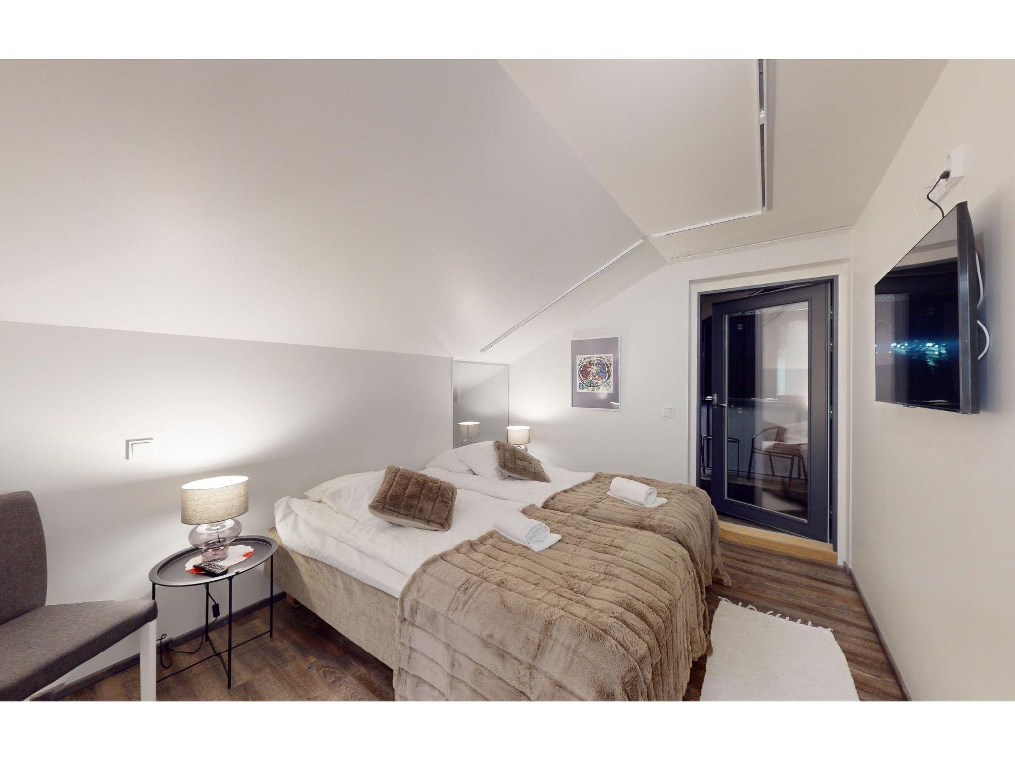 On the upper floor, there is another bedroom with convenient access to another glazed balcony. The bedroom is equipped with two beds, each 100 cm wide. In the hallway, there are two additional beds and a sofa bed, ensuring comfortable nights for all guests. The upper floor also has its own bathroom, allowing everyone to prepare for the day's activities in peace.