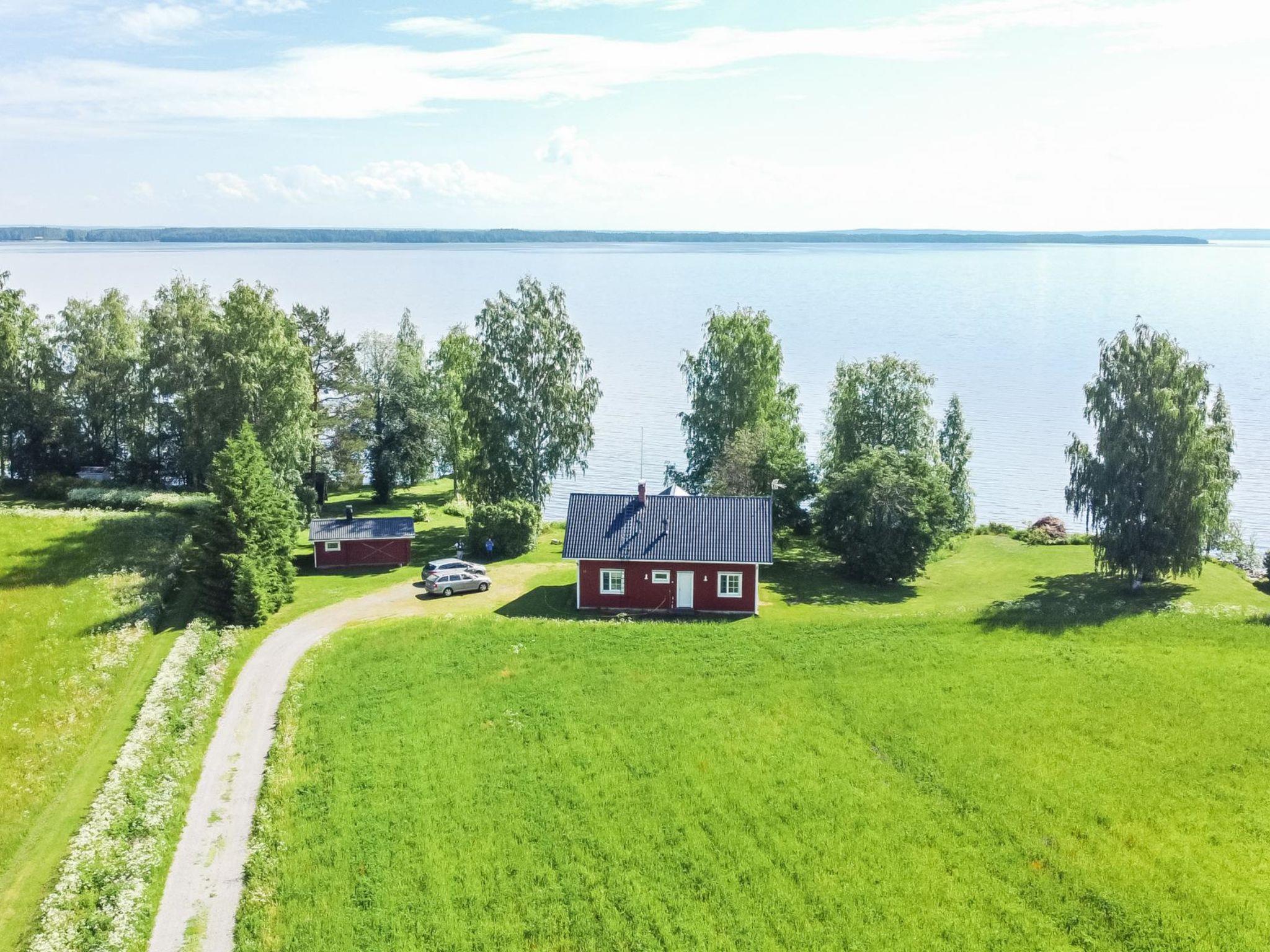 The cabin is located on a spacious, sunny lot, surrounded by fields. At this cabin, you can enjoy peace and privacy, with the nearest neighbor approximately 100 meters away. The grassy yard offers a spectacular view of the large expanse of Lake Lappajärvi. The cabin's own beach has a shallow sandy bottom that deepens quickly. There is a wooden pier (7,6 meters long) and a private rowing boat.