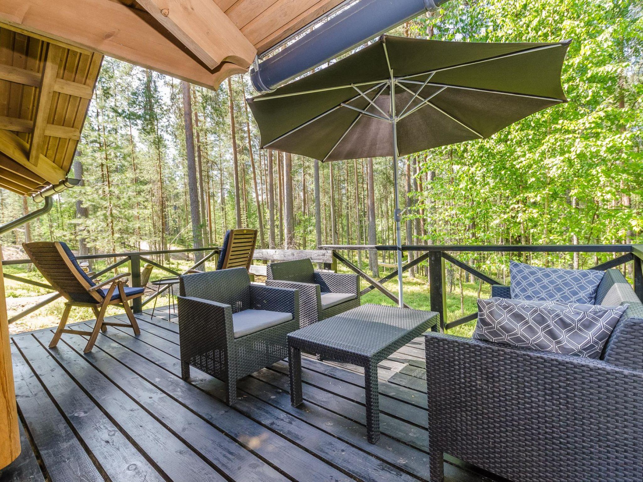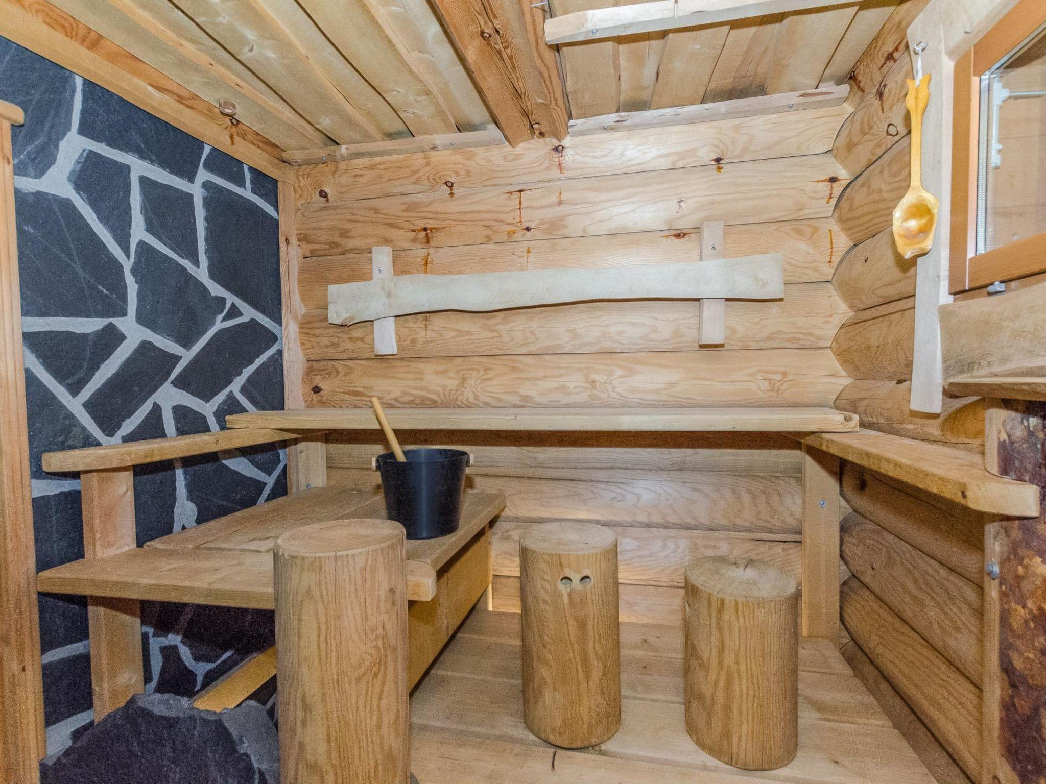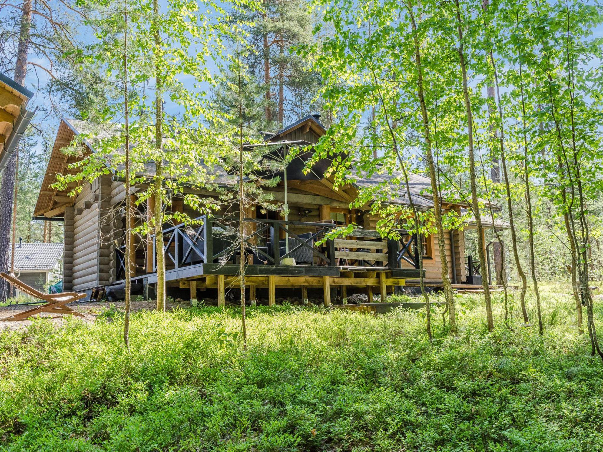 Log cabin 2006. Area 80 m² + loft, on the ground floor living room/kitchen (sofa bed for 2 persons), bedroom with a double bed, 2 beds in the loft, sofa bed in the dressing room, washroom, unique wood-heated sauna, 2 terraces, ski storage, and carport. The terrace faces the forest and there is an electric grill and a fixed grill in the yard.