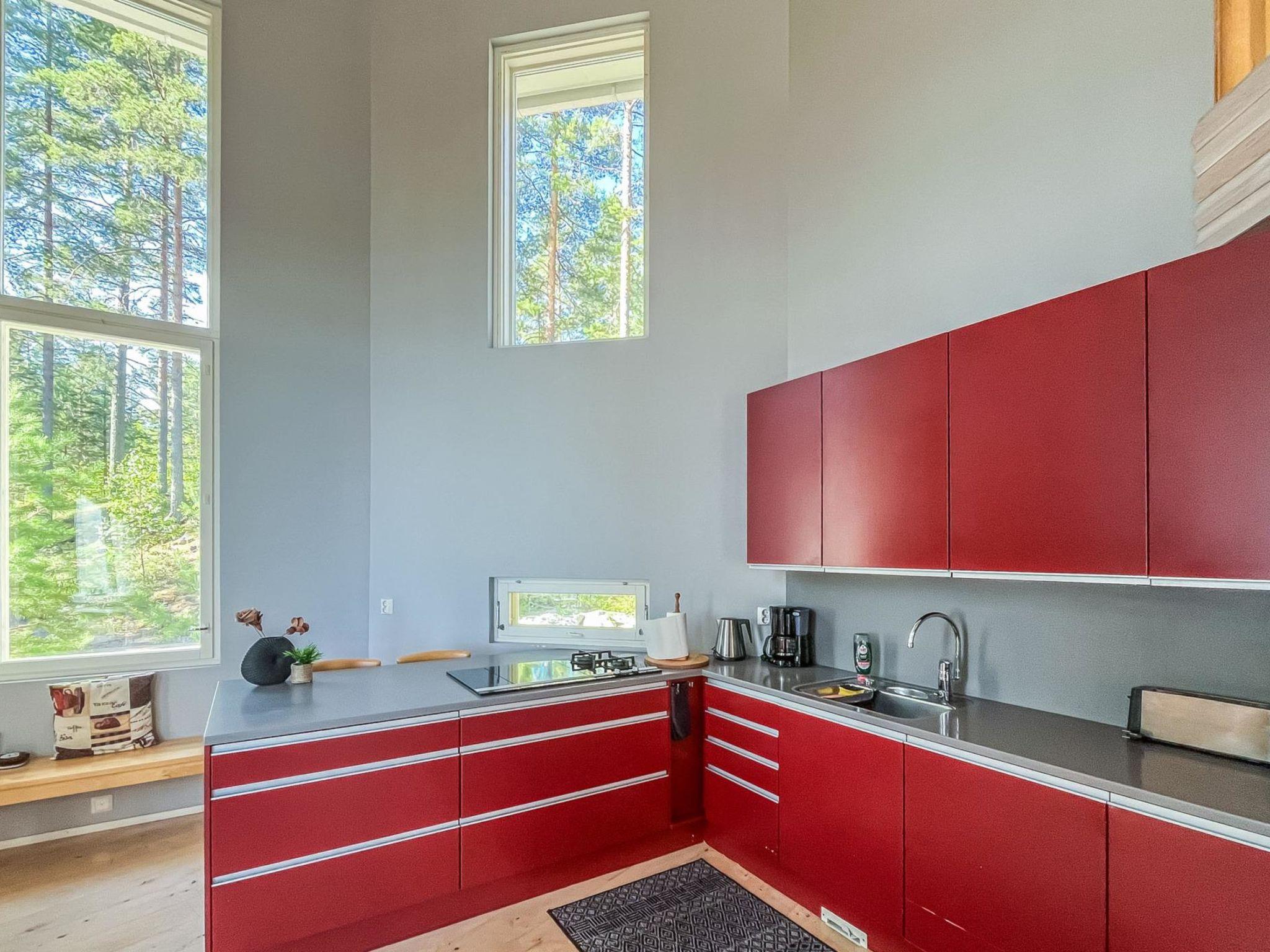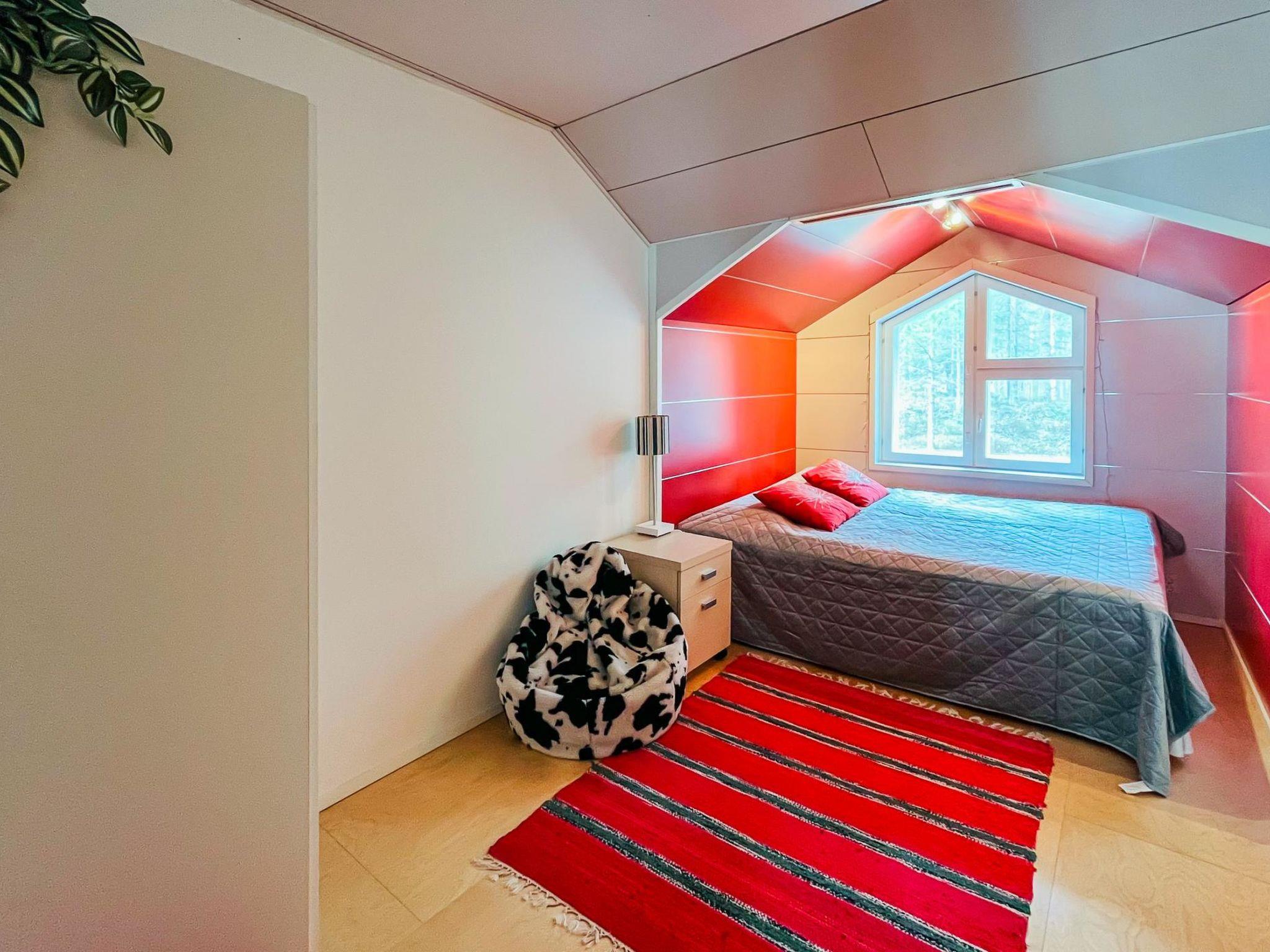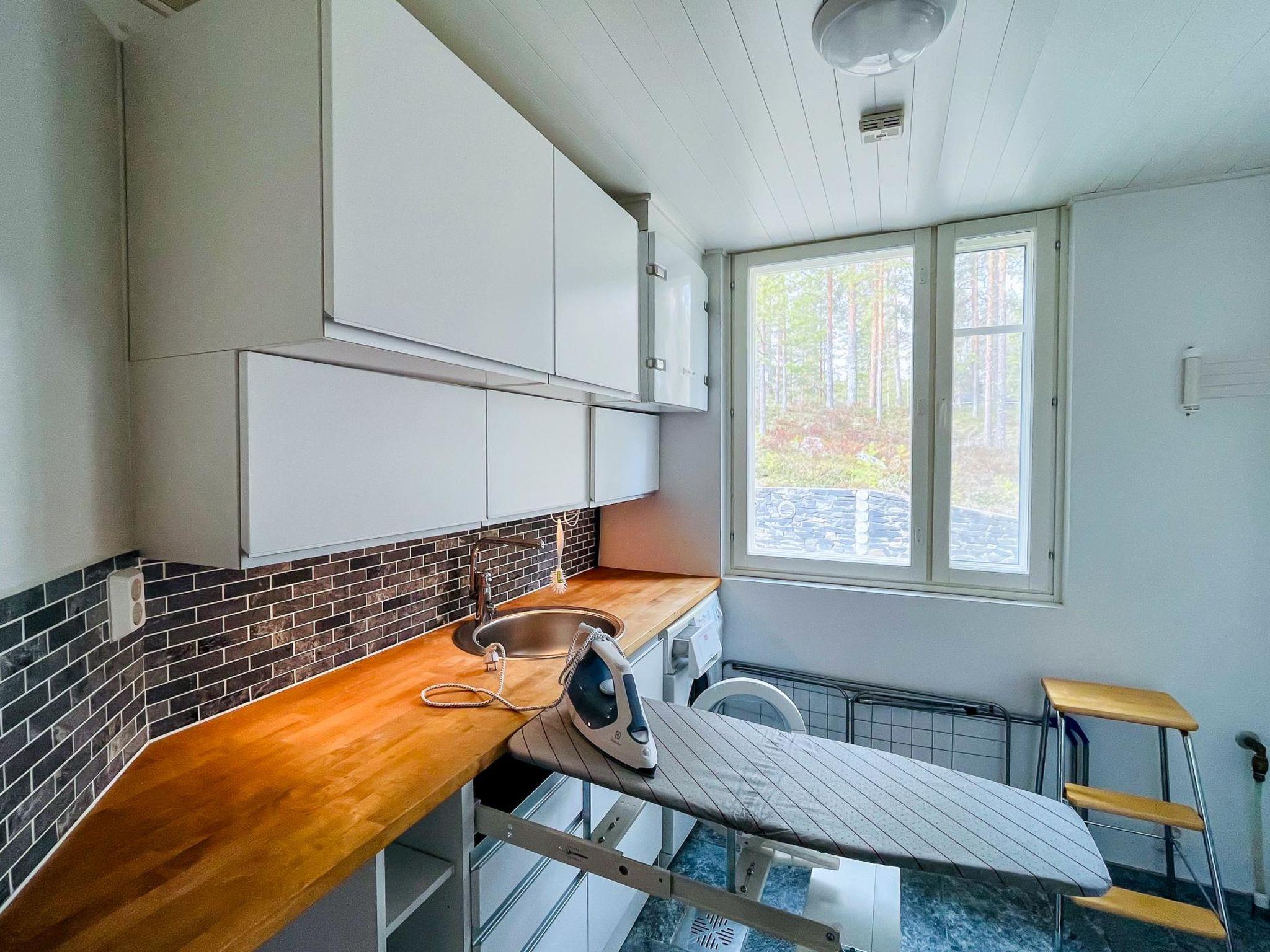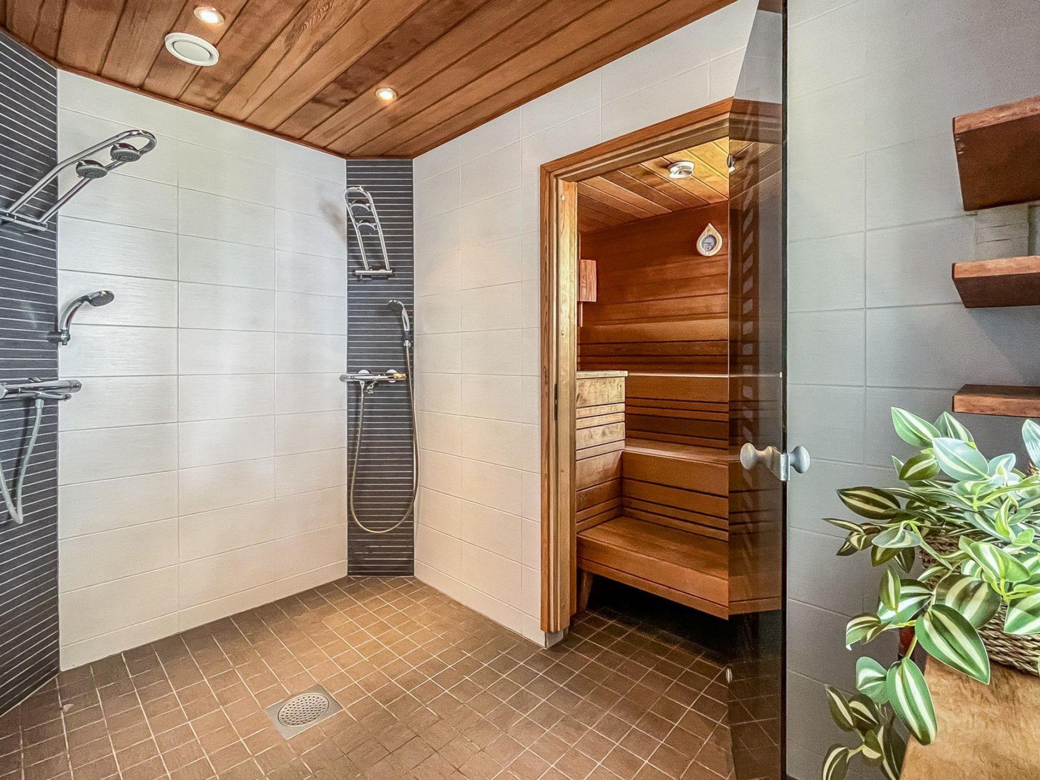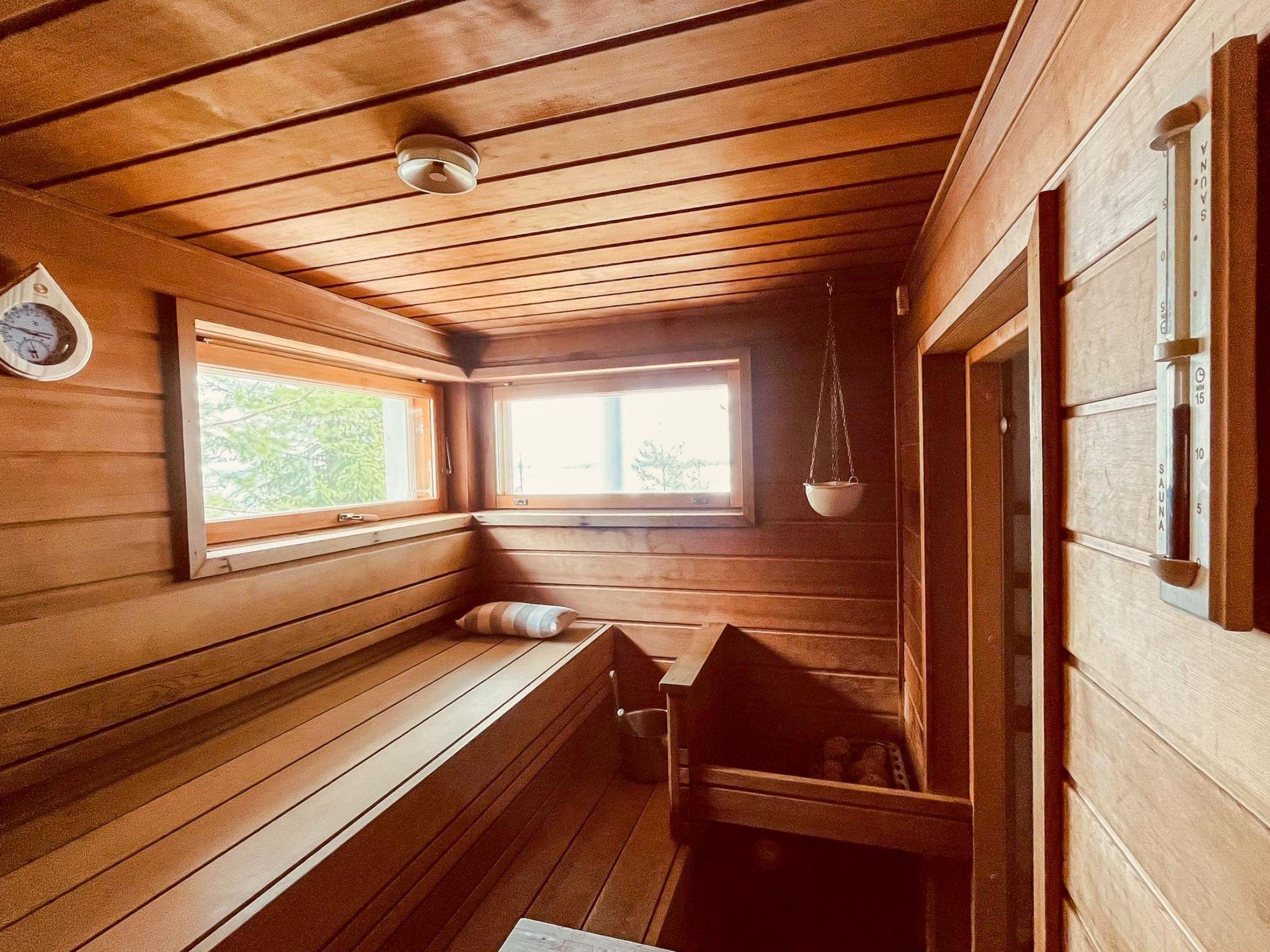 The well-equipped kitchen has 2 induction hobs, 2 gas burners, and an electric oven. For enthusiastic cooks, there is also a wood-fired baking owen by the fireplace, which you can use also as a pizza owen. The living/dining area has a smart TV, which can be used to receive Finnish TV channels as well as various streaming services and media libraries. The bedroom on the ground floor has 2 single beds and the three bedrooms on the upper floor each have 2 beds. The beds on the upper floor are set up as double beds but can also be separated and used as single beds. All bedrooms are equipped with a wardrobe. Upstairs there is also a lounge and a roof balcony with breathtaking views over the Pielinen. The TV upstairs is not connected to the terrestrial antenna, but has HDMI connections so you can connect the vacation home's Blu-ray player or your own device (e.g., laptop, game console). 4G Wi-Fi is available in the house. The sauna is electrically heated and has windows with beautiful views of the forest and the Pielinen.