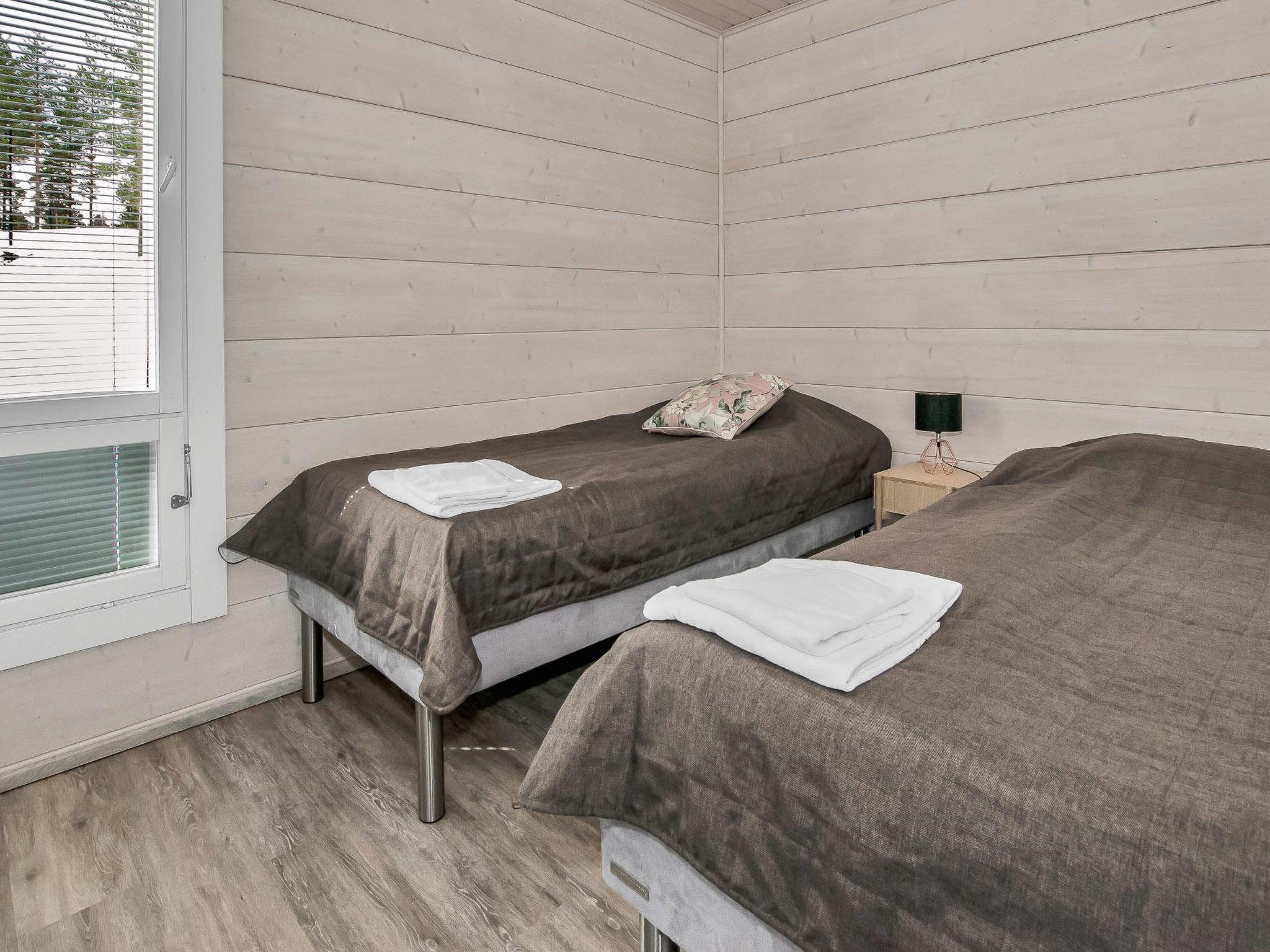 The villa features four bedrooms, each with two single beds. The spacious living room/kitchen provides ample space for socializing. There is a separate WC, and the washroom includes an electric sauna and two showers. A spacious terrace features a hydro massage bath, available for rent separately.