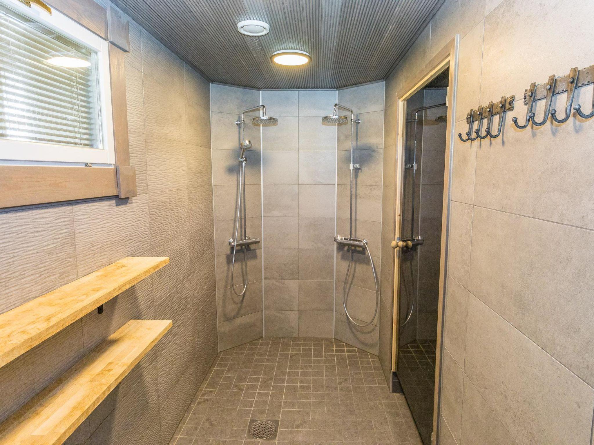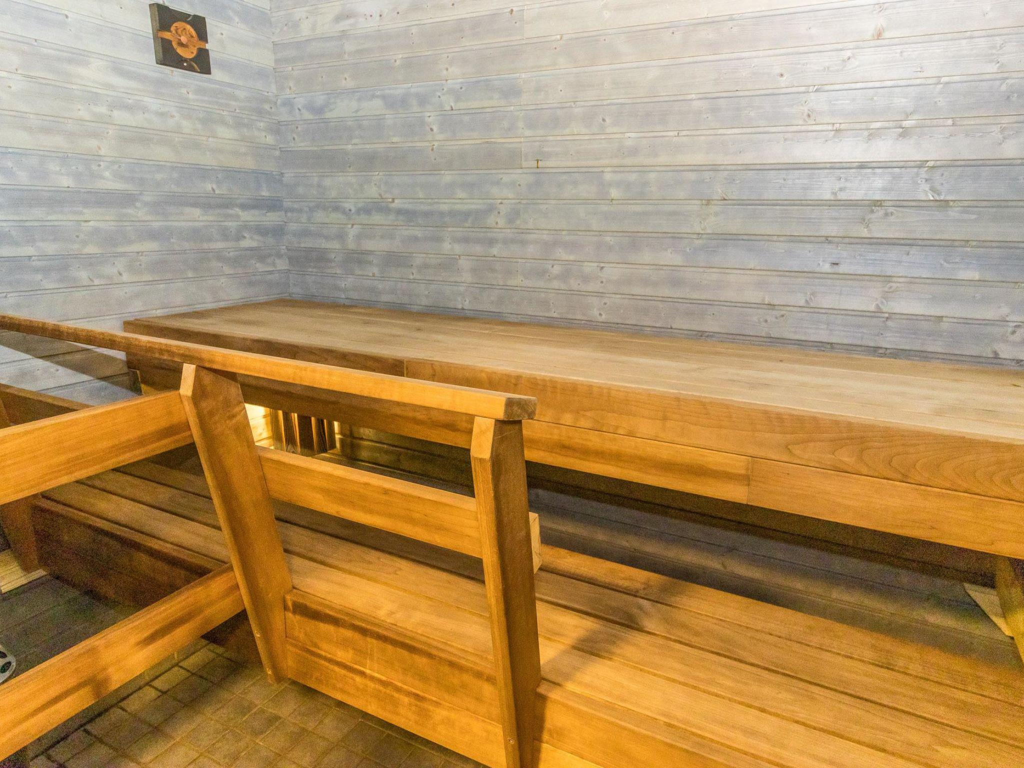 The villa features a living room/kitchen, two separate WCs, three bedrooms with six separate beds, and one bunk bed. Upstairs, there are three bunk beds. Downstairs you'll find sauna facilities, including a dressing room, two showers, and an electric sauna.