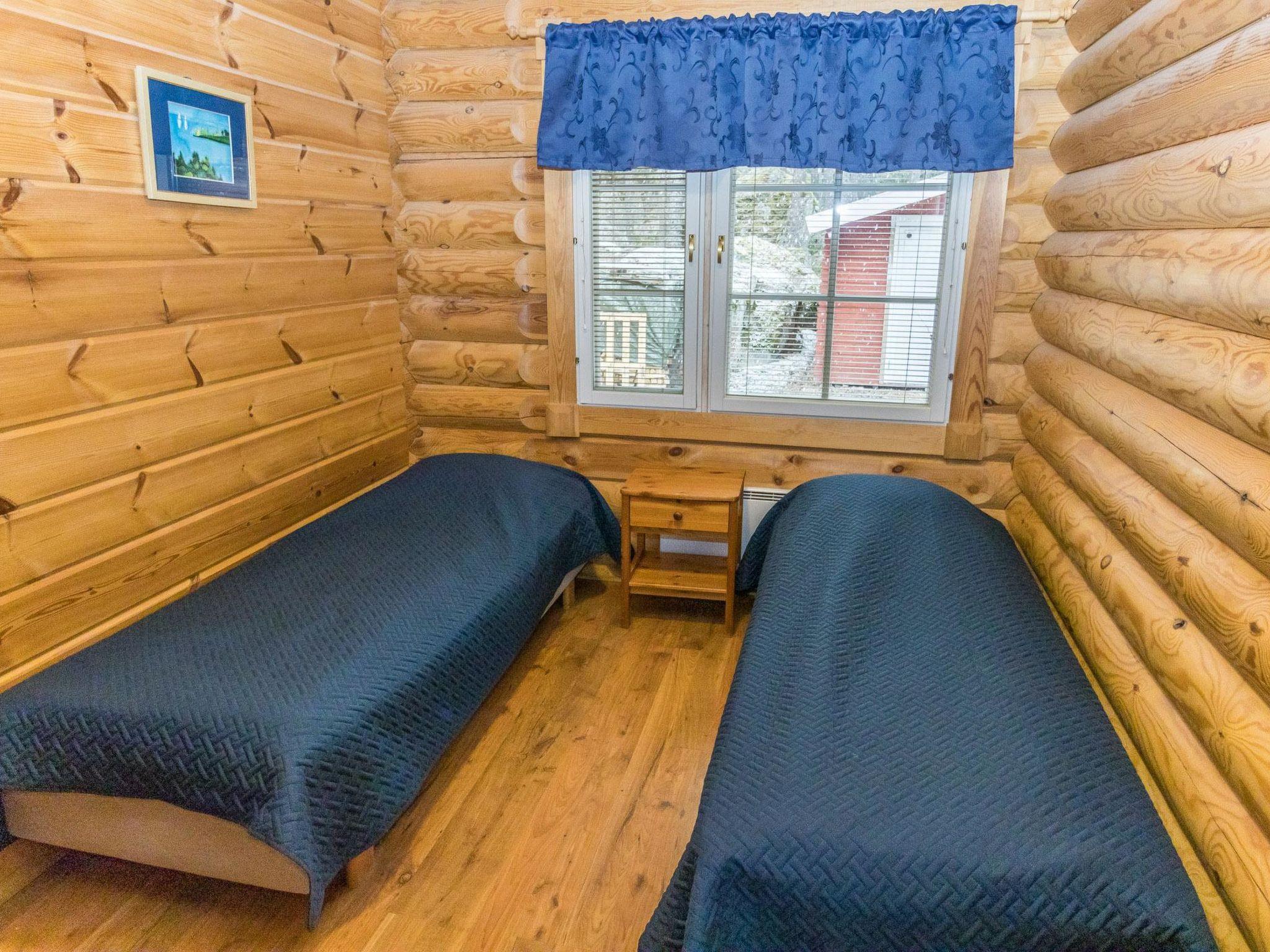 The separate round log guest cabin has a living room/kitchen, TV, separate WC, and two bedrooms—one with two separate beds and another with one bed.