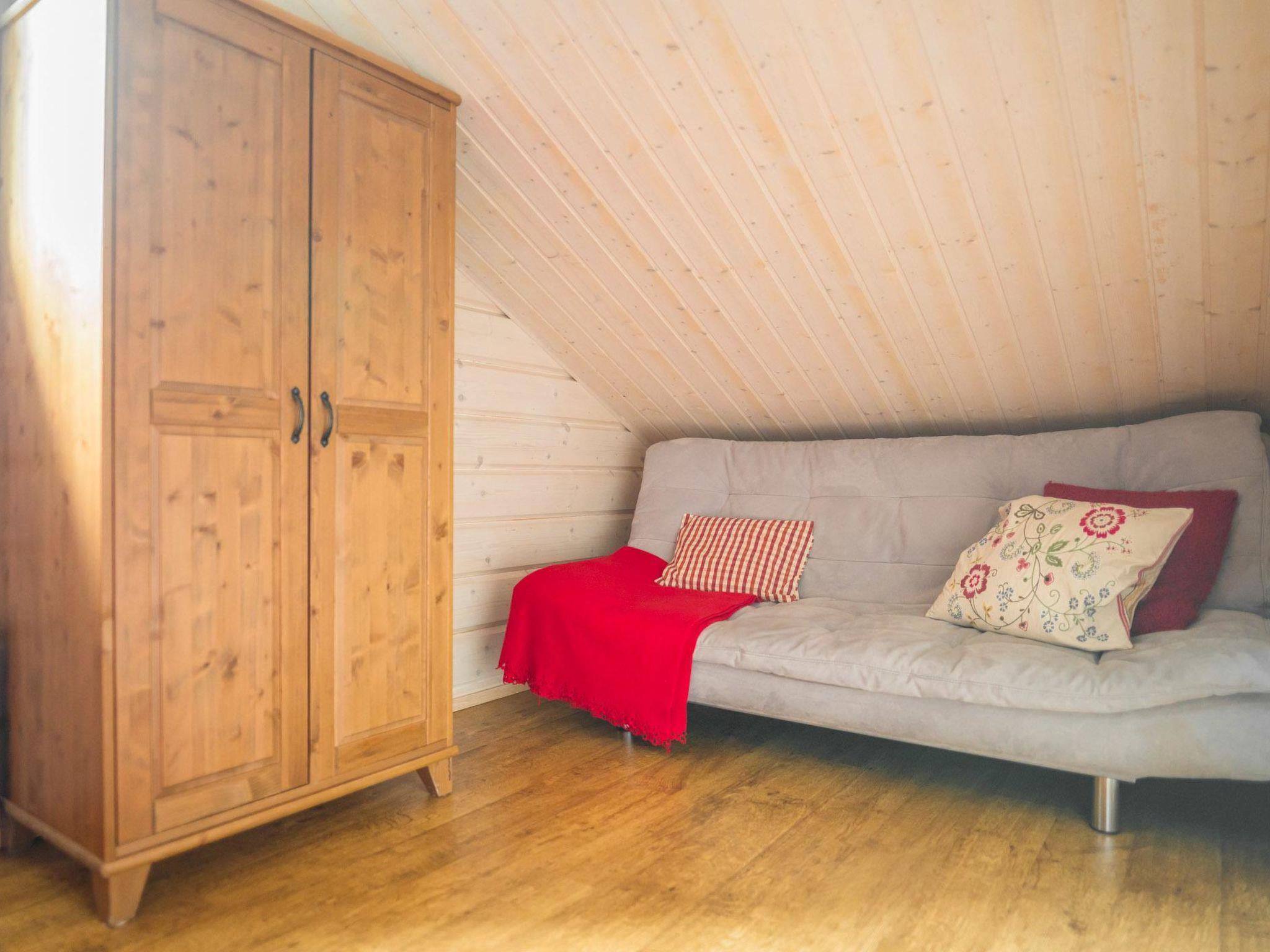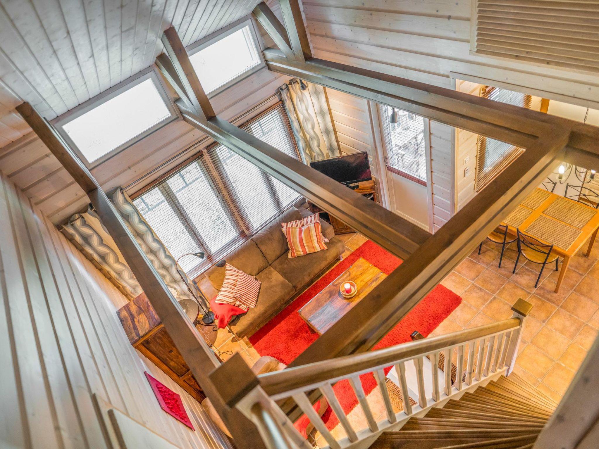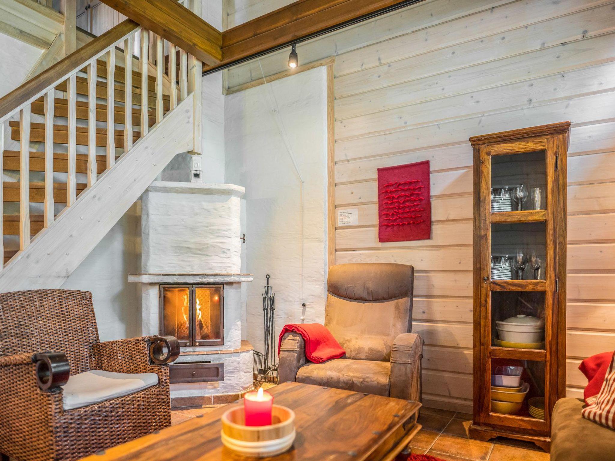 The premises of Asterix are on two floors, downstairs there is a living room + kitchen, where a fireplace creates an atmosphere, and an air-source heat pump is used for additional heating/cooling. The bedroom has 2 beds, plus a dressing room and TV, a bathroom and sauna, and a separate toilet, an entrance hall. The loft has a separate bedroom with 3 beds and a comfortable lounge area with 2 beds, and a fold-out chair bed as an extra bed. In addition, a spacious, furnished terrace, a charcoal grill in the summer, an outdoor storage room for storing skis.