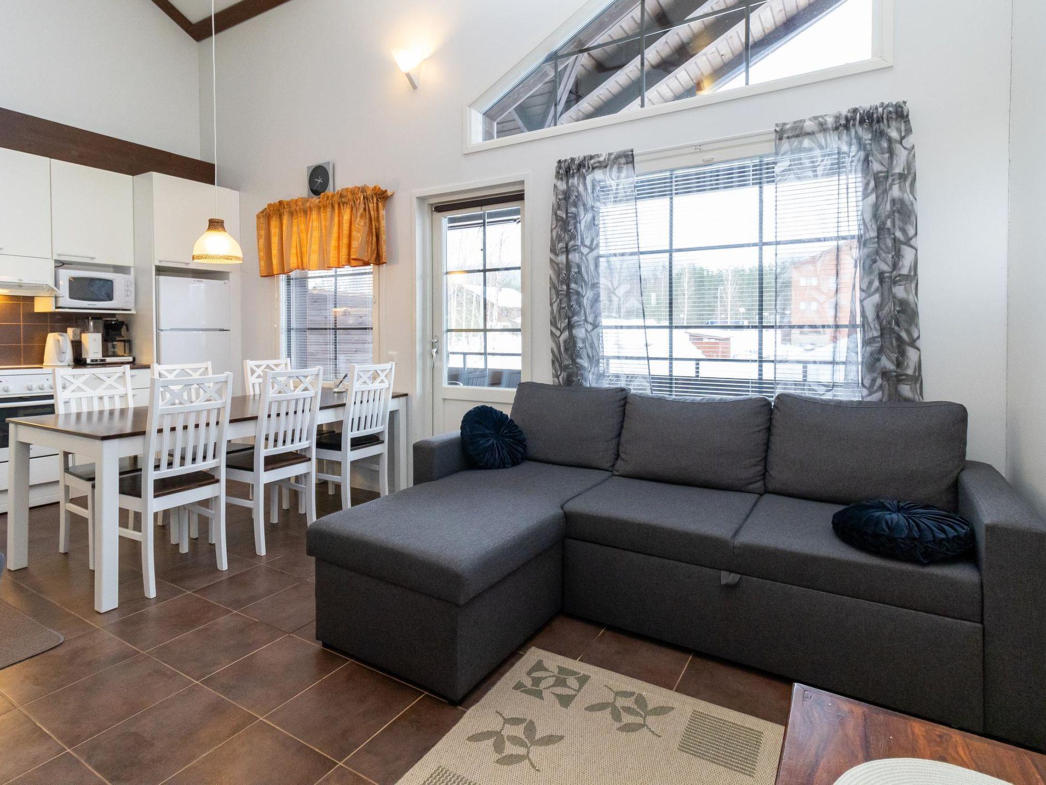 Living room/kitchen, bedroom with double bed. Washing room, WC, sauna (electric stove), hall and from balcony view to the slopes. Upstairs bedroom with 2 beds and a loft with 2 beds, on the upper floor there is another shower and toilet. Ski storage, 2-car plugs for cars. Internet Wifi 5G